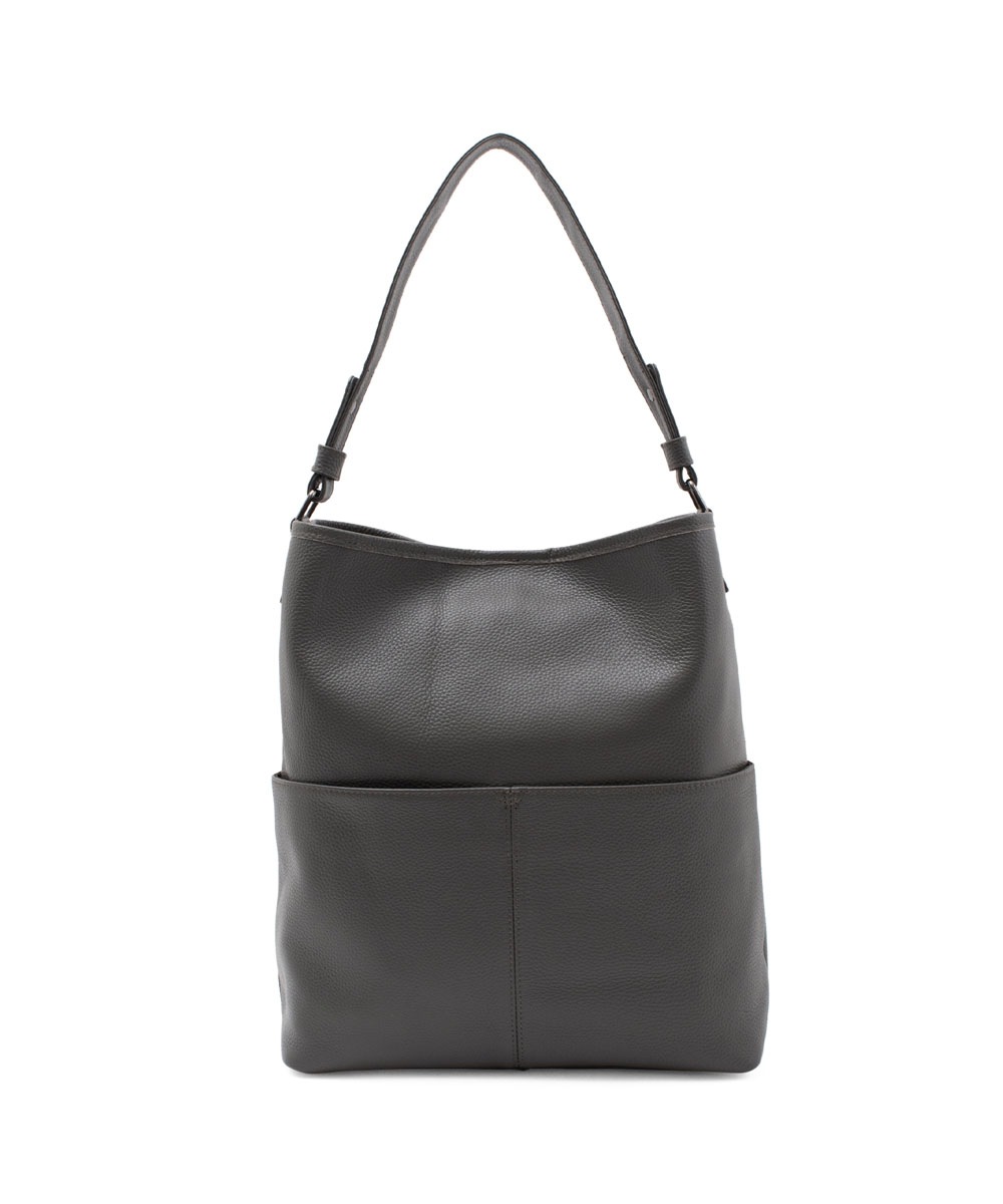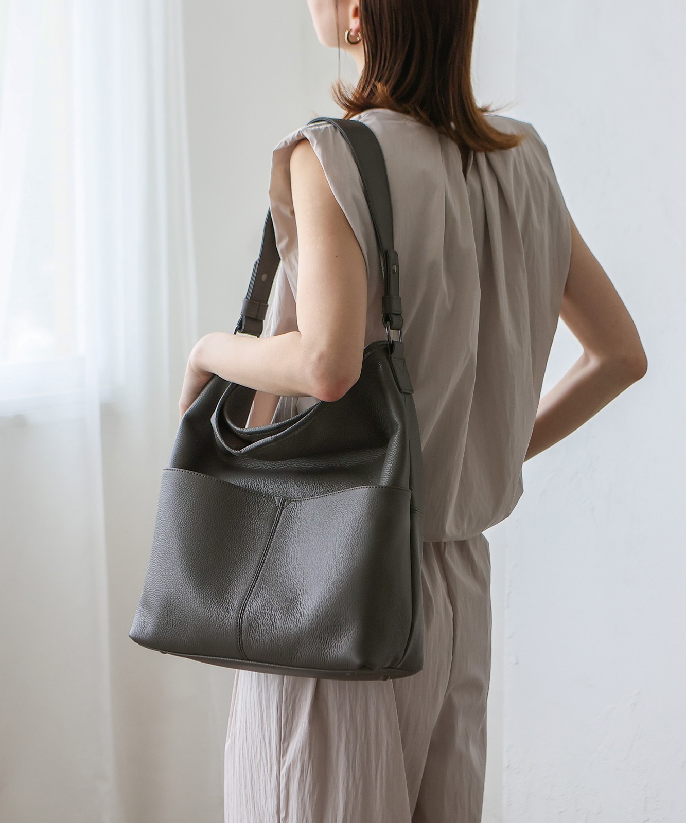 フロントの大きなポケットが特徴的な縦型の本革トートバッグ。