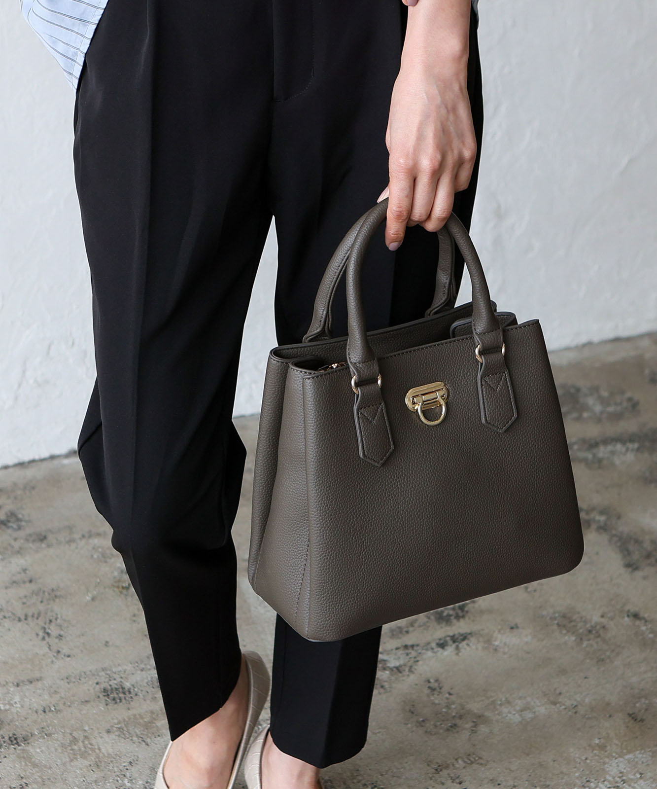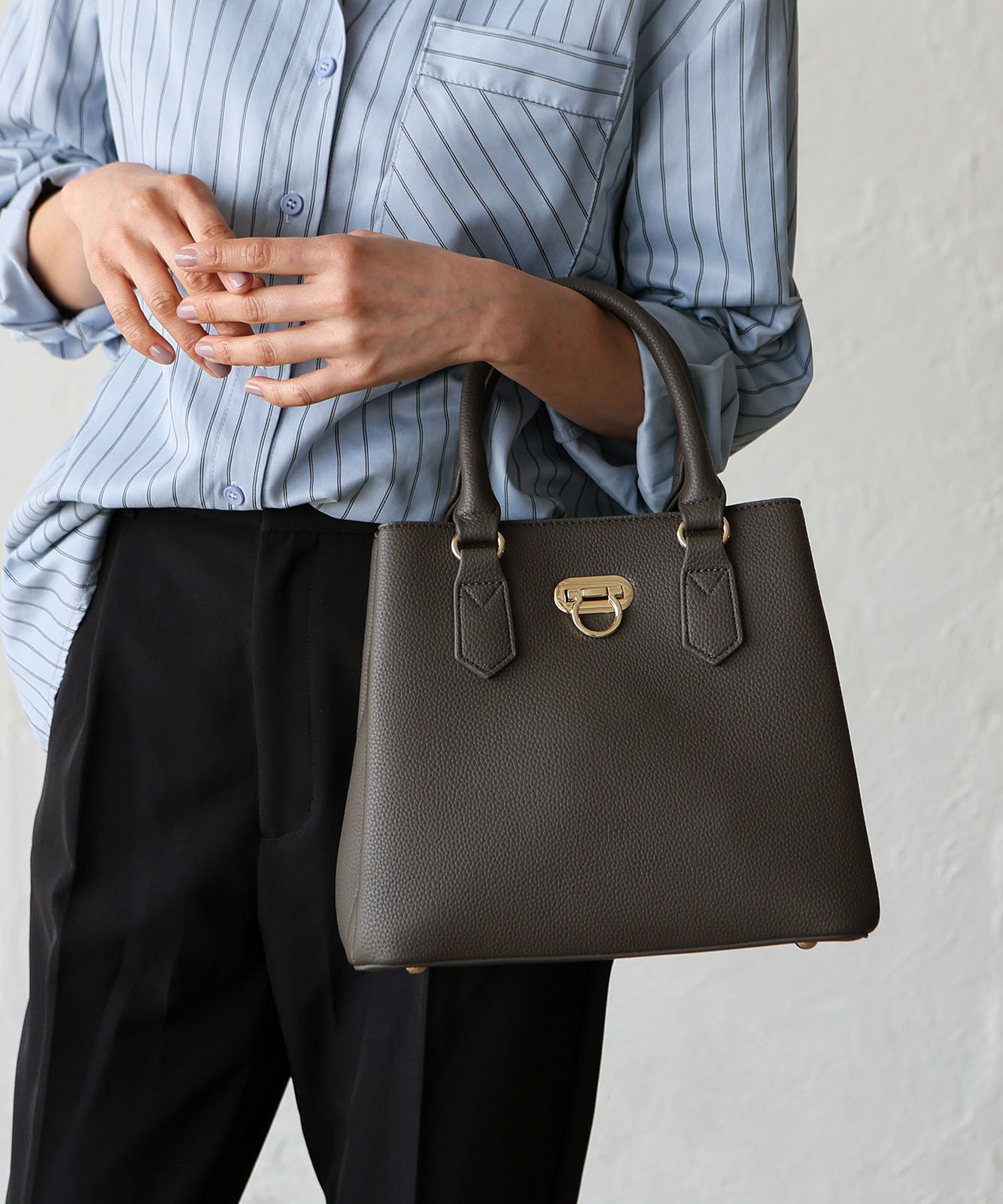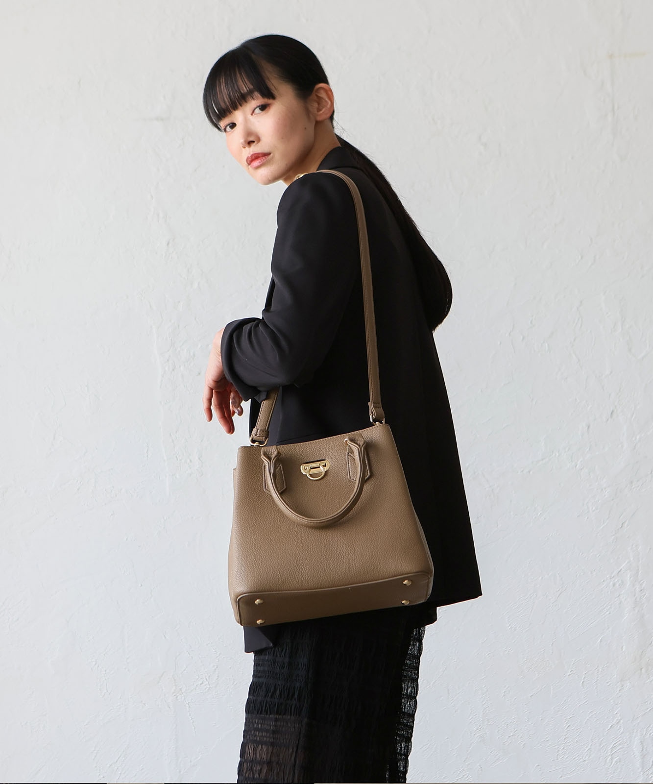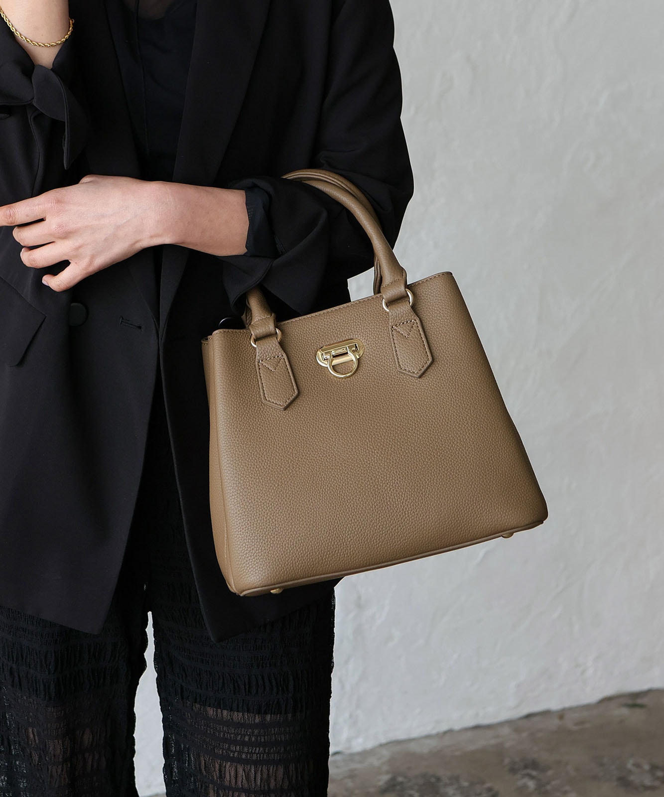 前面のリング型オコシ金具が上品なアクセントに。キレイめコーデにもカジュアルスタイルにも馴染み、幅広いシーンで活躍します。