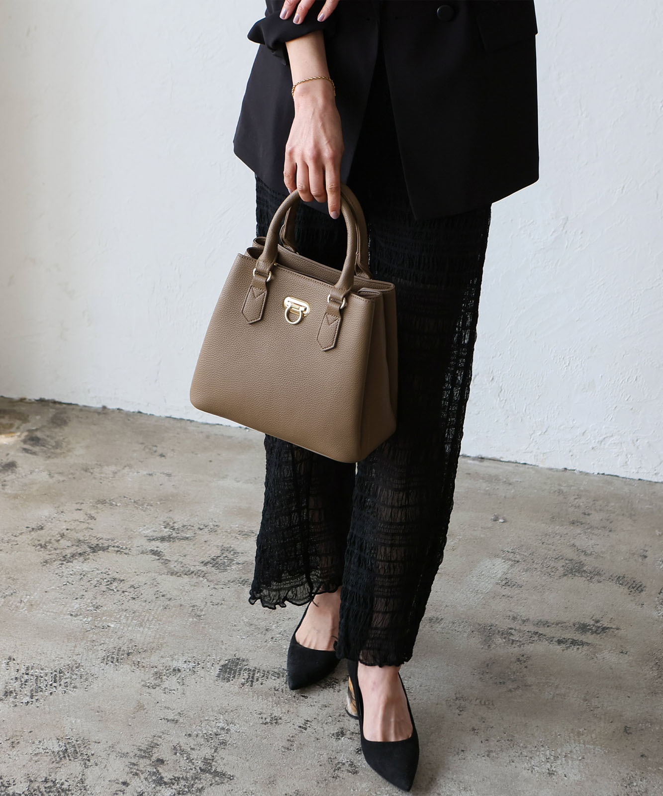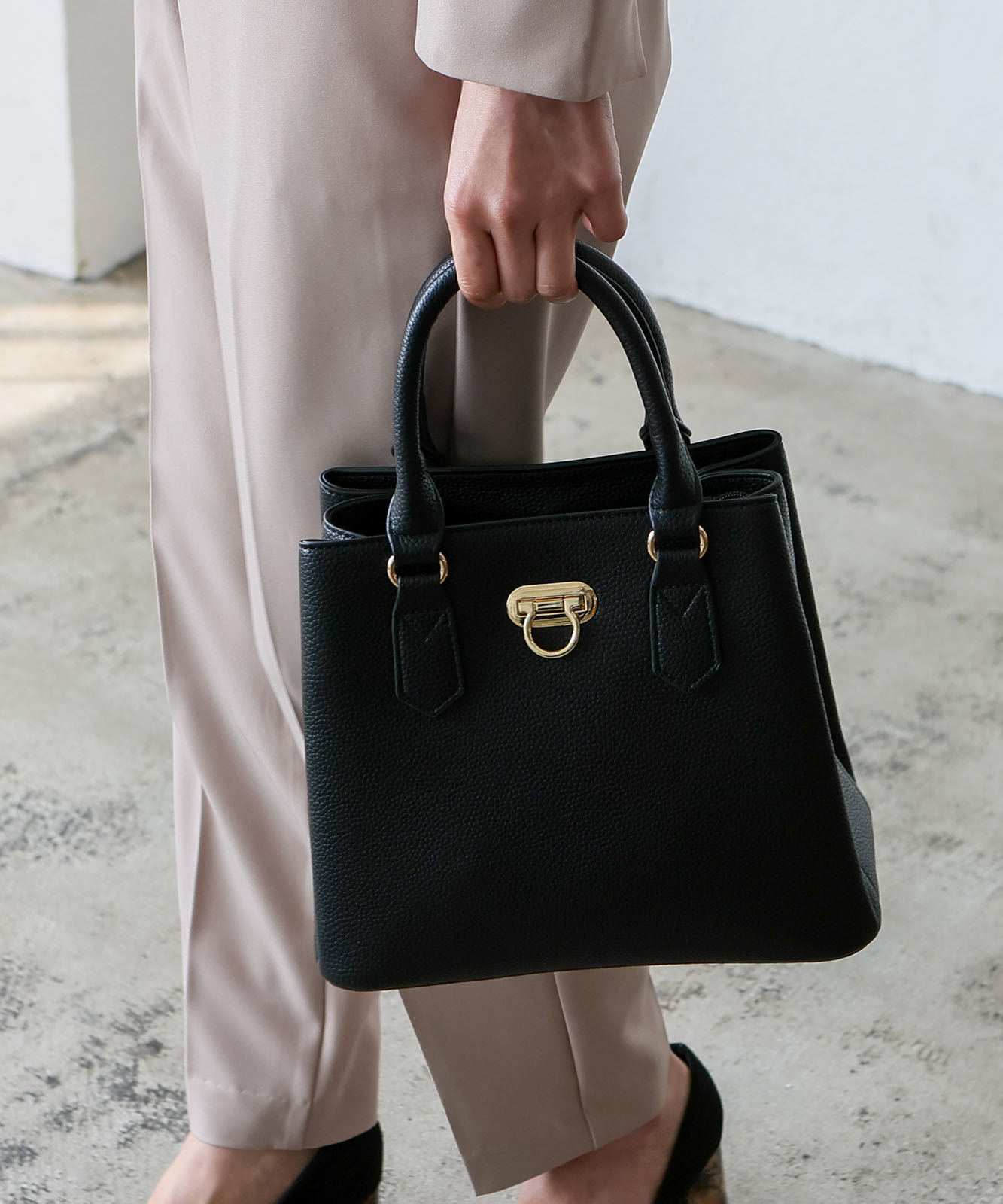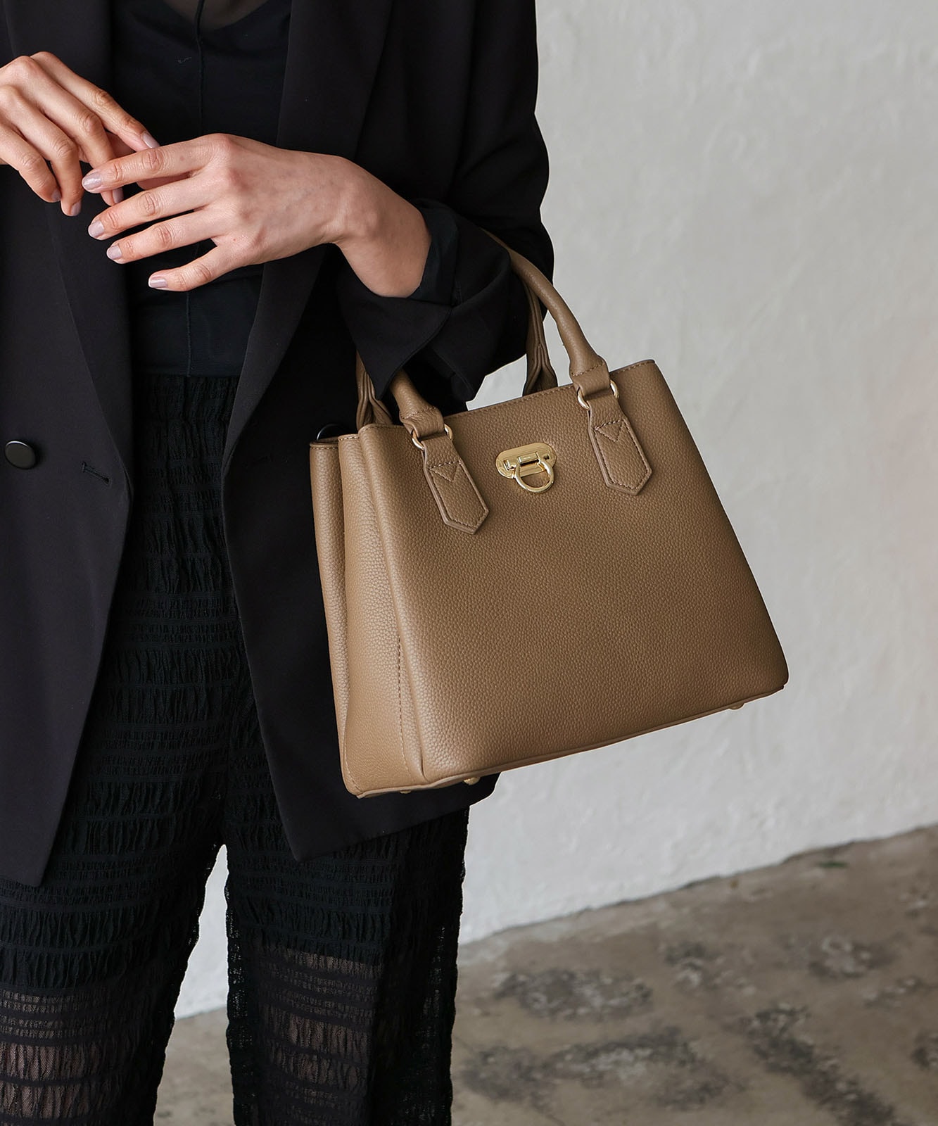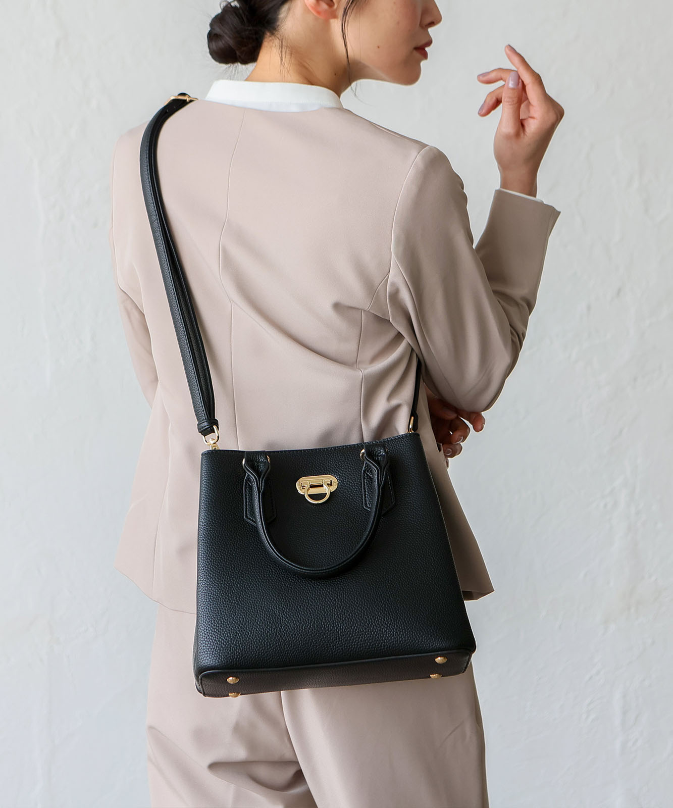前面のリング型オコシ金具が上品なアクセントに。キレイめコーデにもカジュアルスタイルにも馴染み、幅広いシーンで活躍します。