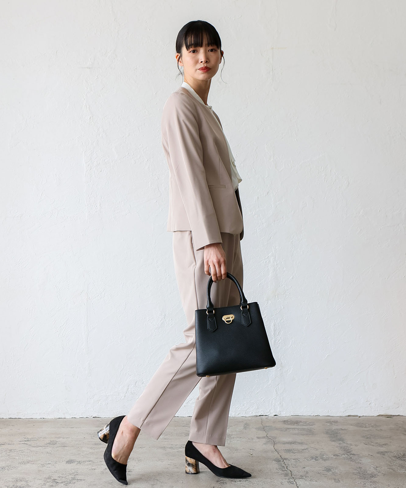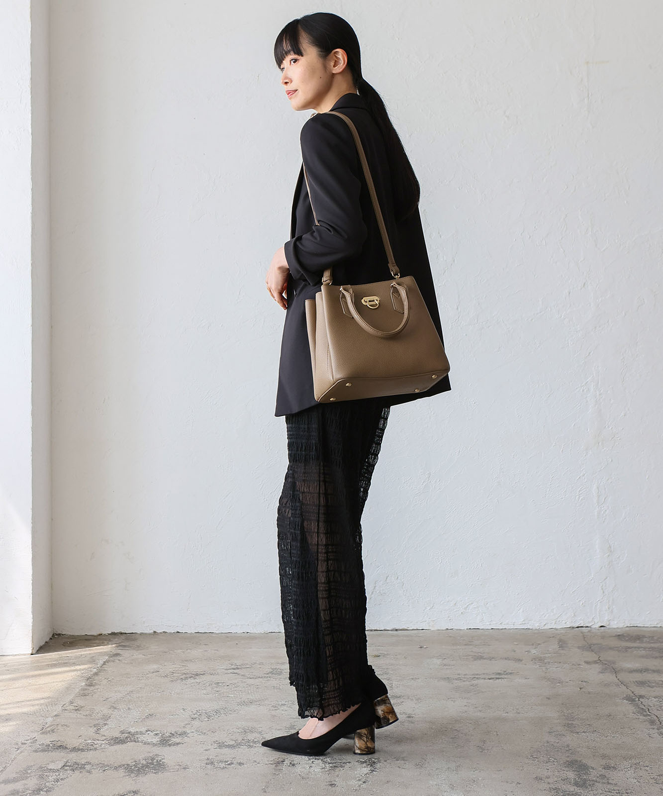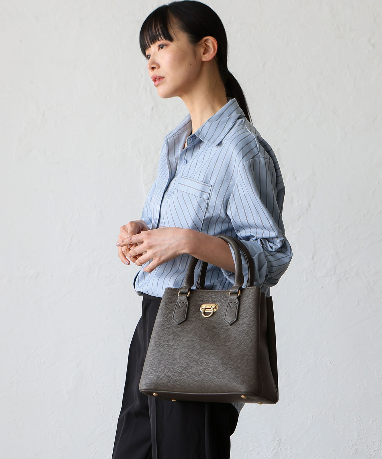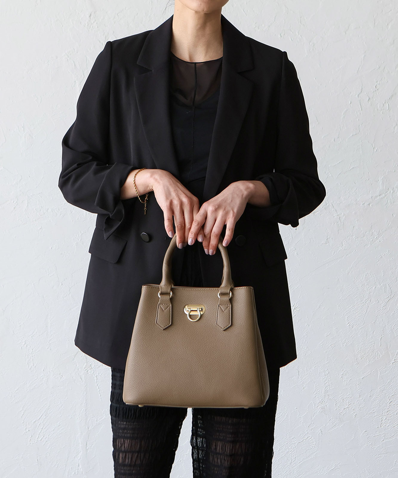 前面のリング型オコシ金具が上品なアクセントに。キレイめコーデにもカジュアルスタイルにも馴染み、幅広いシーンで活躍します。