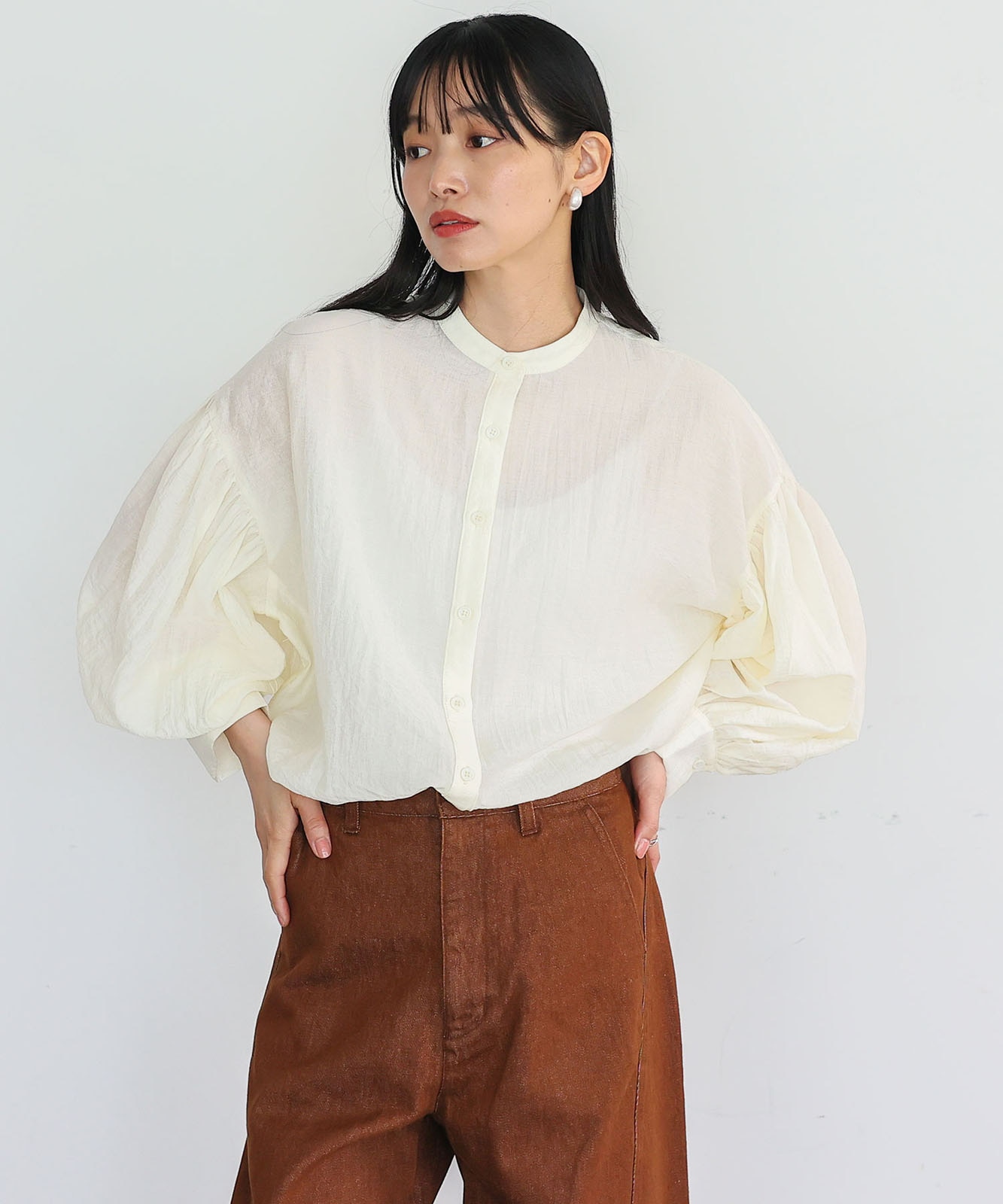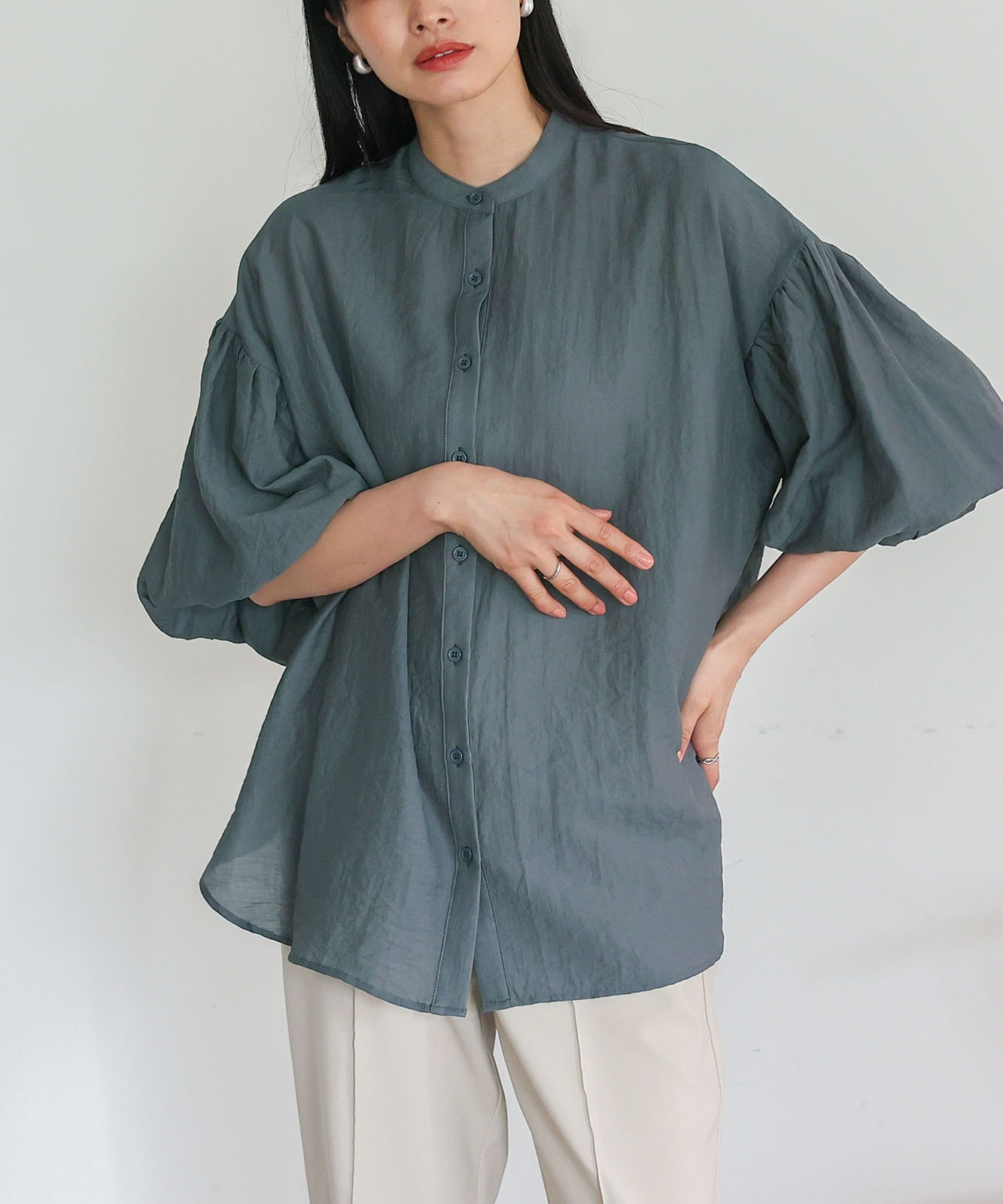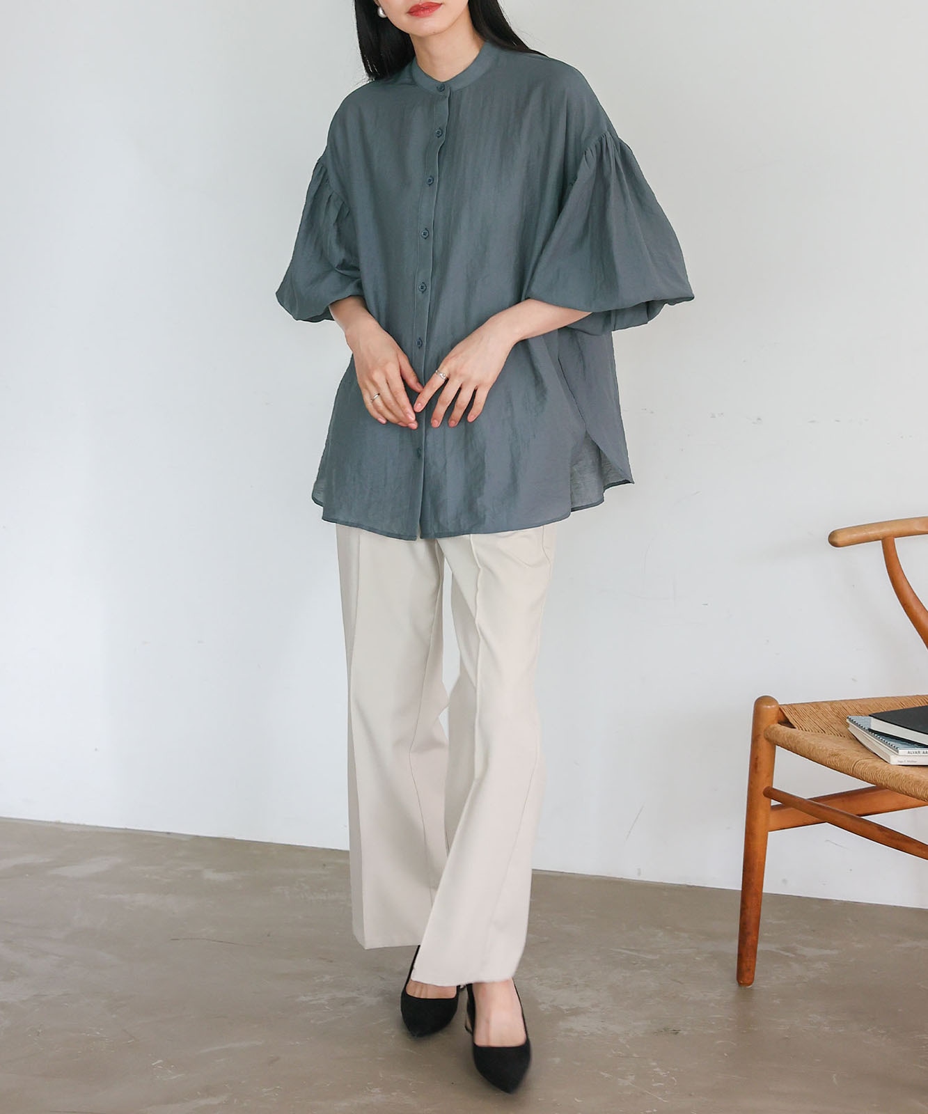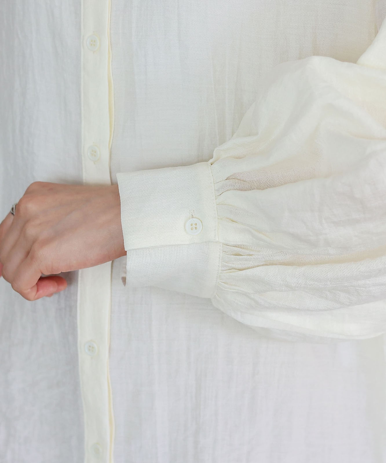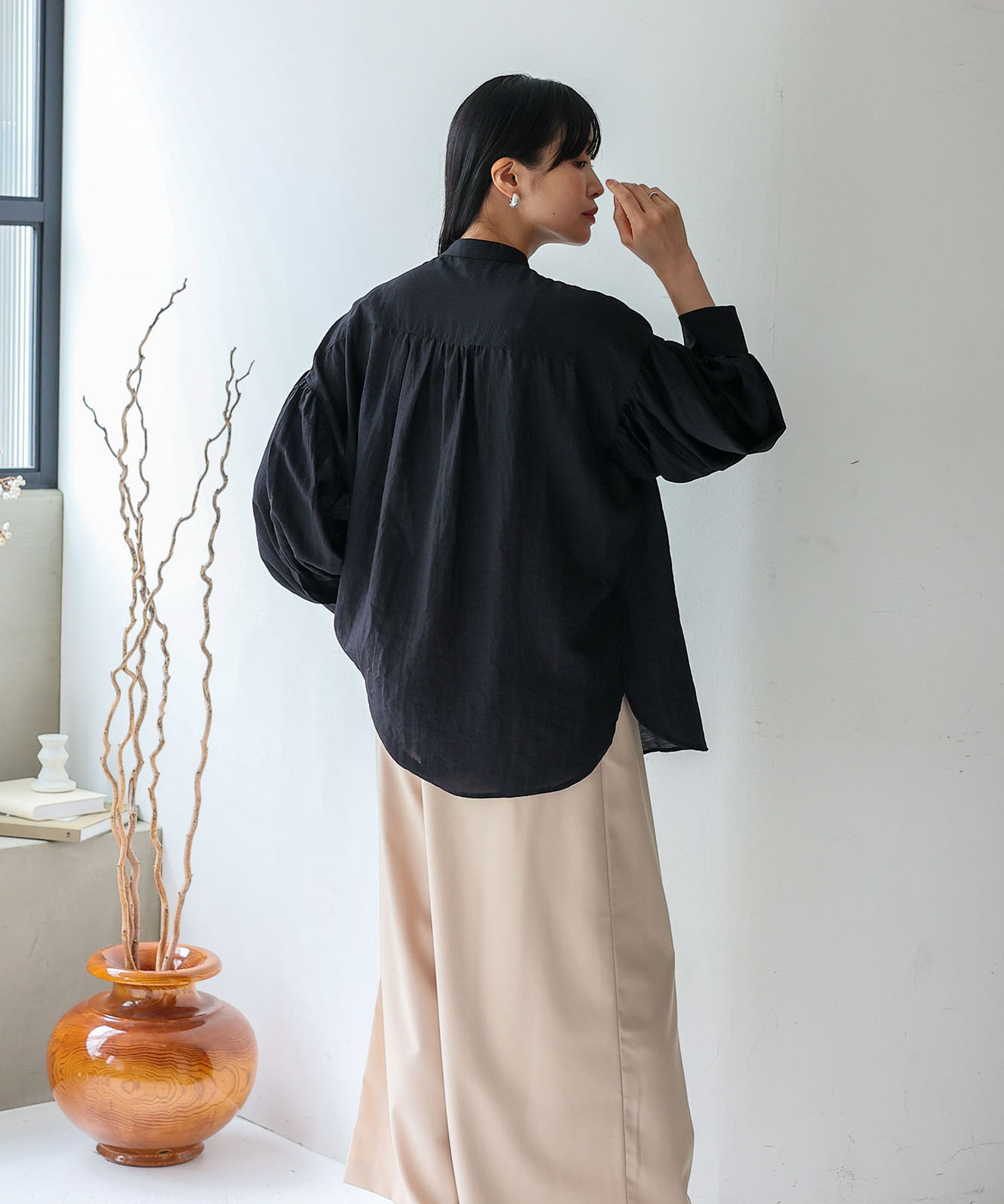 たっぷりとギャザーを入れた袖が動くたびにふんわり揺れ、シンプルながらも存在感のある一枚に。