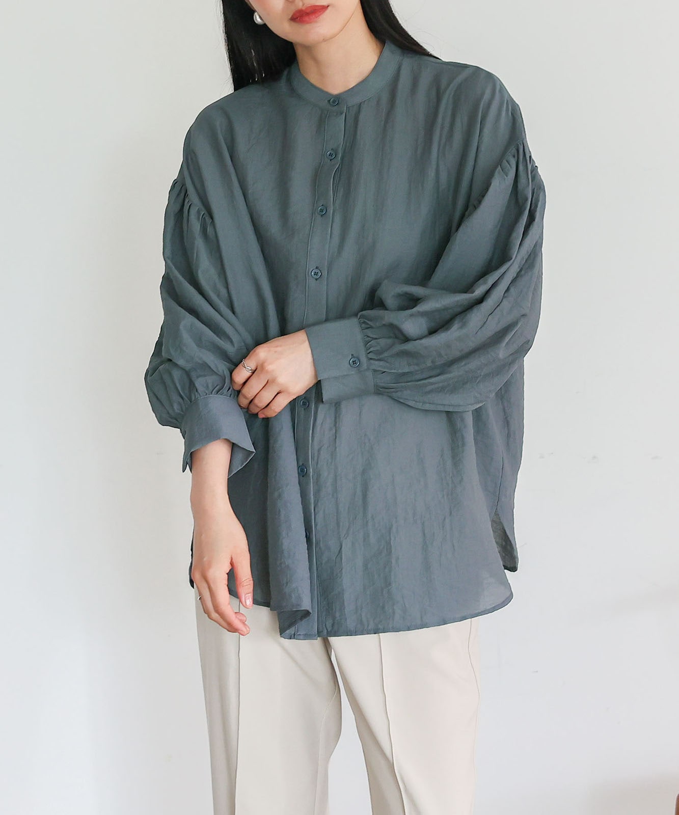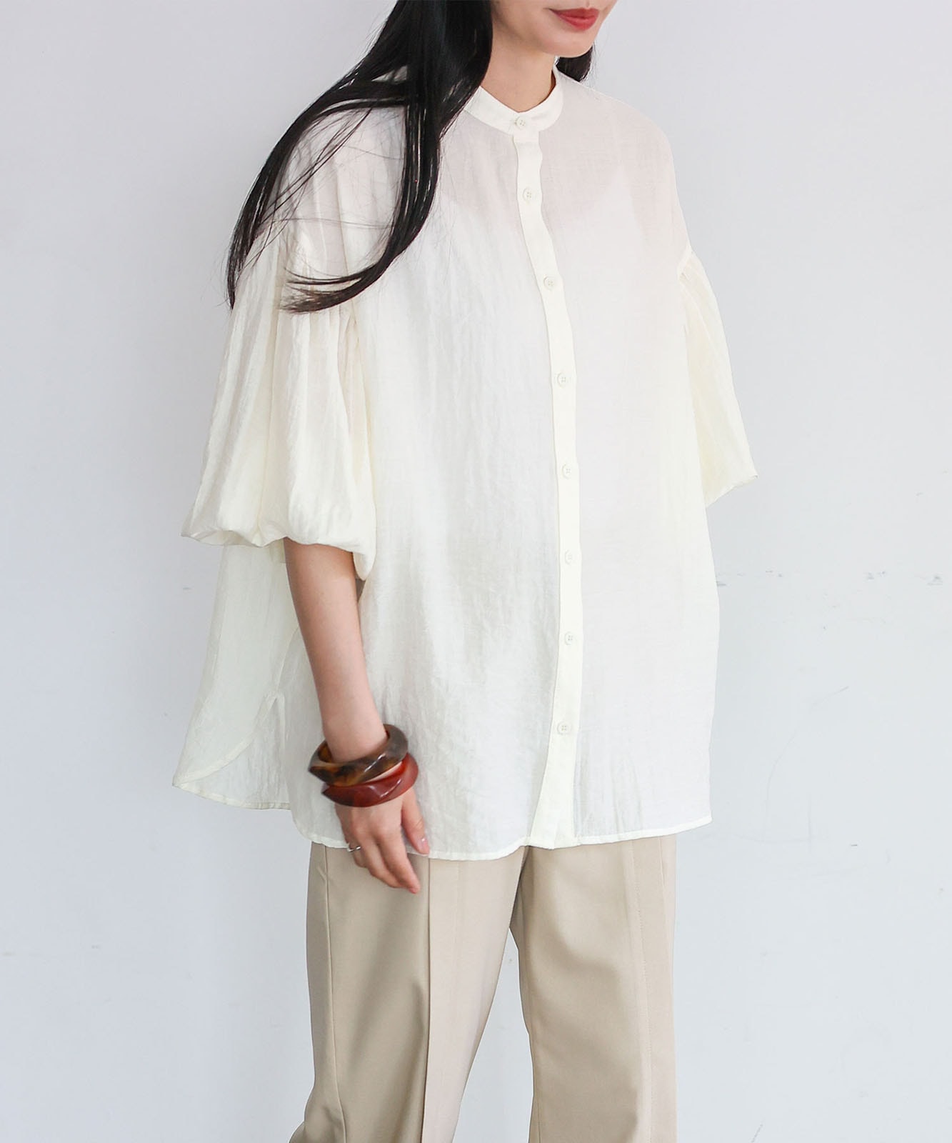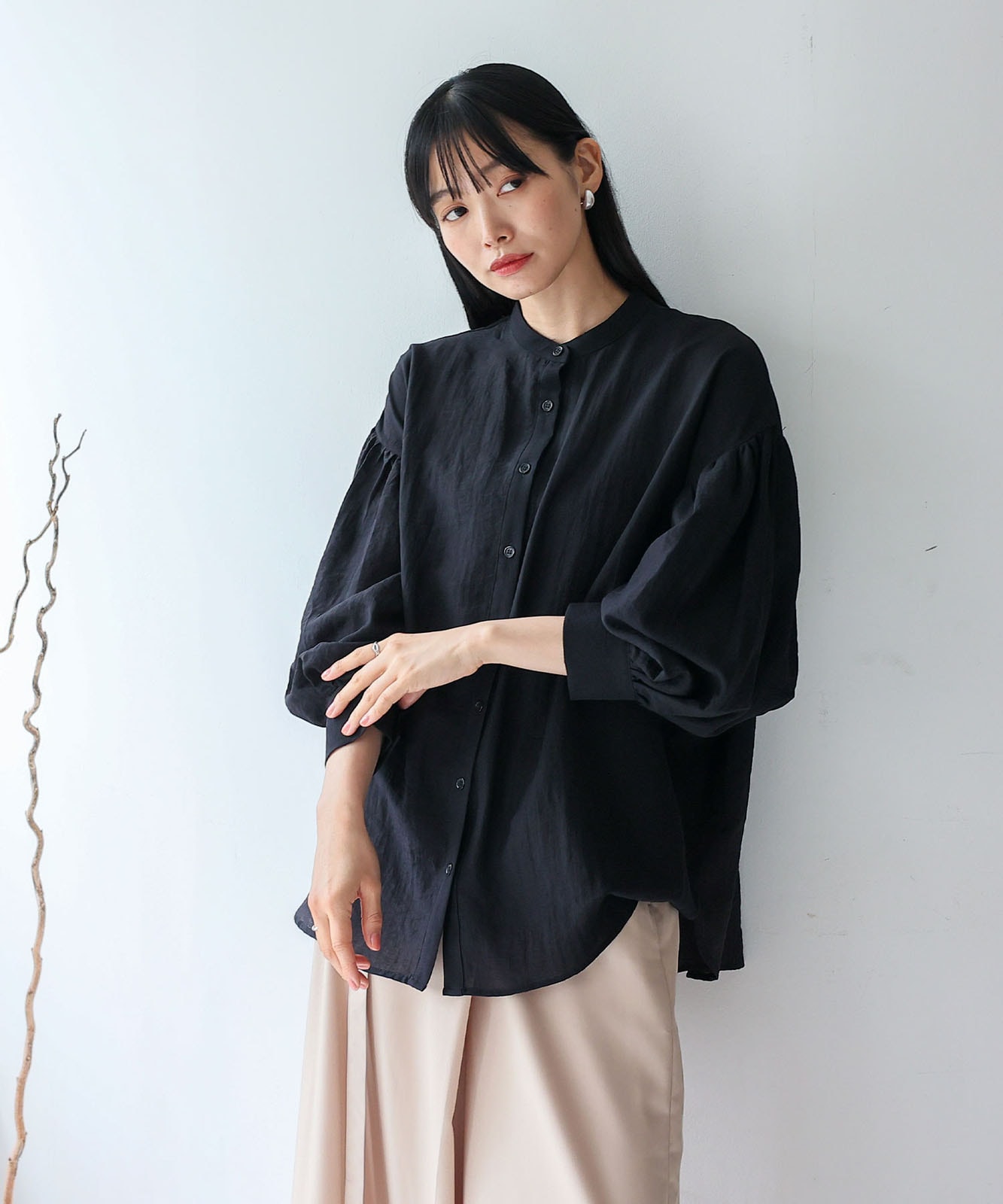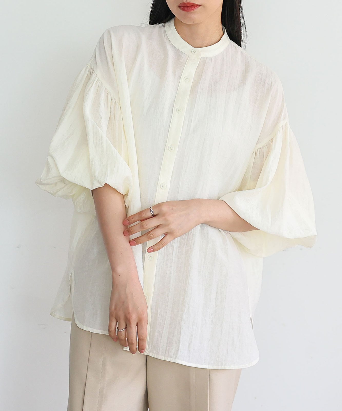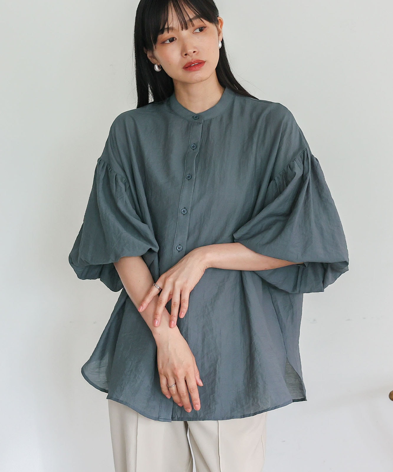 たっぷりとギャザーを入れた袖が動くたびにふんわり揺れ、シンプルながらも存在感のある一枚に。