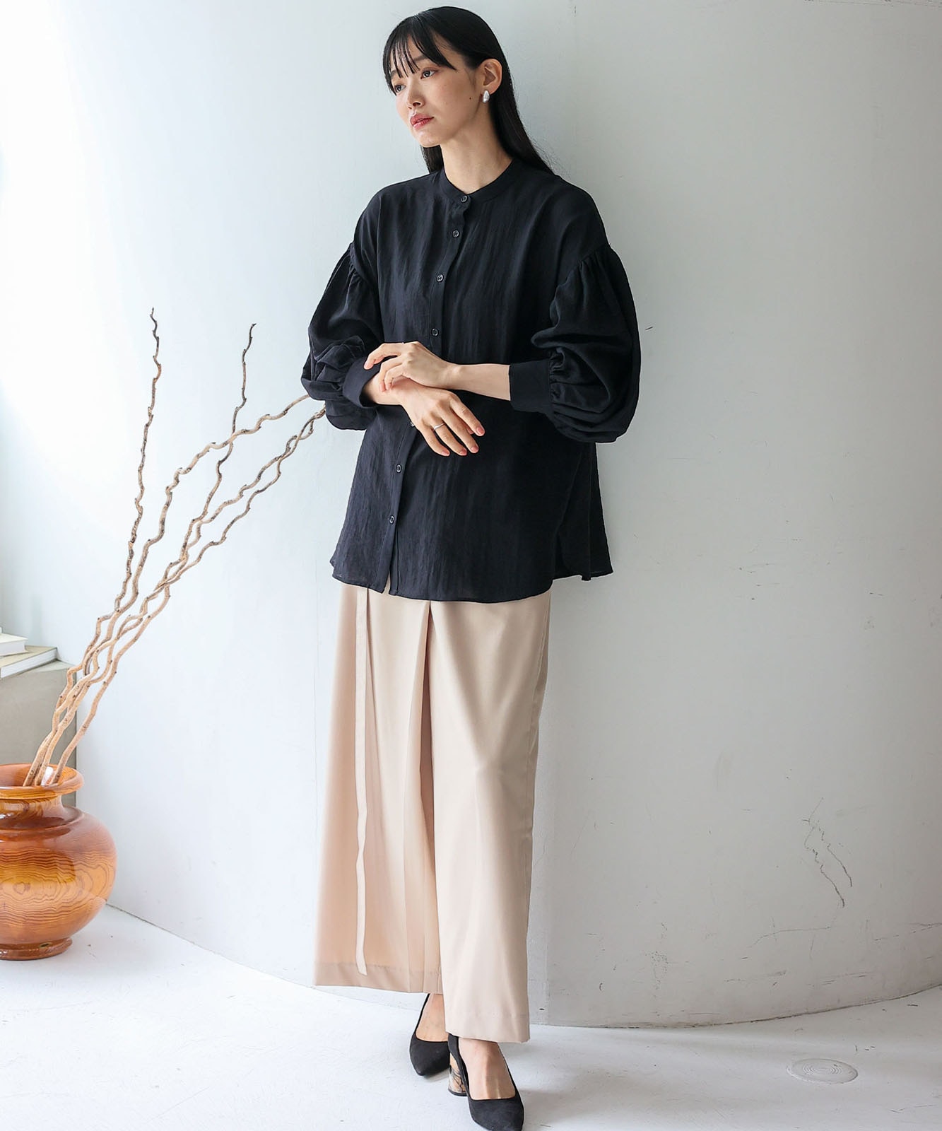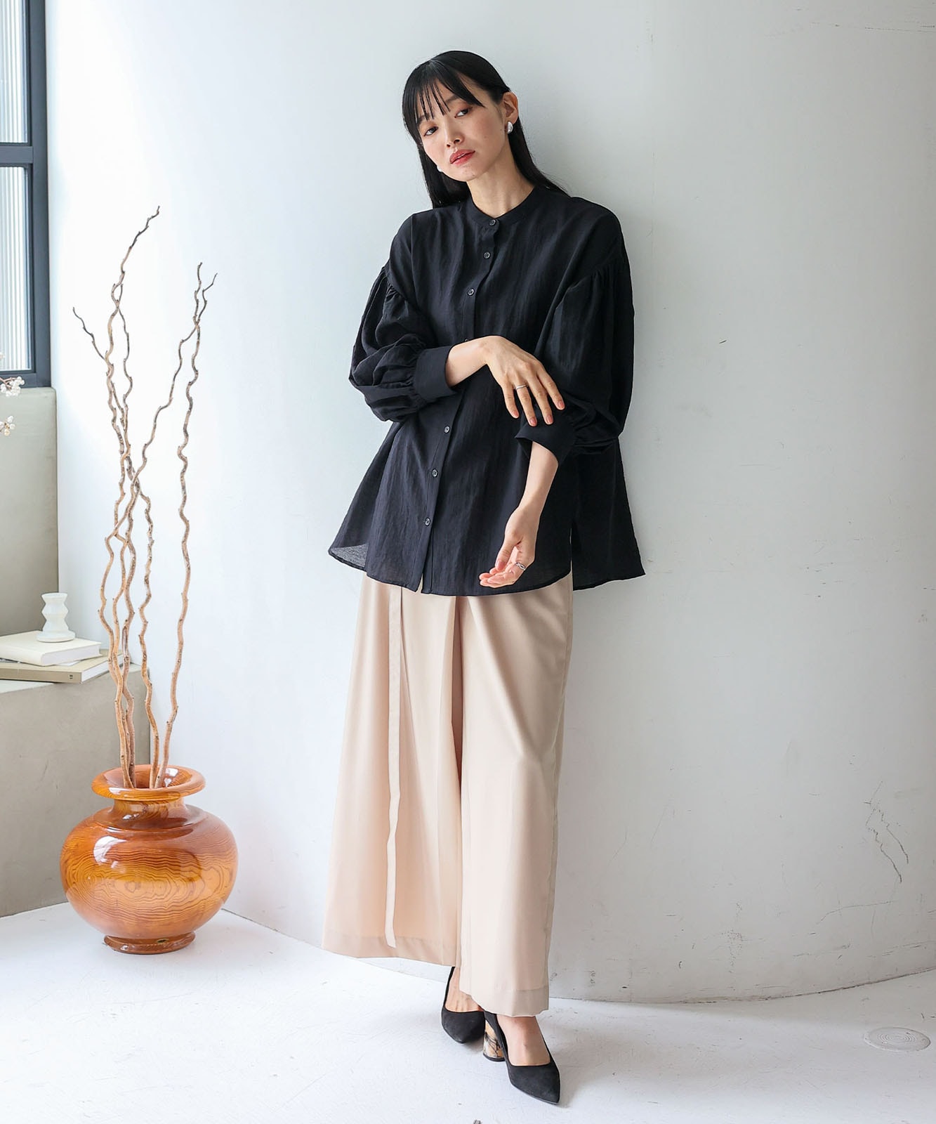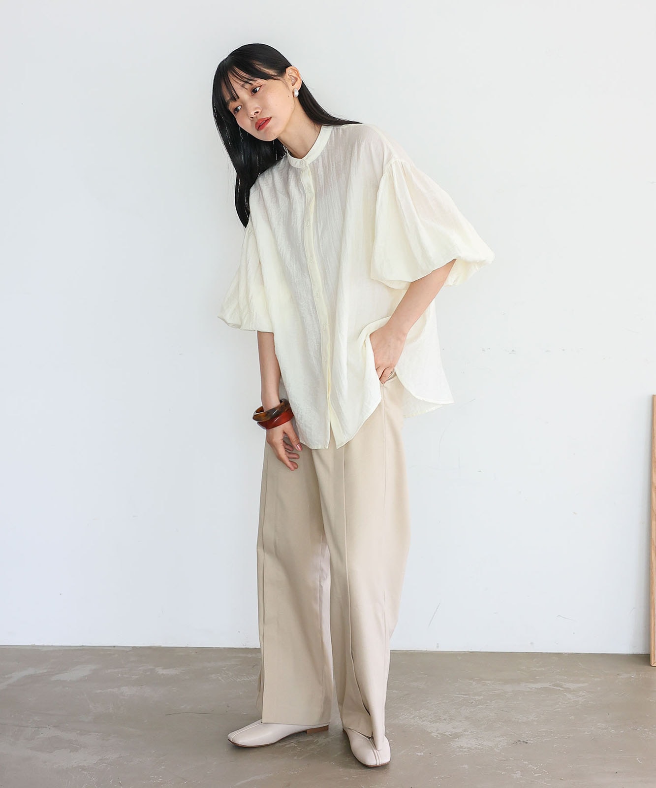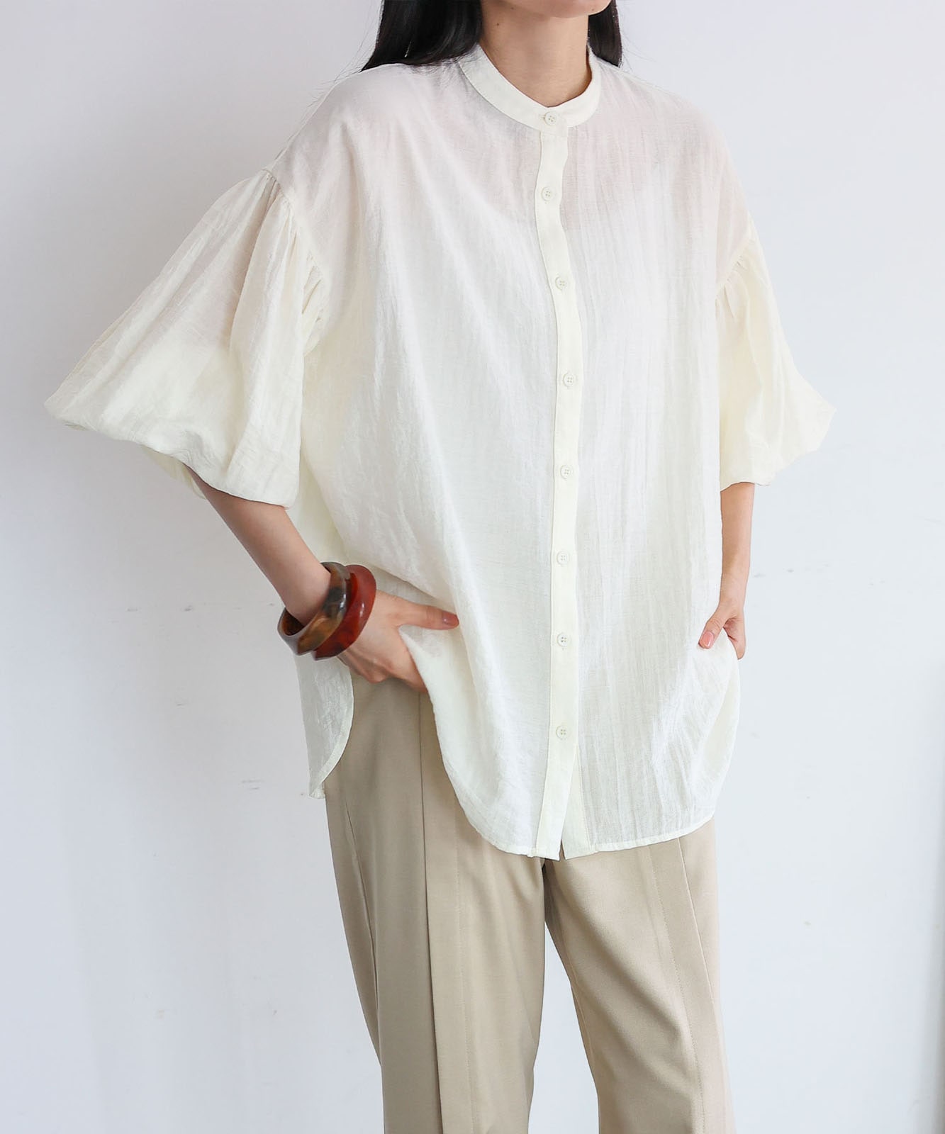 たっぷりとギャザーを入れた袖が動くたびにふんわり揺れ、シンプルながらも存在感のある一枚に。