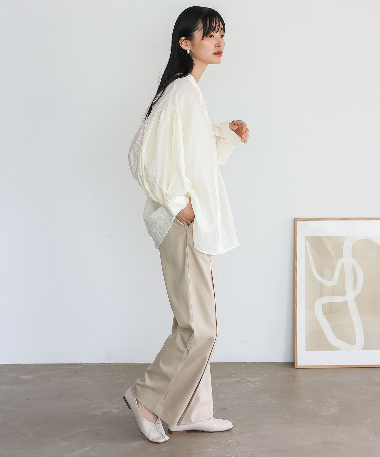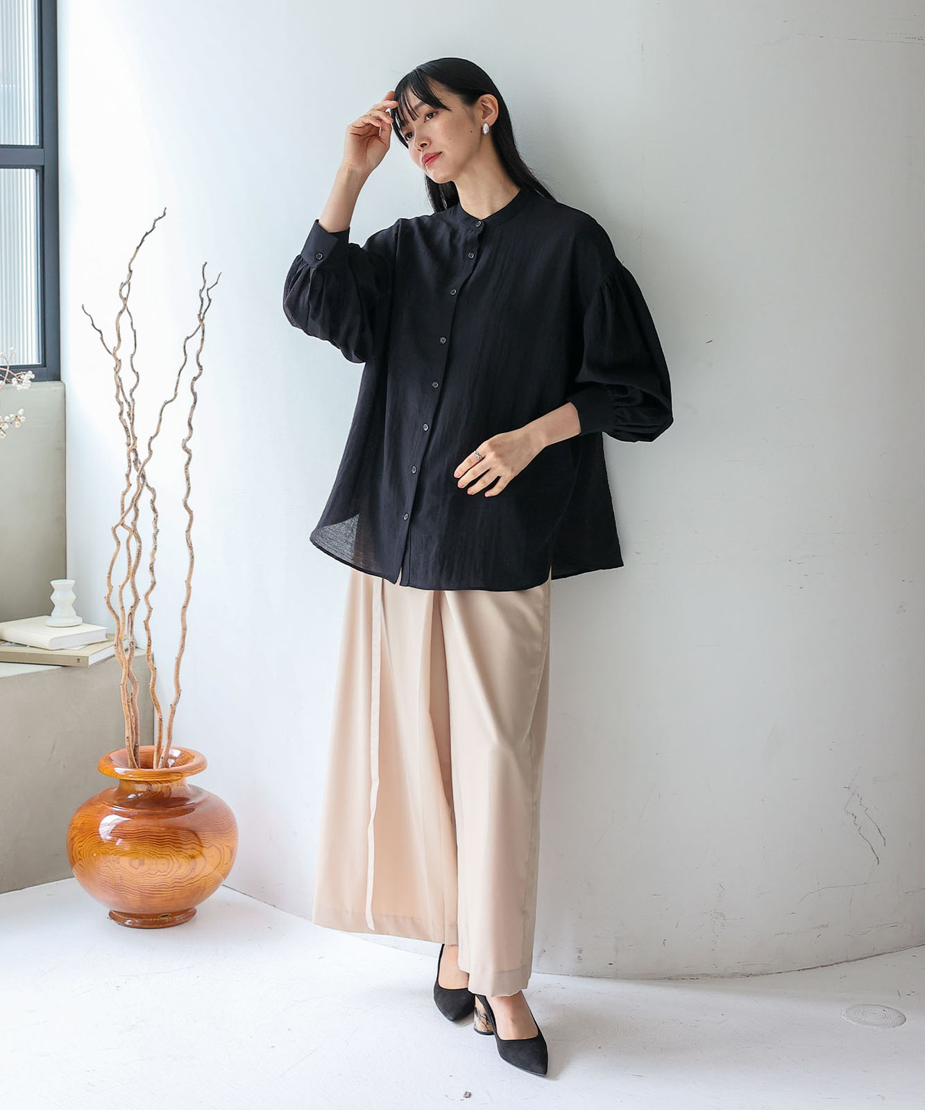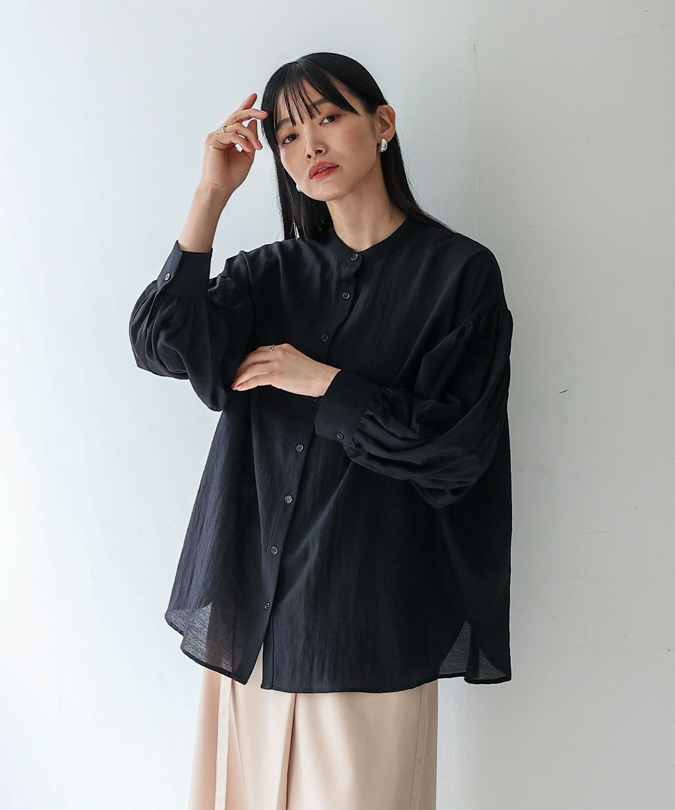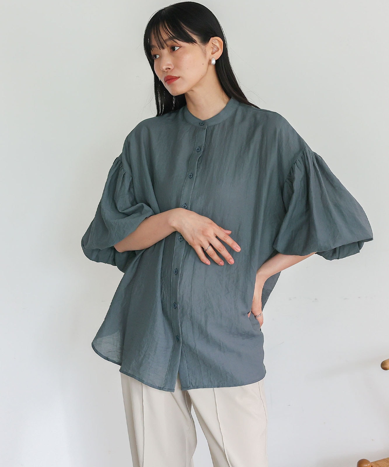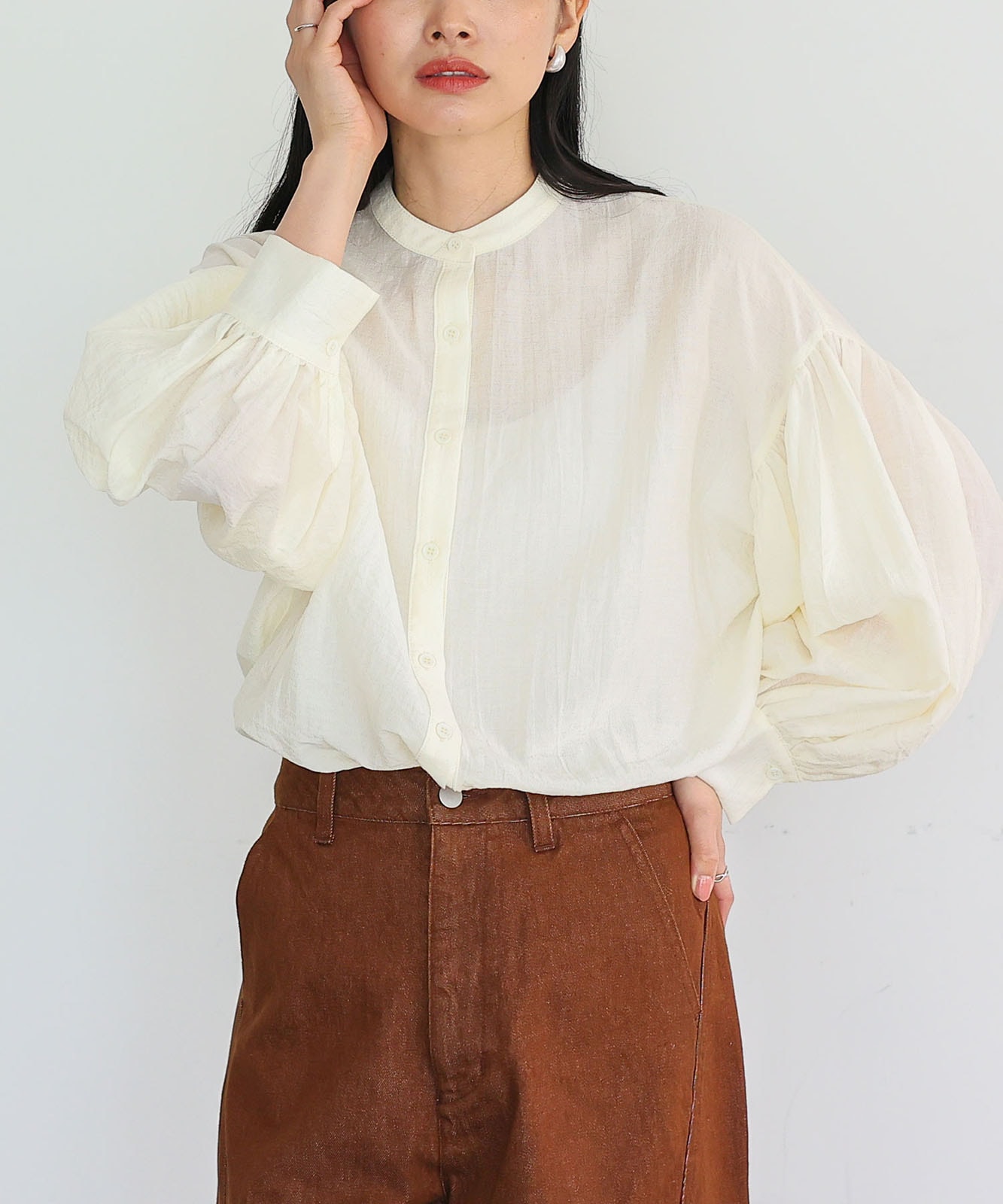 たっぷりとギャザーを入れた袖が動くたびにふんわり揺れ、シンプルながらも存在感のある一枚に。