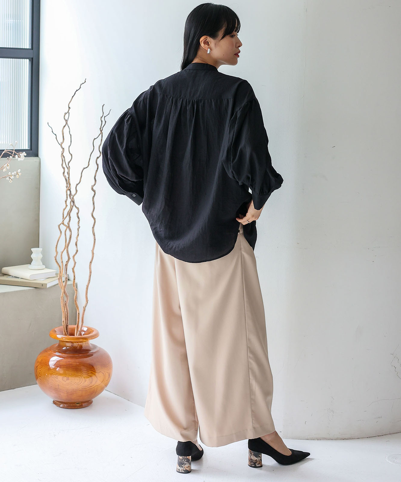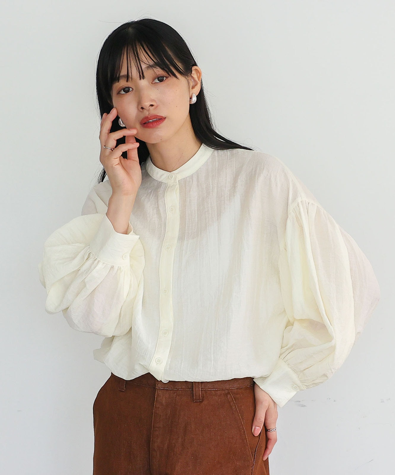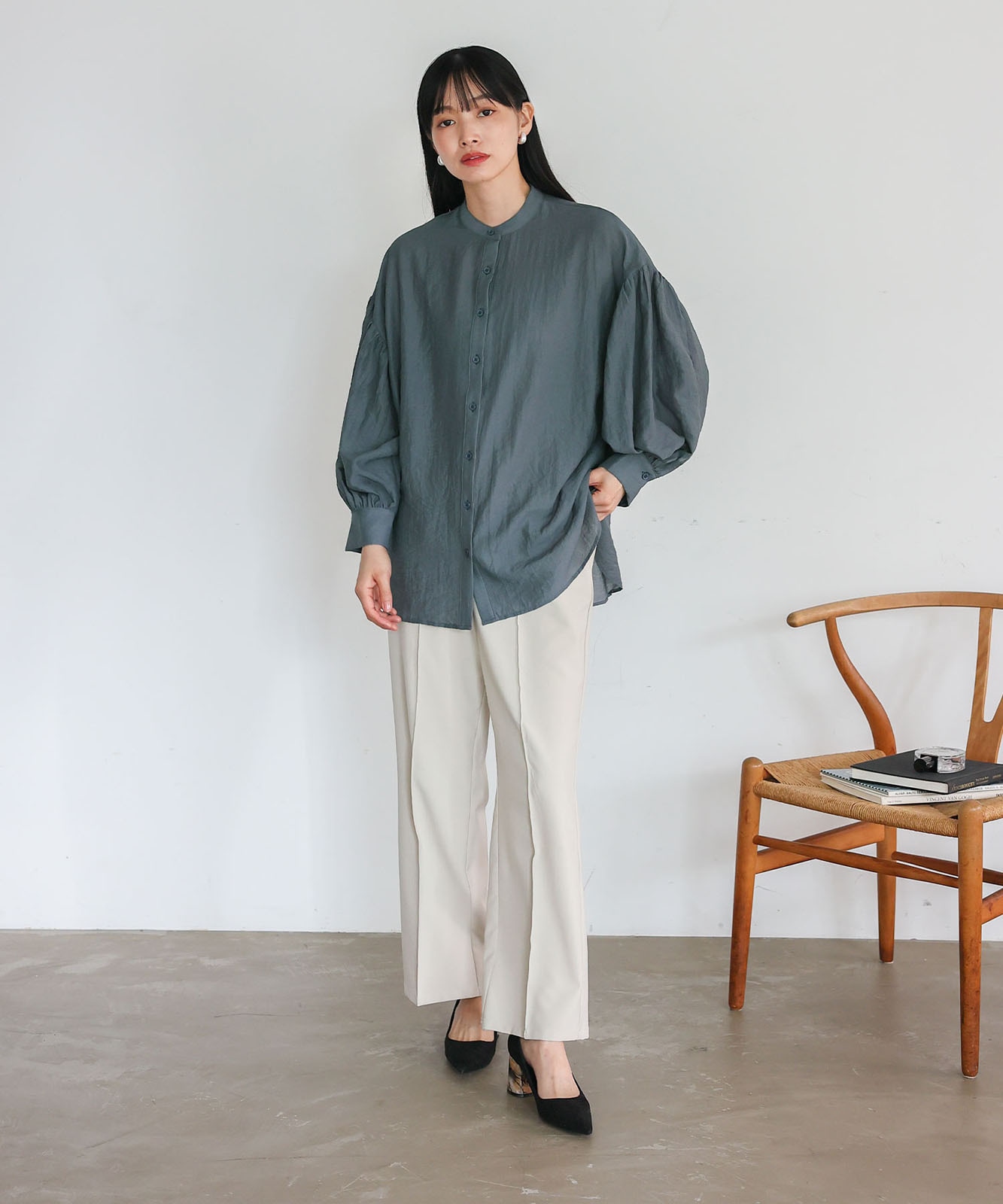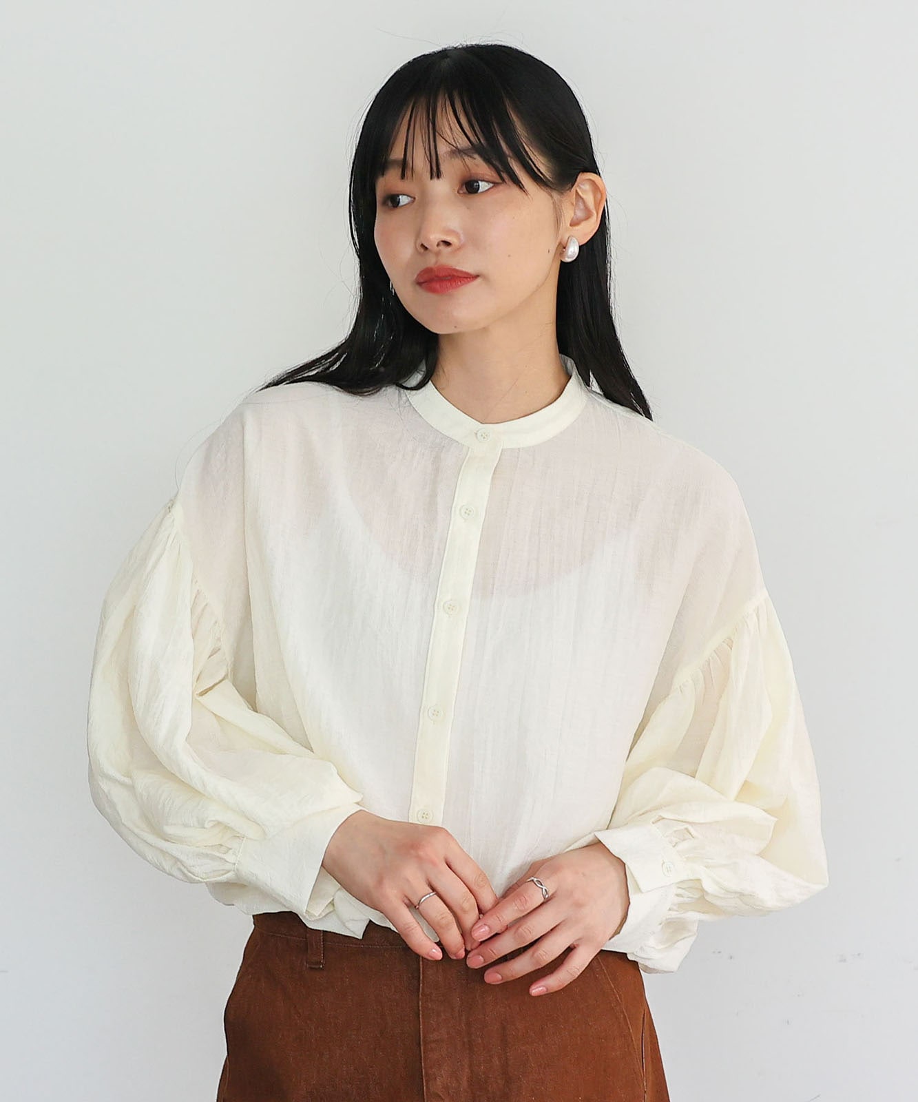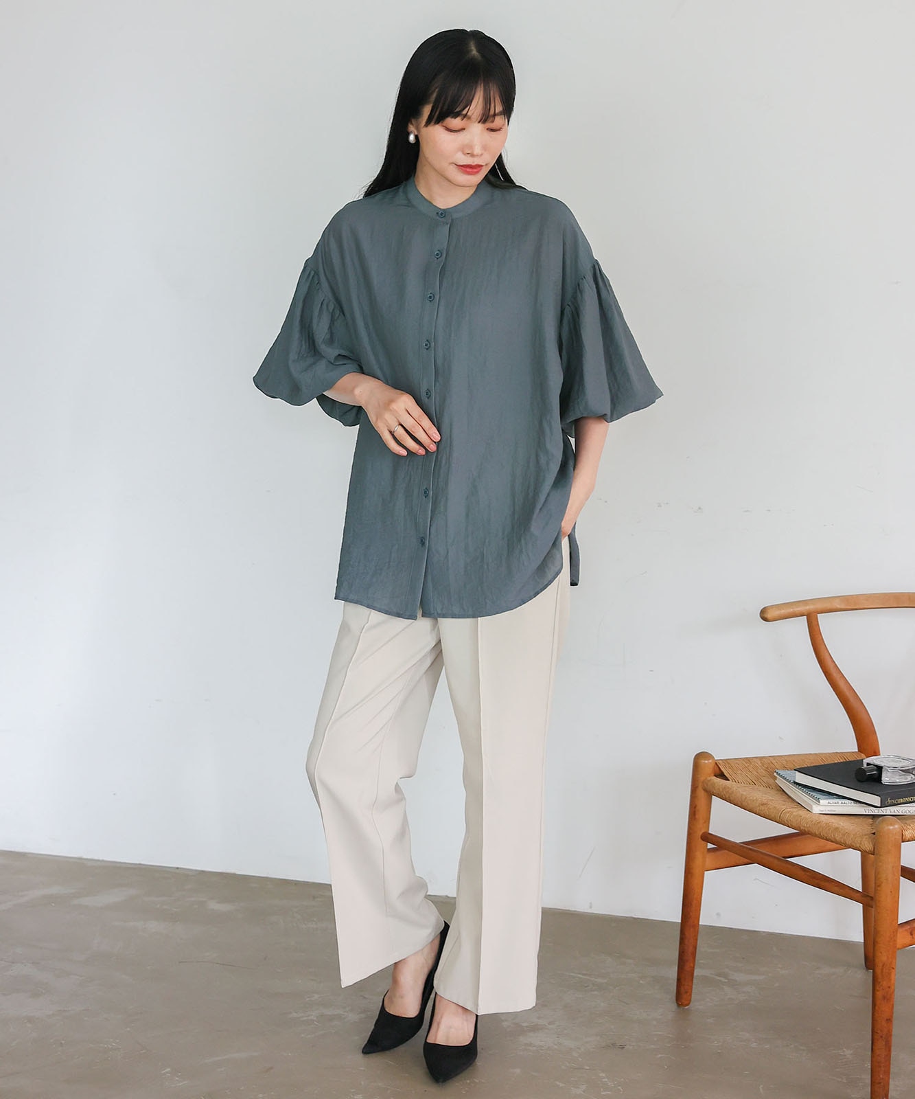 たっぷりとギャザーを入れた袖が動くたびにふんわり揺れ、シンプルながらも存在感のある一枚に。