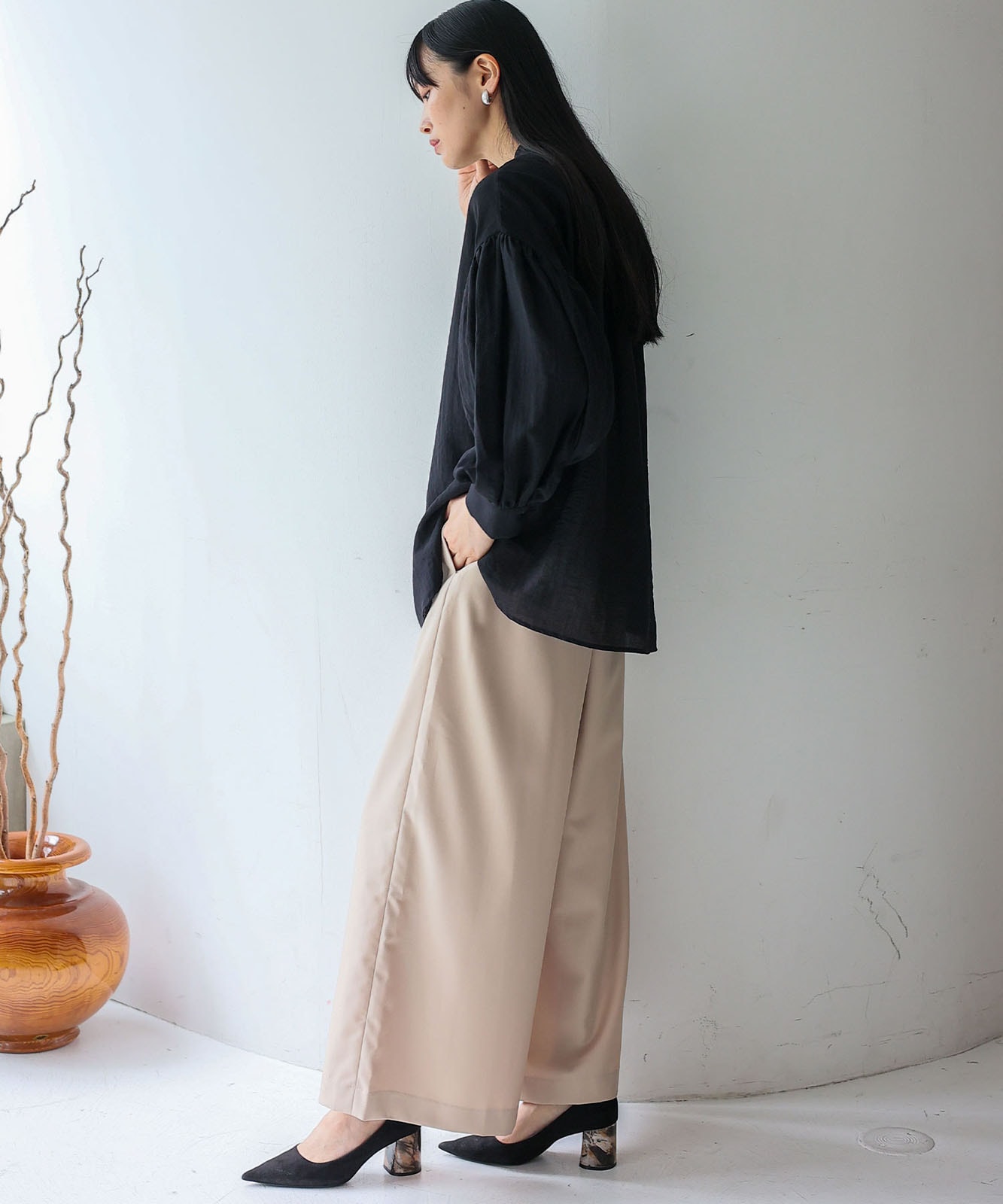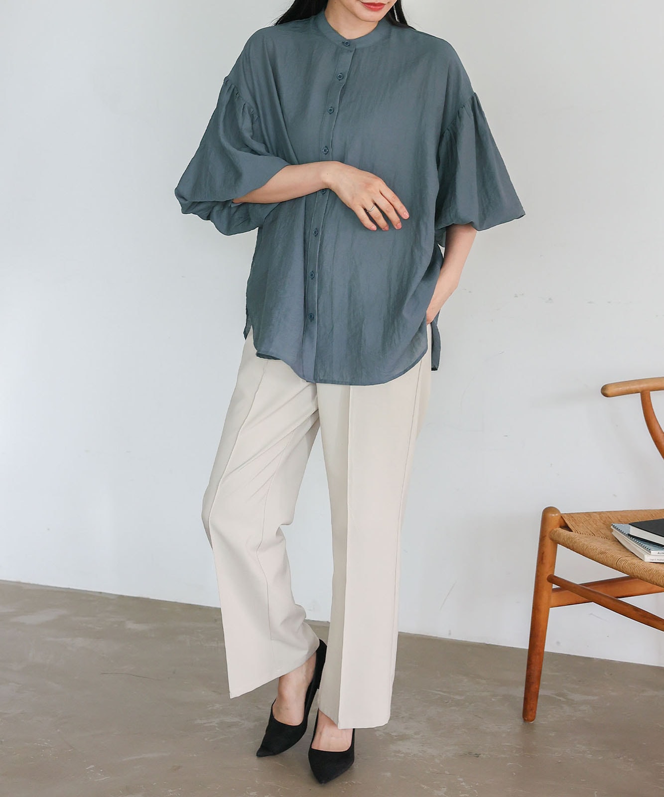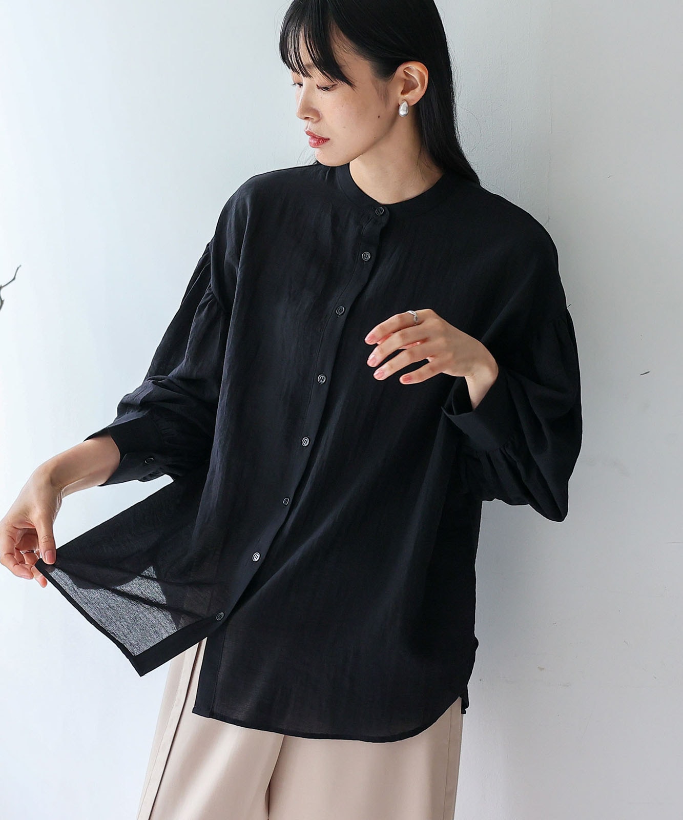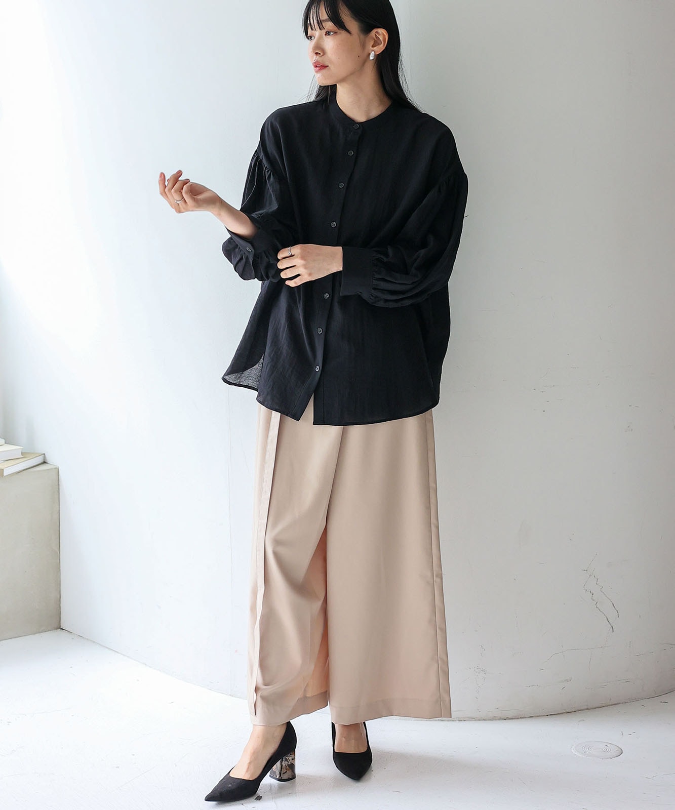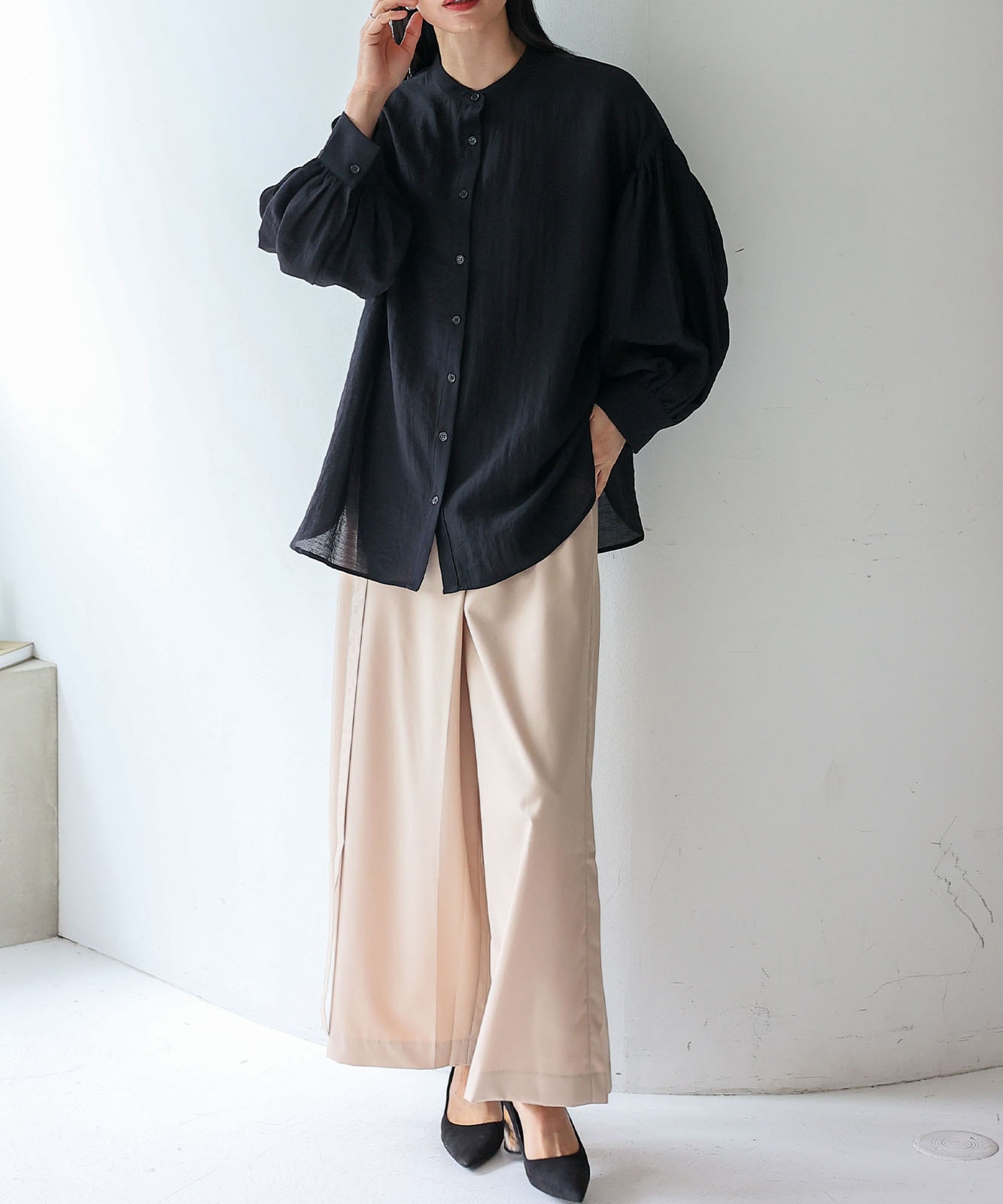 たっぷりとギャザーを入れた袖が動くたびにふんわり揺れ、シンプルながらも存在感のある一枚に。