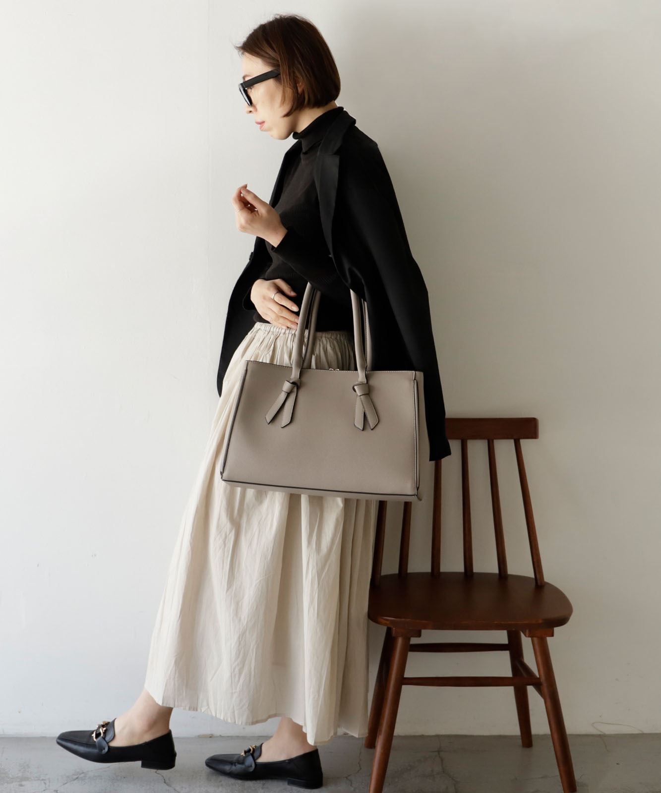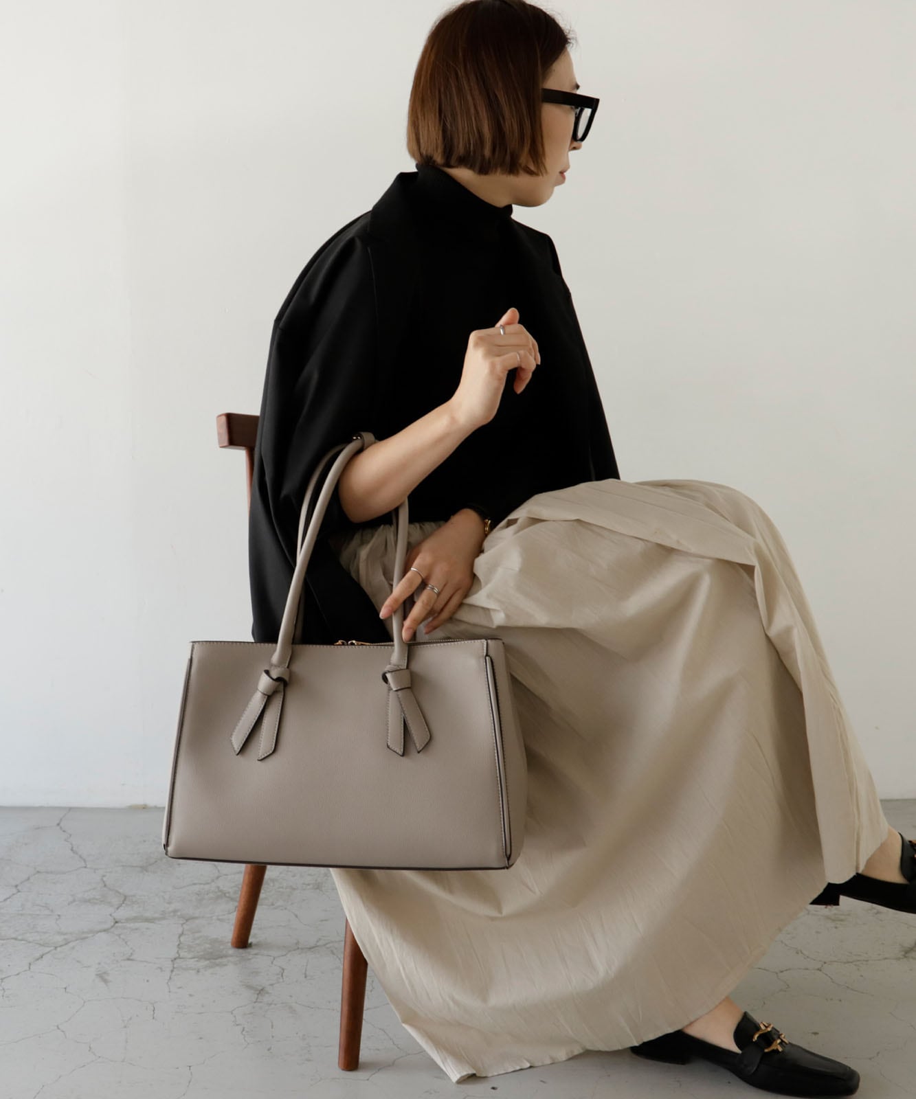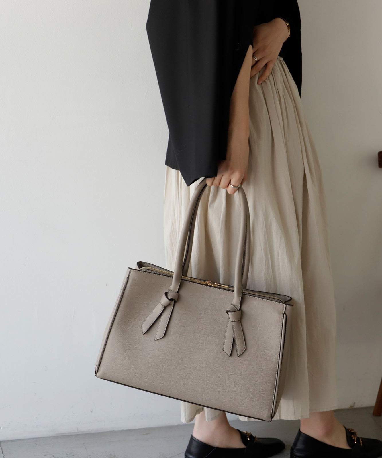 四角くカッチリとしたトートに、甘すぎないリボンのデザインバンドルがさりげなくアクセントになった、大人な雰囲気を持ち合わせたバッグです。
