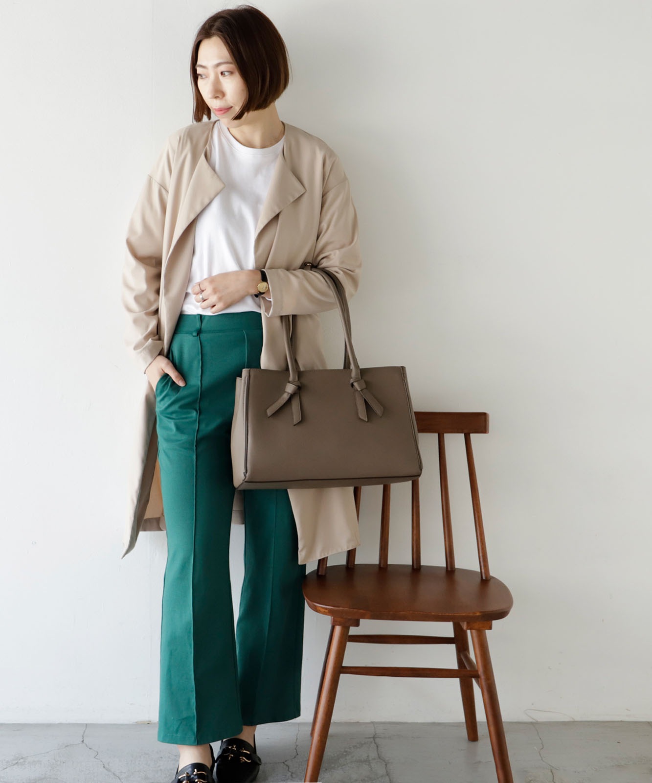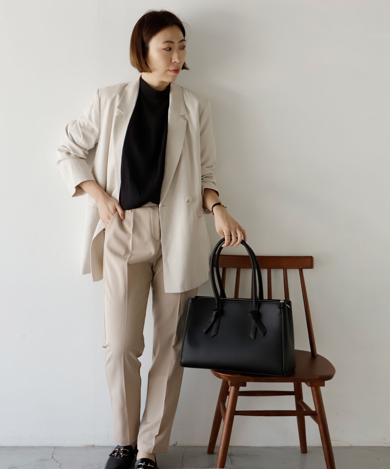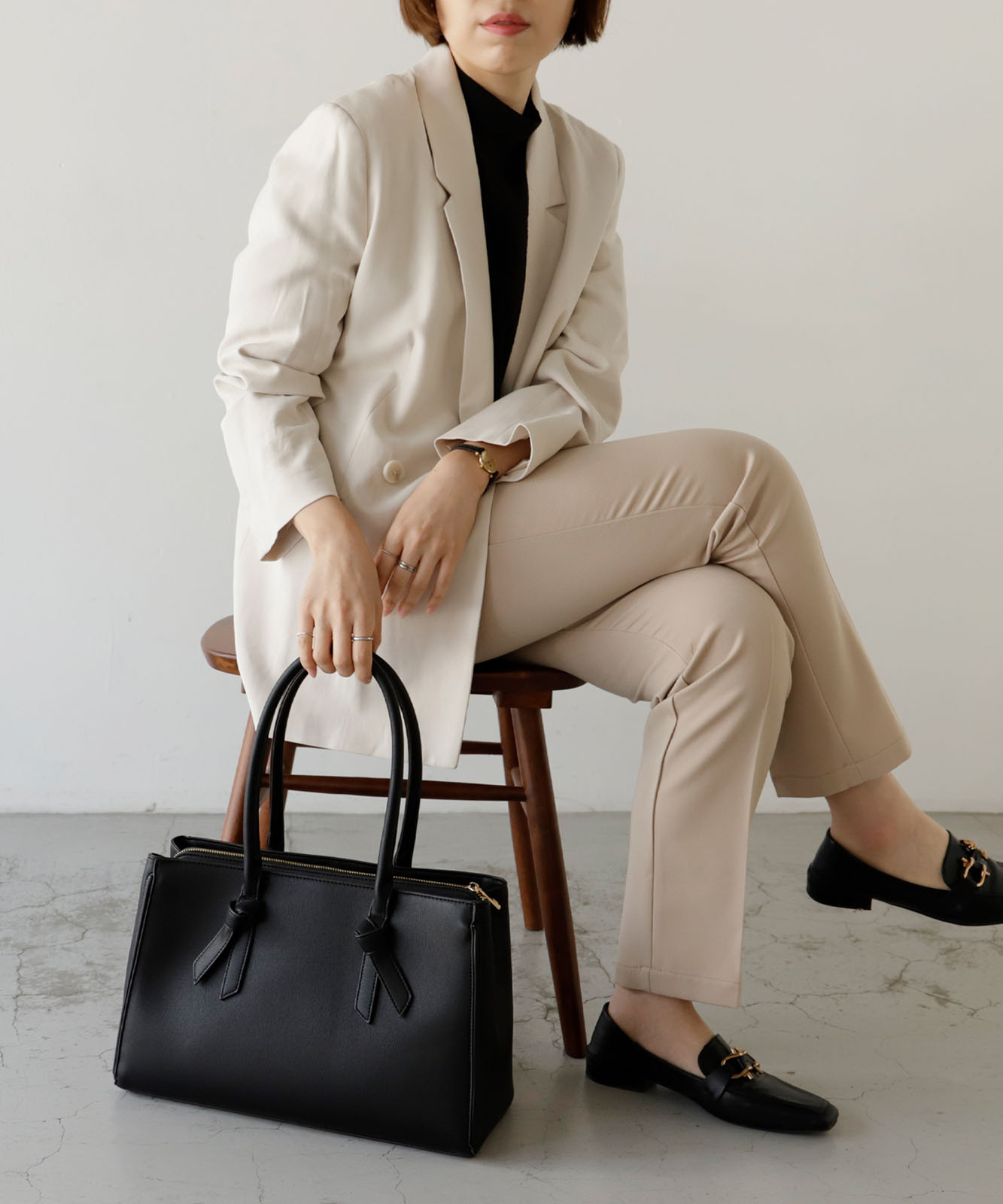 四角くカッチリとしたトートに、甘すぎないリボンのデザインバンドルがさりげなくアクセントになった、大人な雰囲気を持ち合わせたバッグです。
