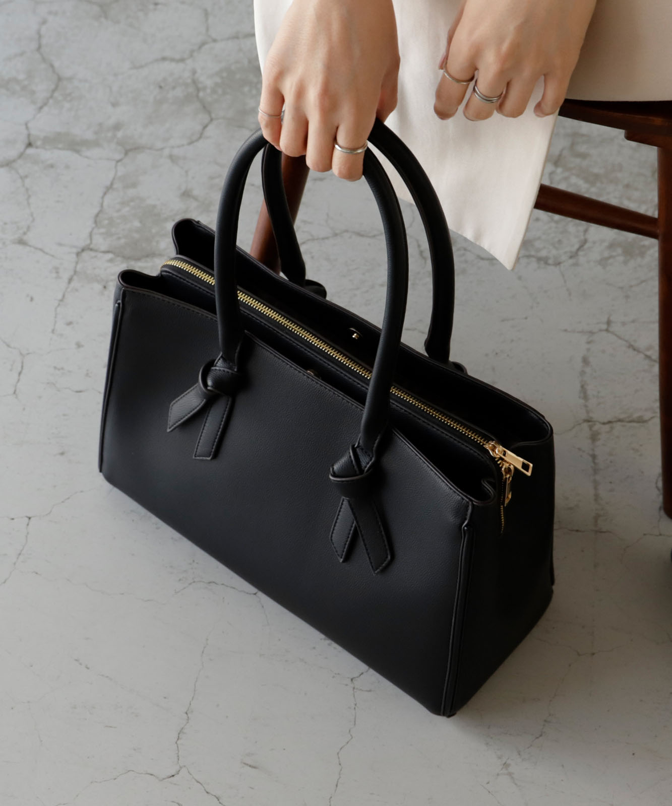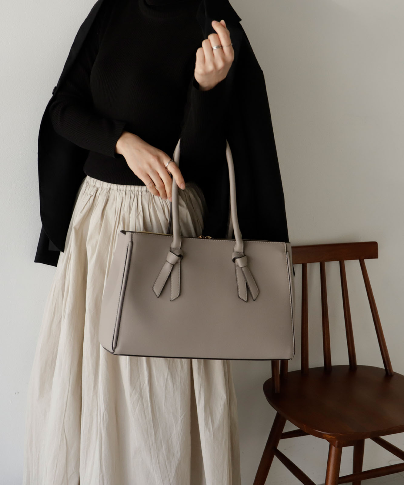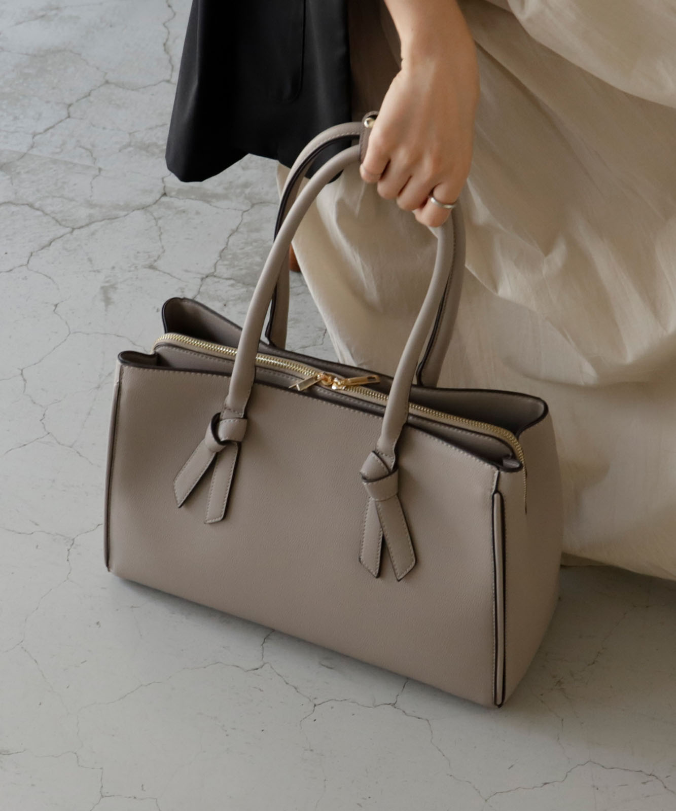 ハンドルの先端がリボンになったビジネスにも使えるトートバッグ。