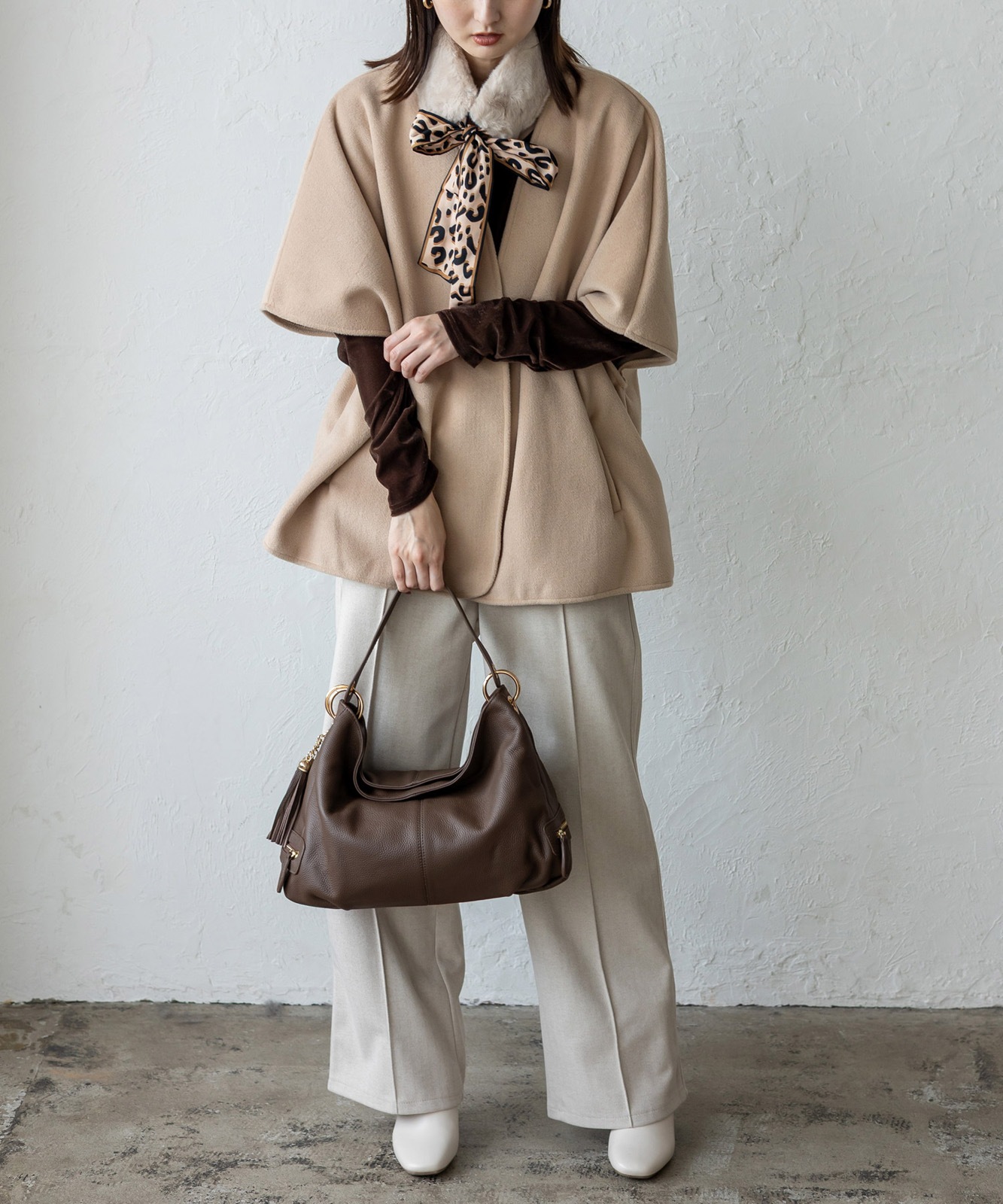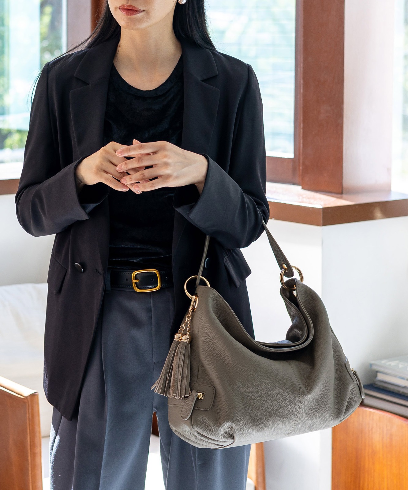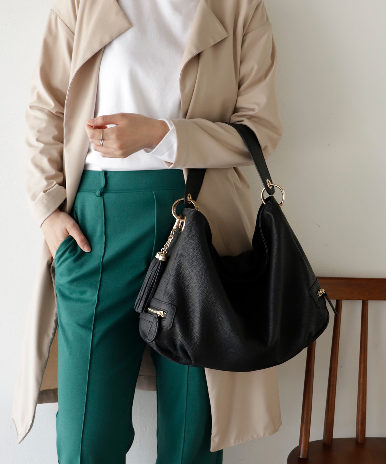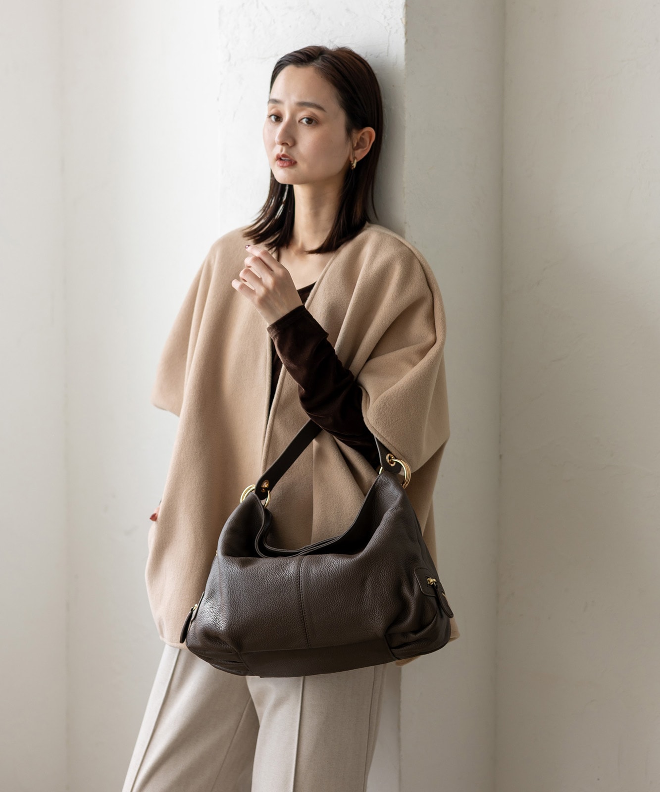 カジュアルにもフォーマルにも合わせやすい、上品で洗練されたルックが魅力です。通勤スタイルにもマッチします。