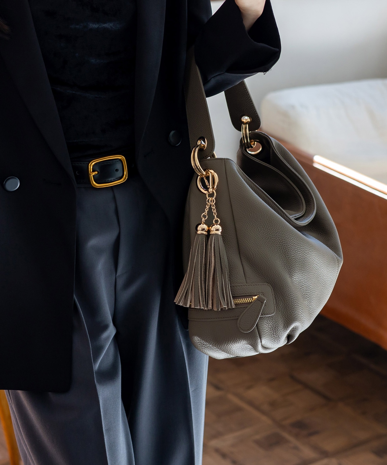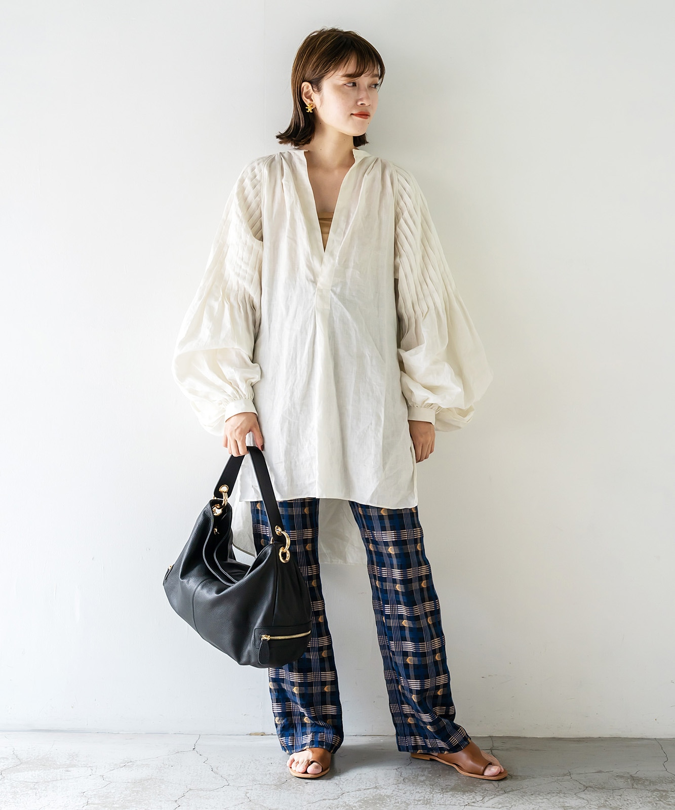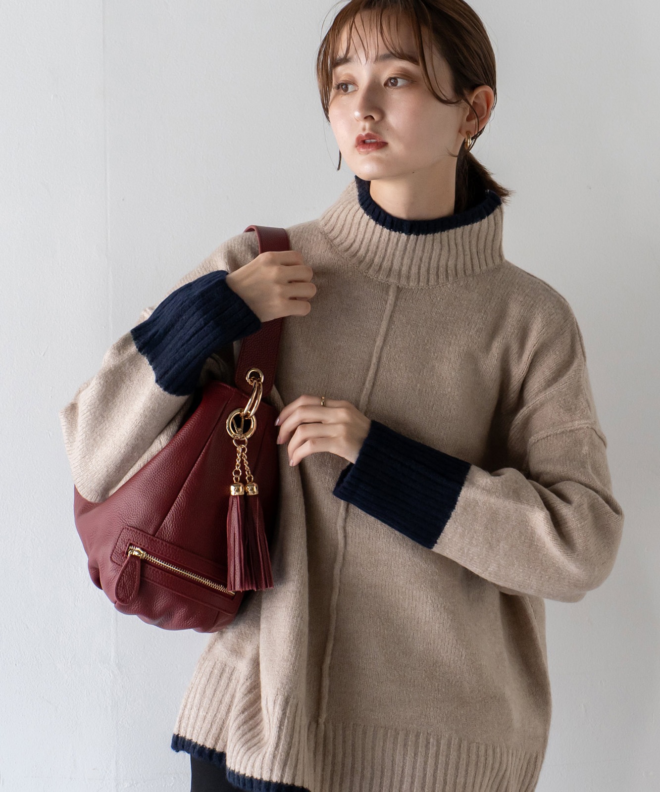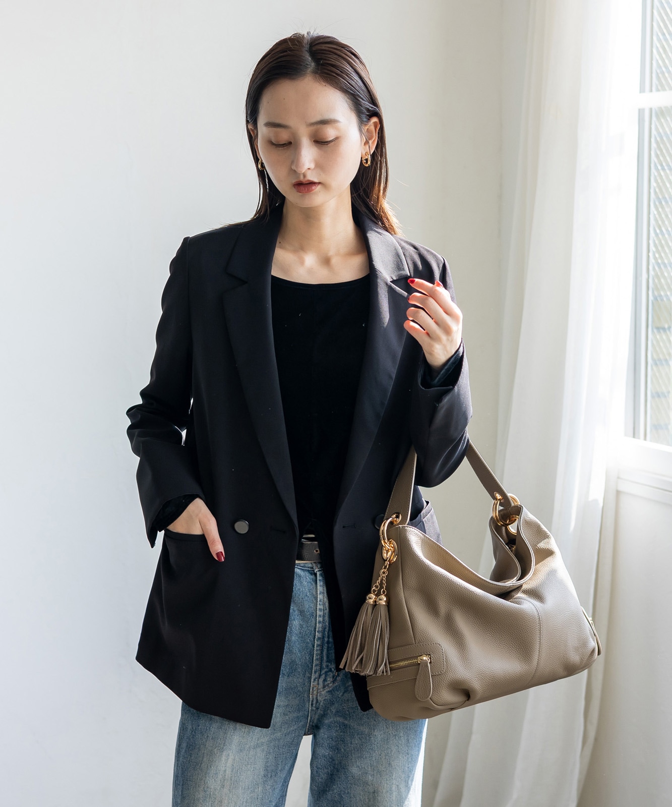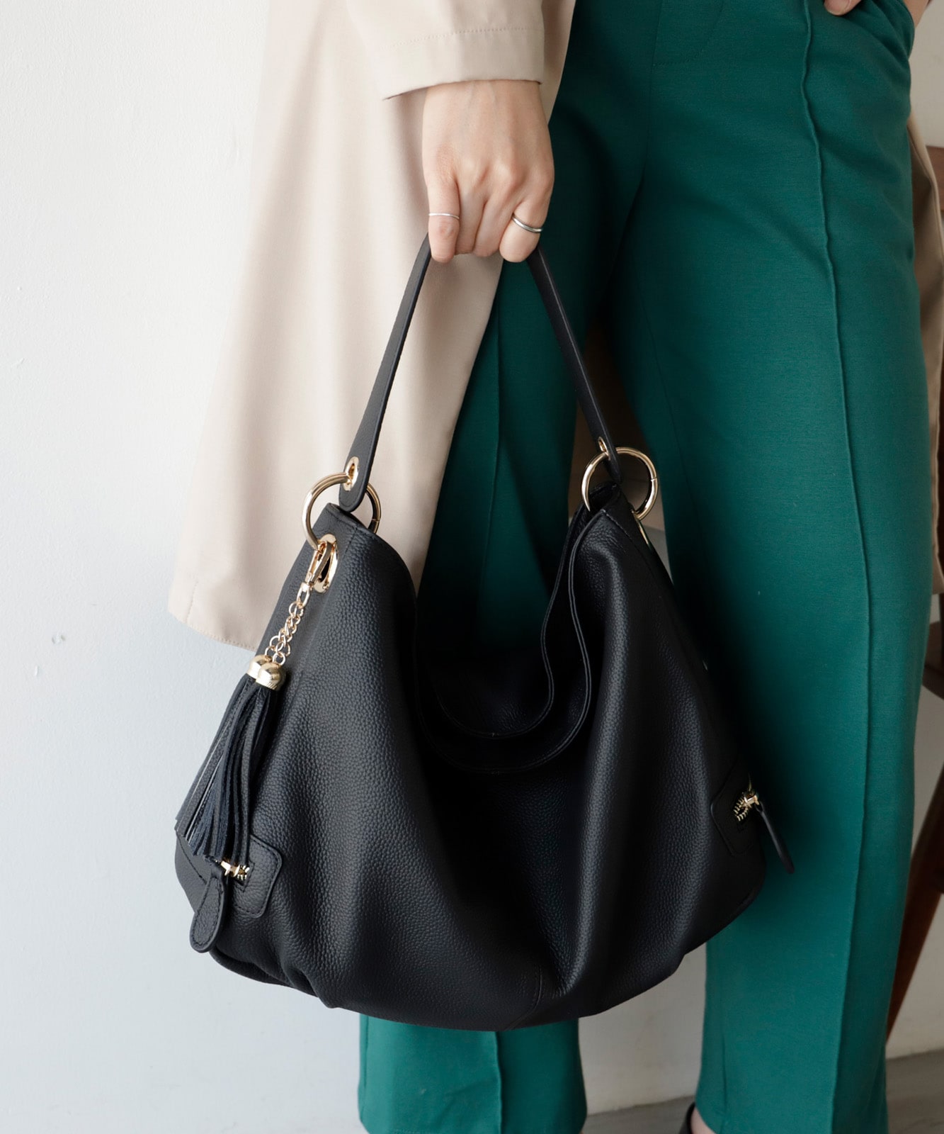 カジュアルにもフォーマルにも合わせやすい、上品で洗練されたルックが魅力です。通勤スタイルにもマッチします。