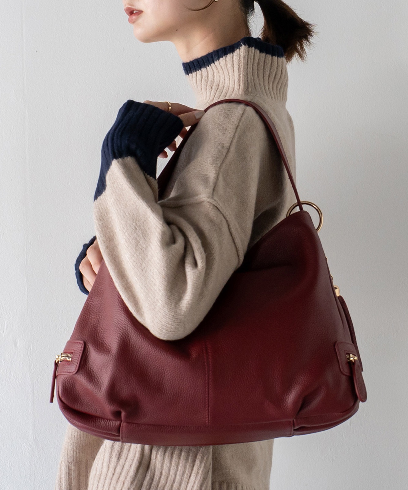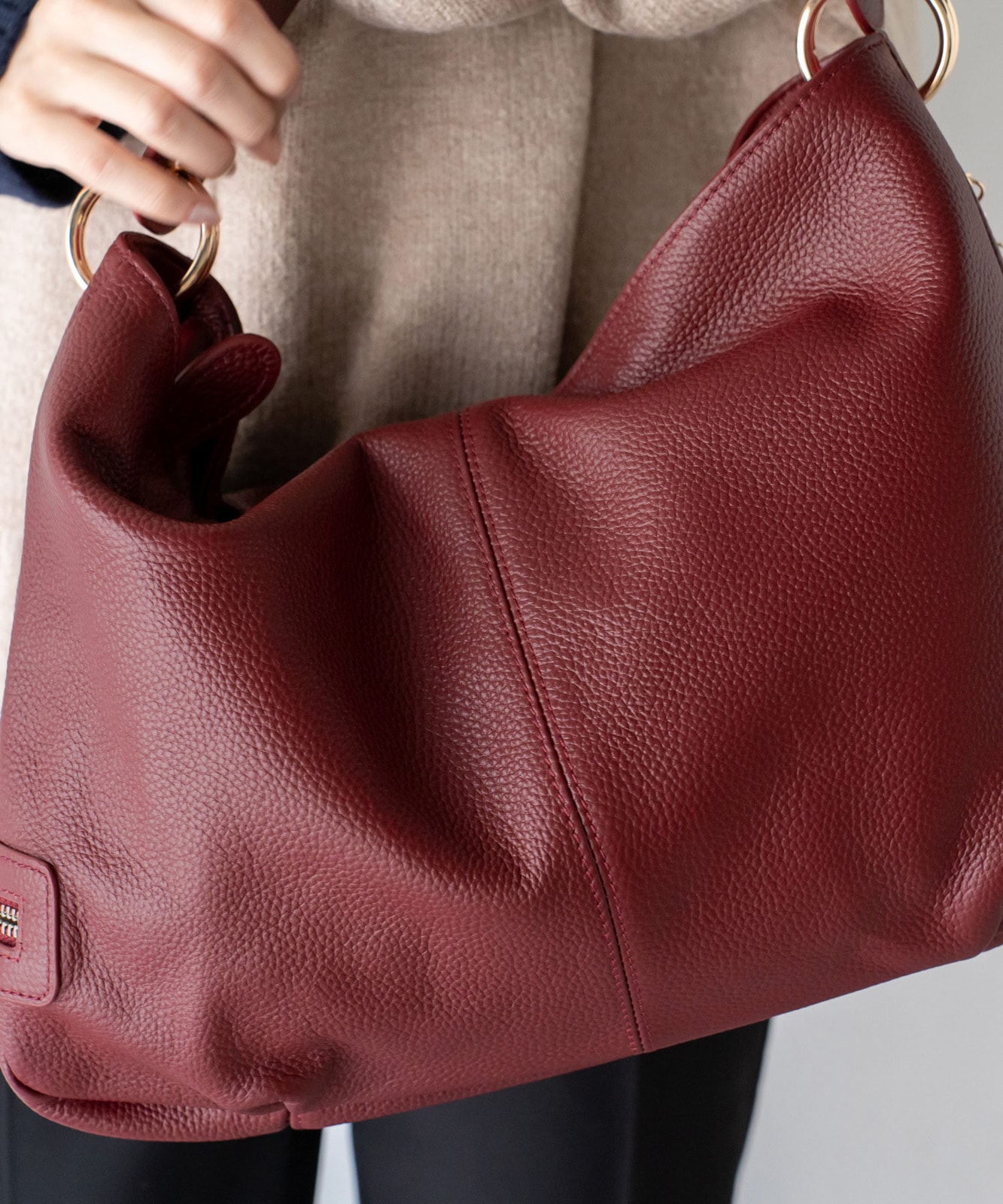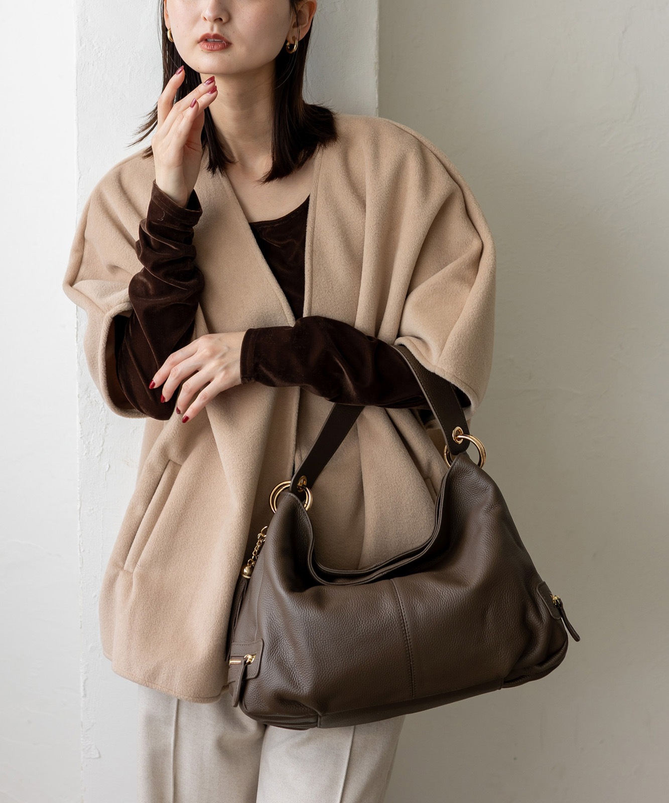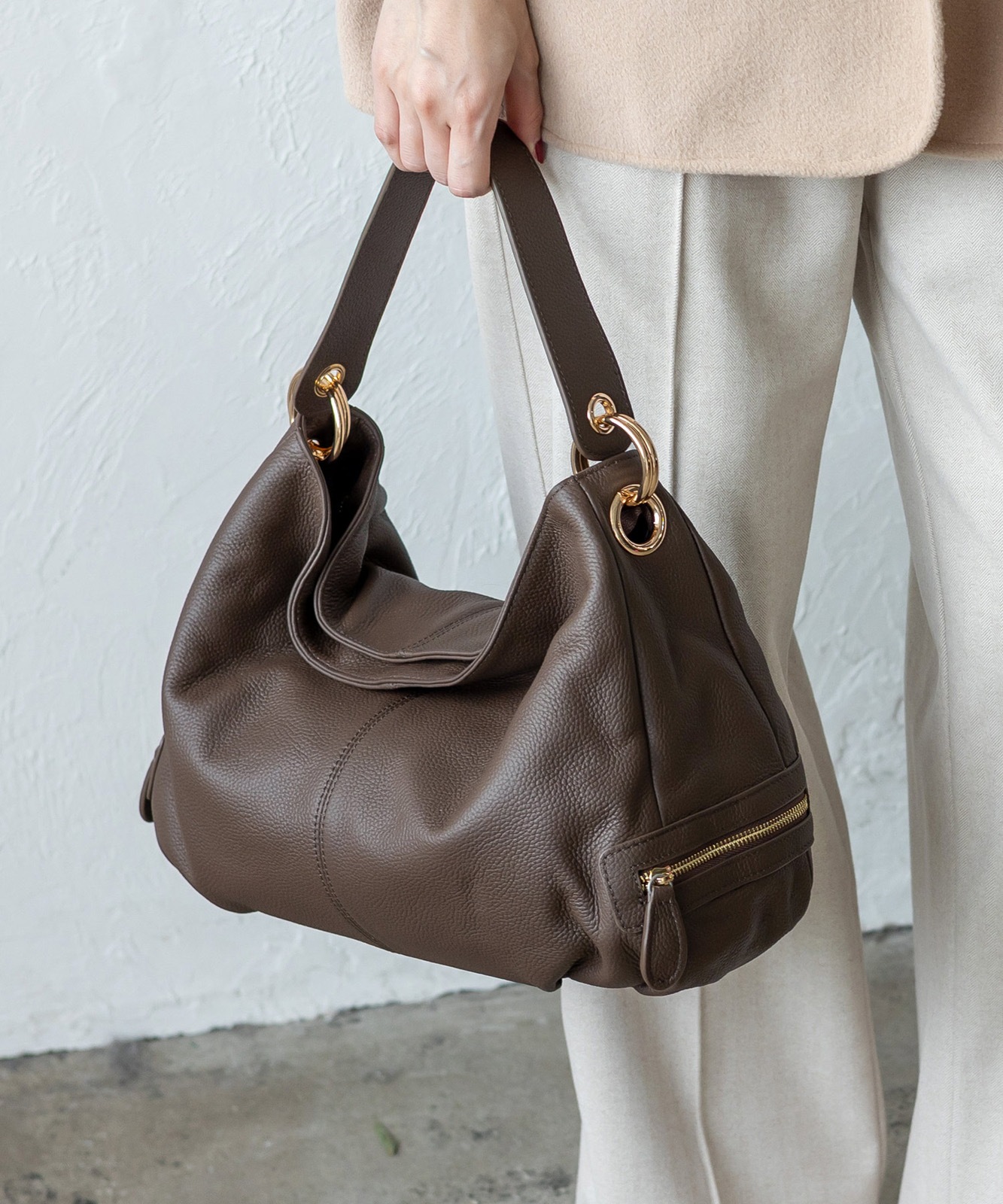 持ち手を持ち上げると、やわらかく丸みのあるシルエットに。大人の女性らしい抜け感をプラスします。