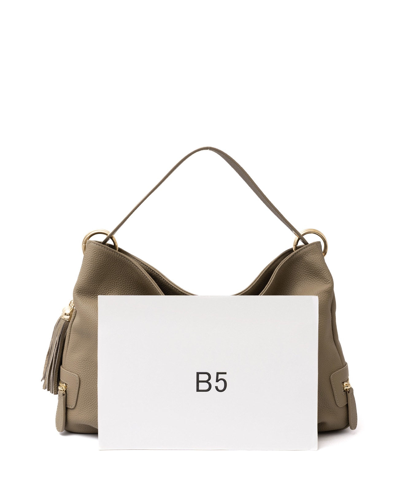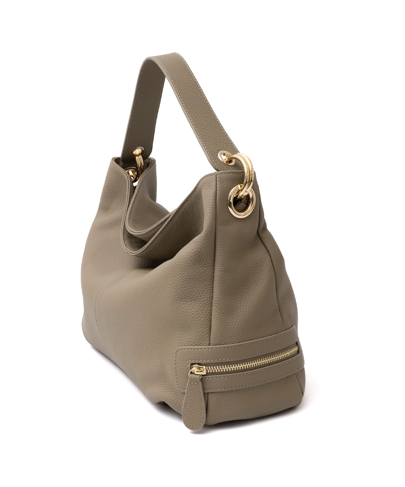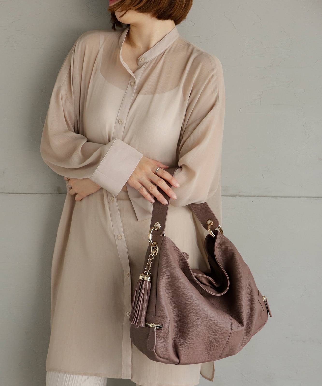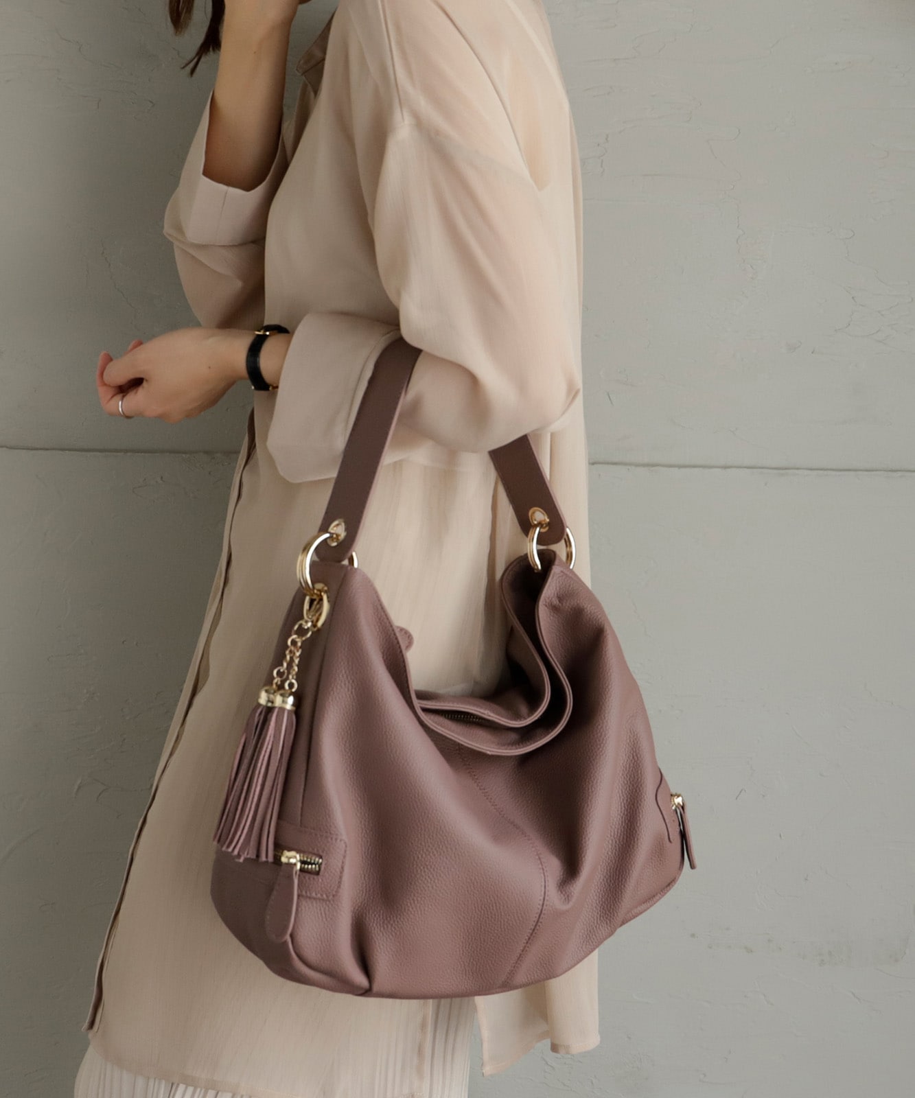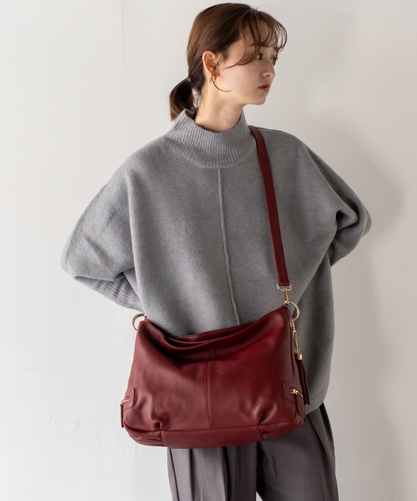 持ち手を持ち上げると、やわらかく丸みのあるシルエットに。大人の女性らしい抜け感をプラスします。