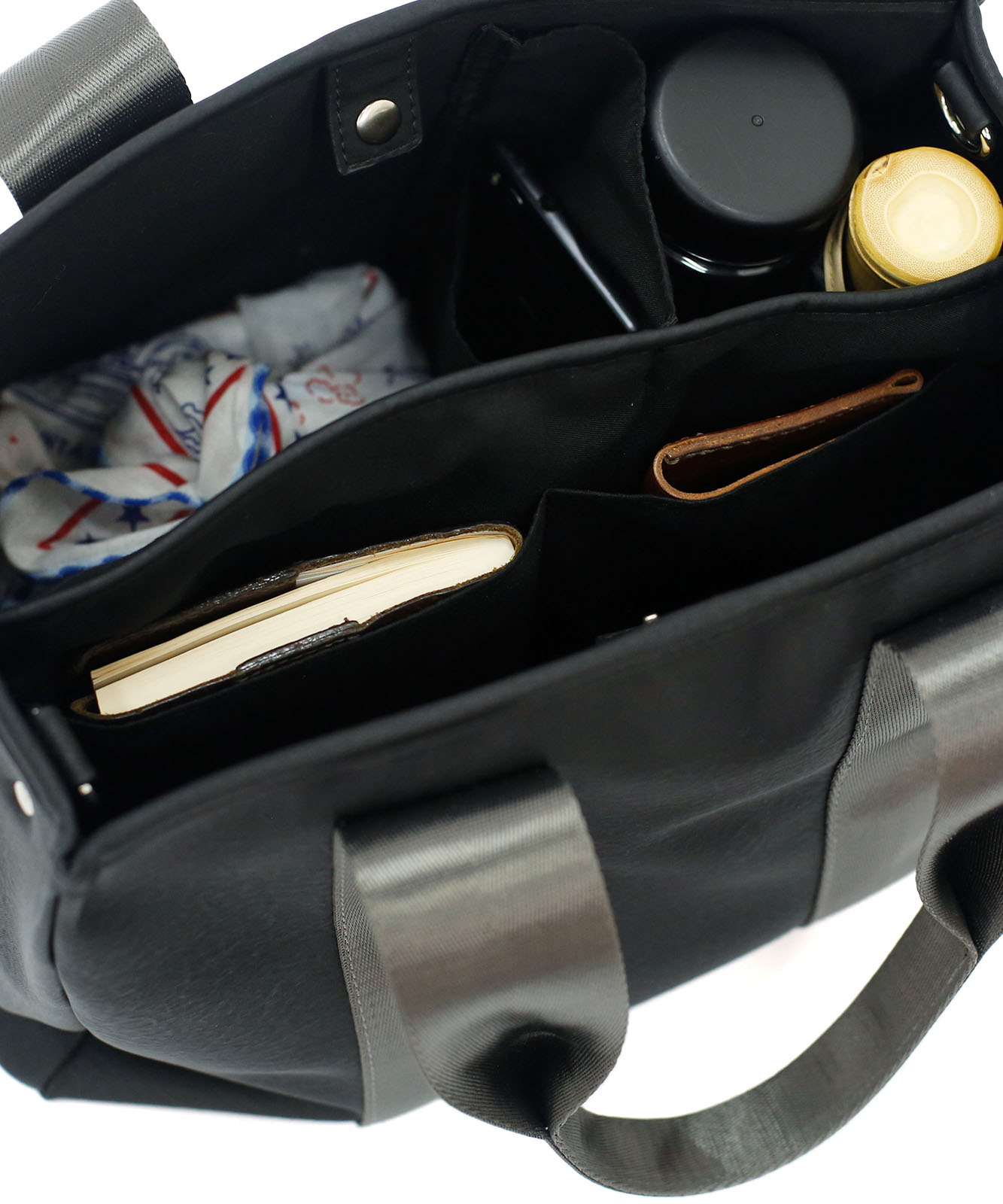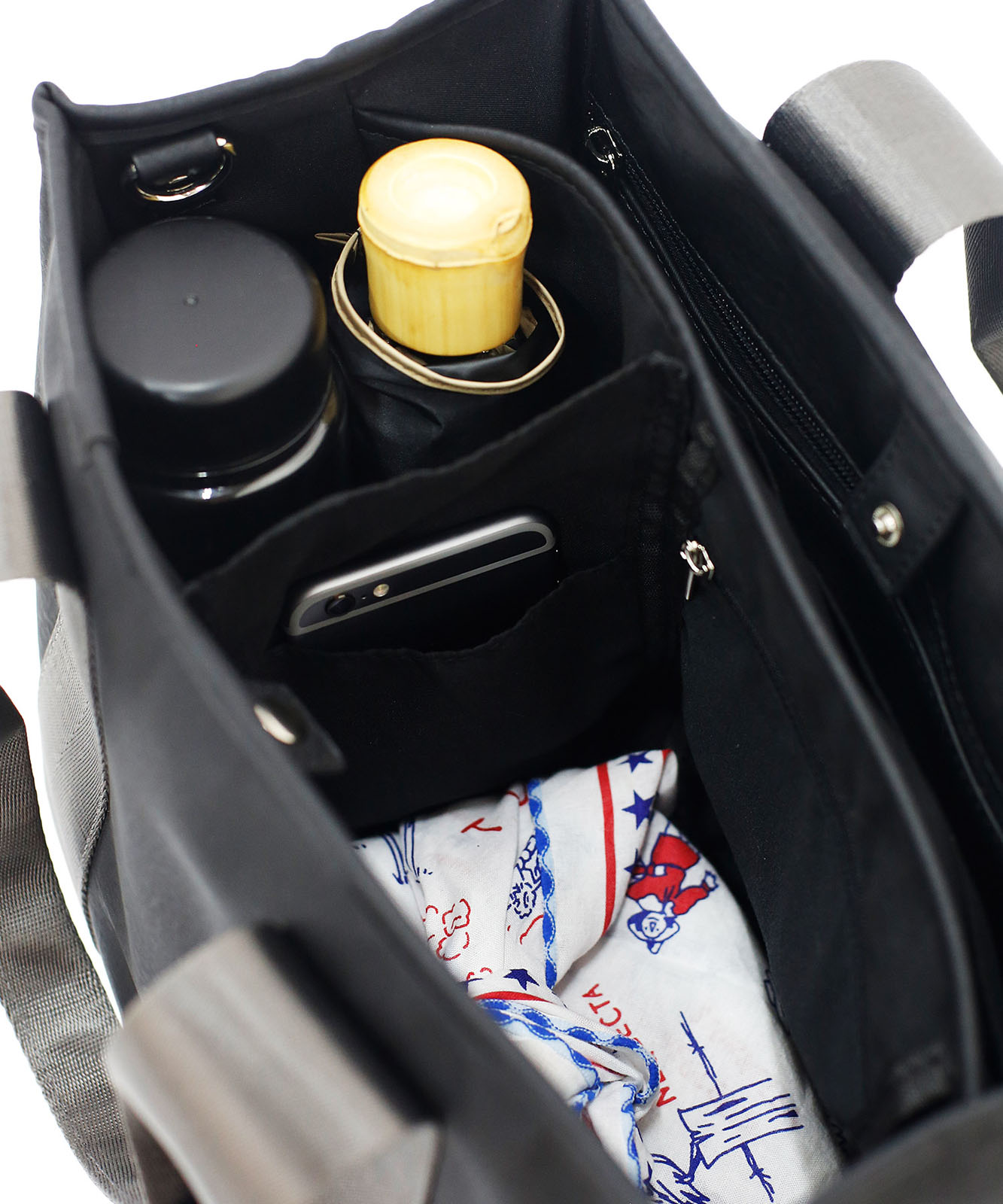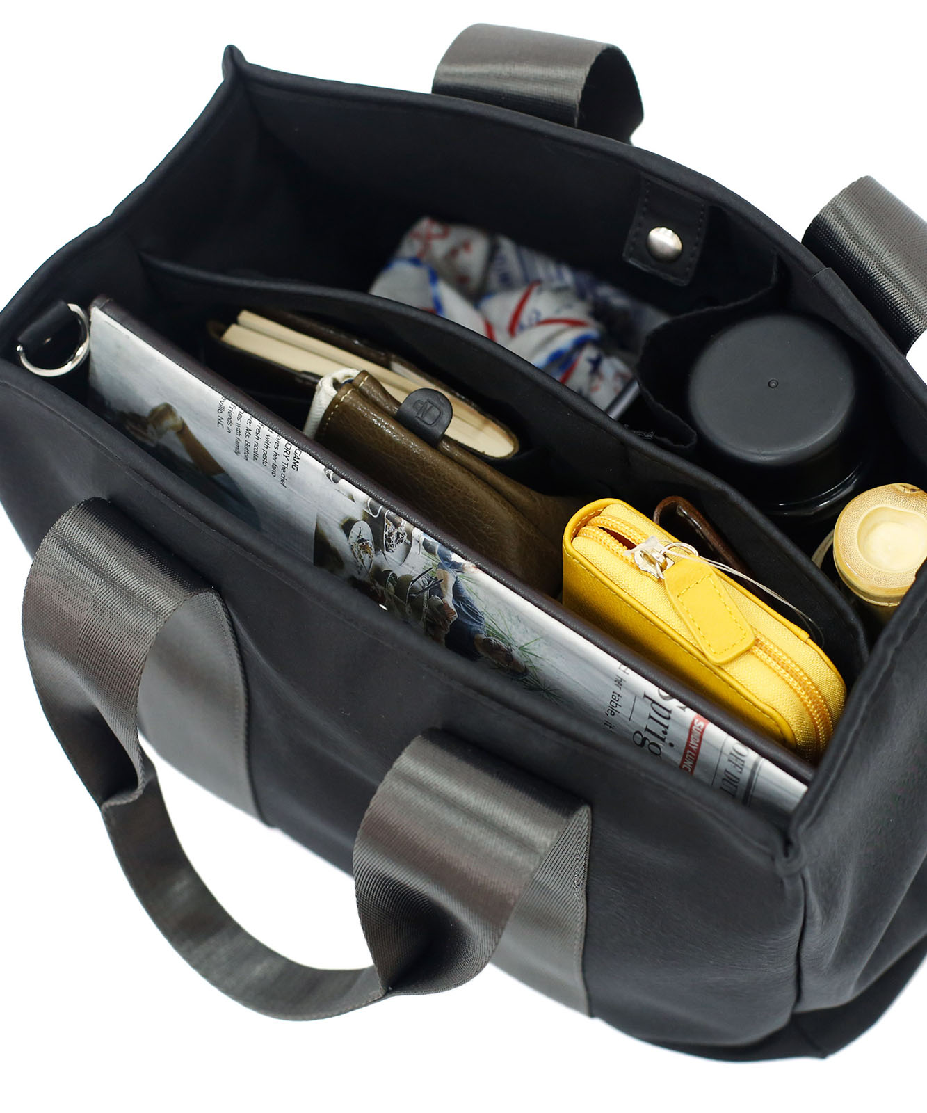 T字の仕切りで中身が見やすくすっきり整理、仕切り収納トートバッグ。