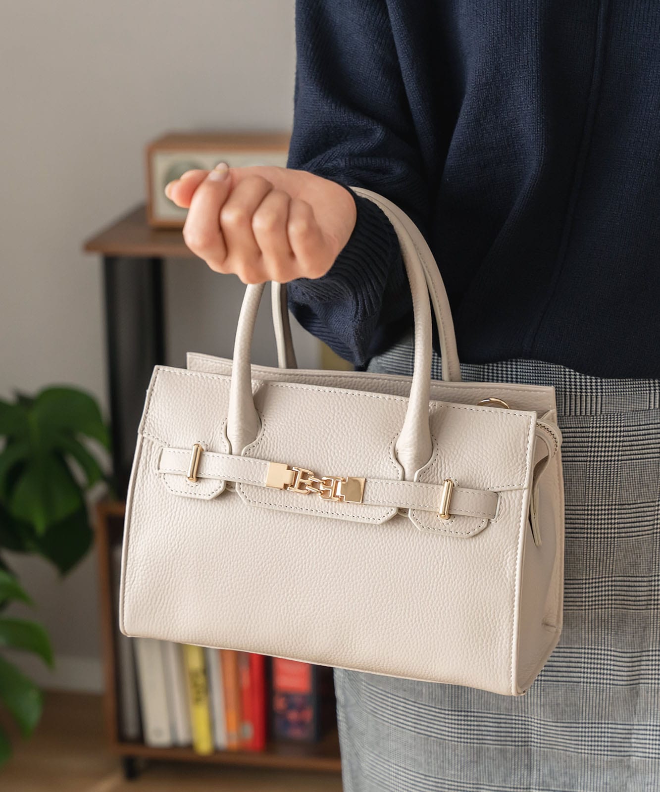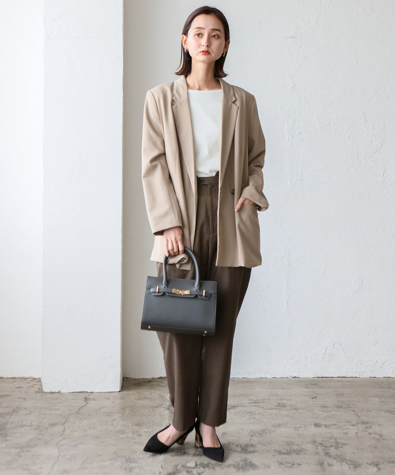 カッチリと四角いシルエットにベルトデザインが女性らしい印象に。
