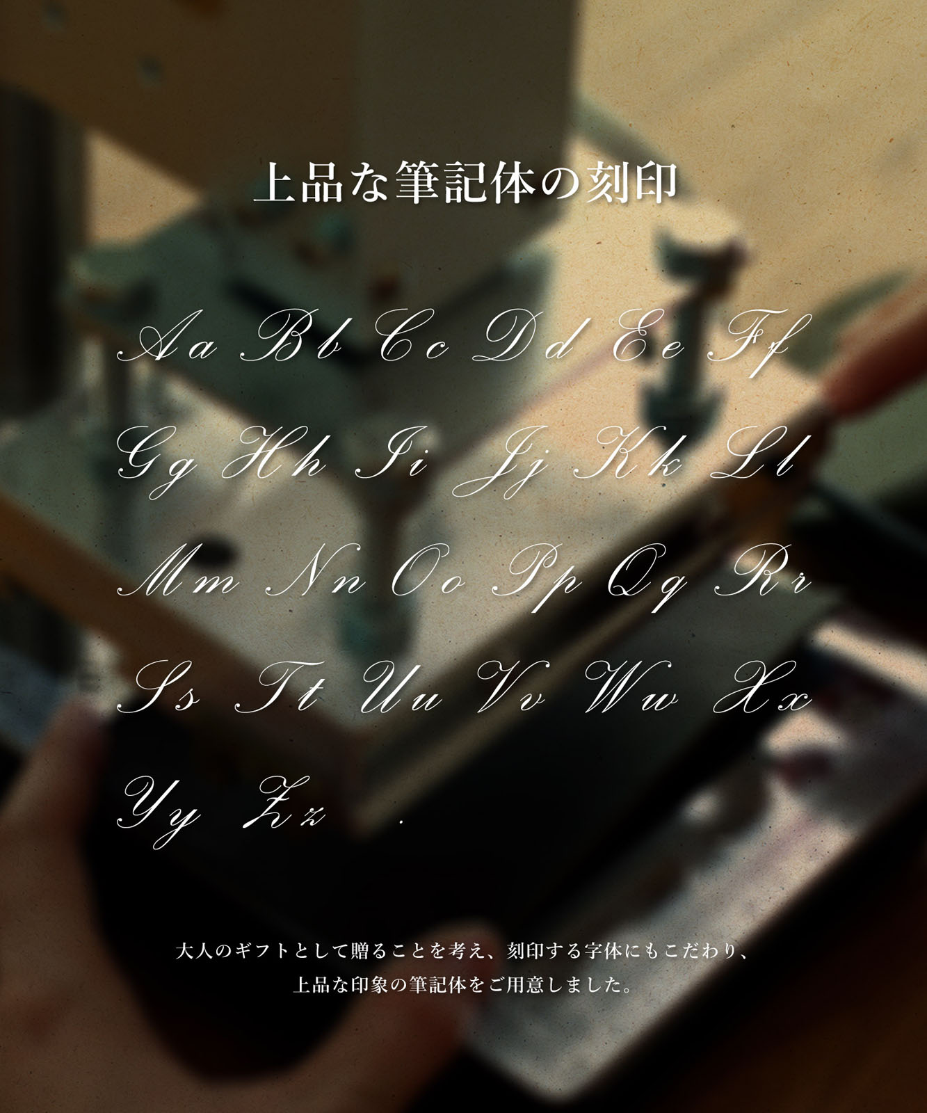 上品な筆記体の刻印で、ギフトやお祝いなどにもオススメ。