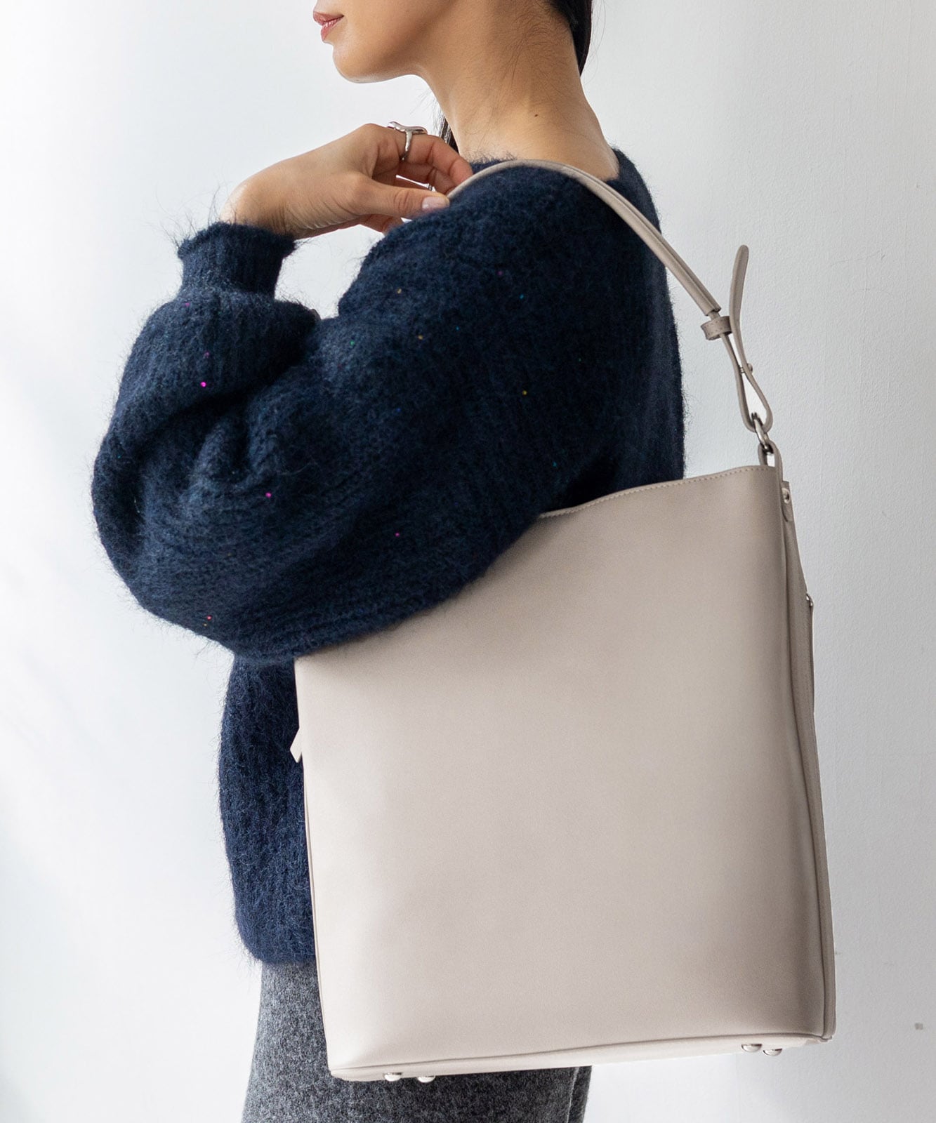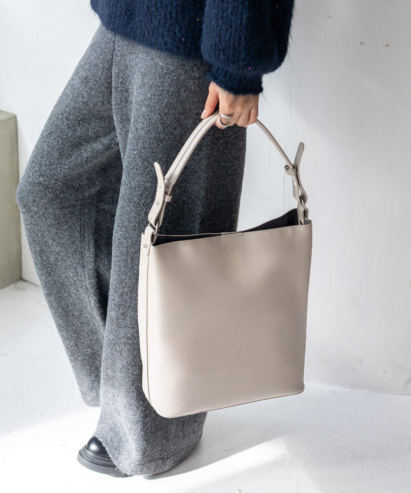 シンプルなのに上品さ漂う、ワンハンドルの縦型トートバッグ。