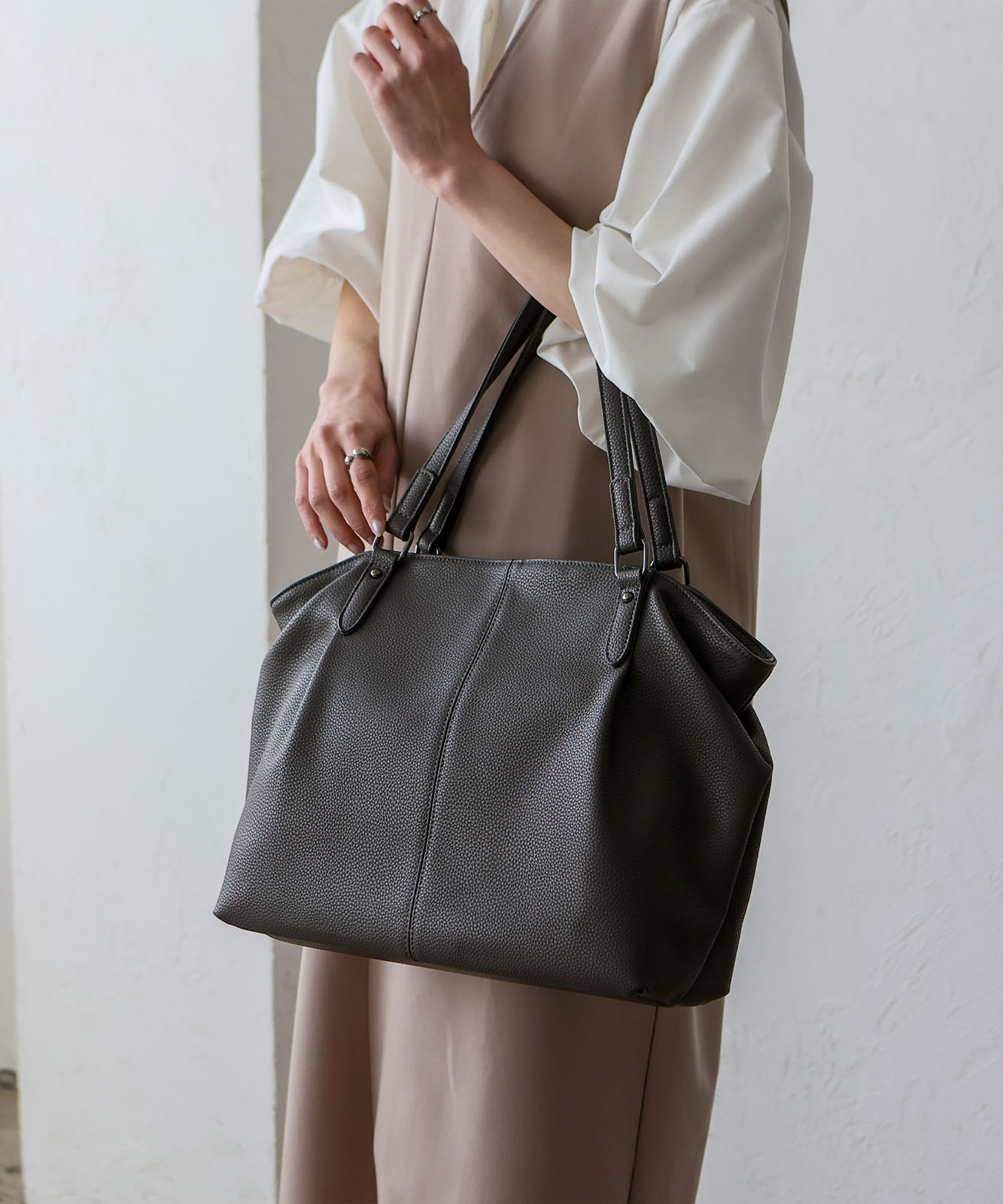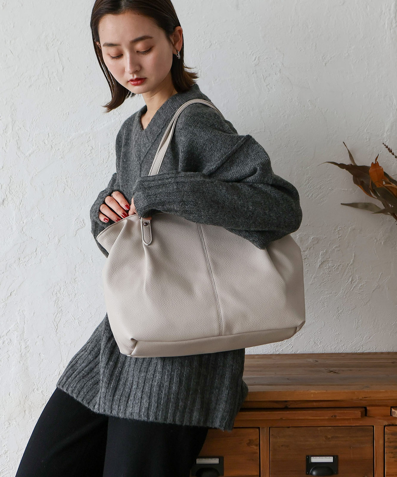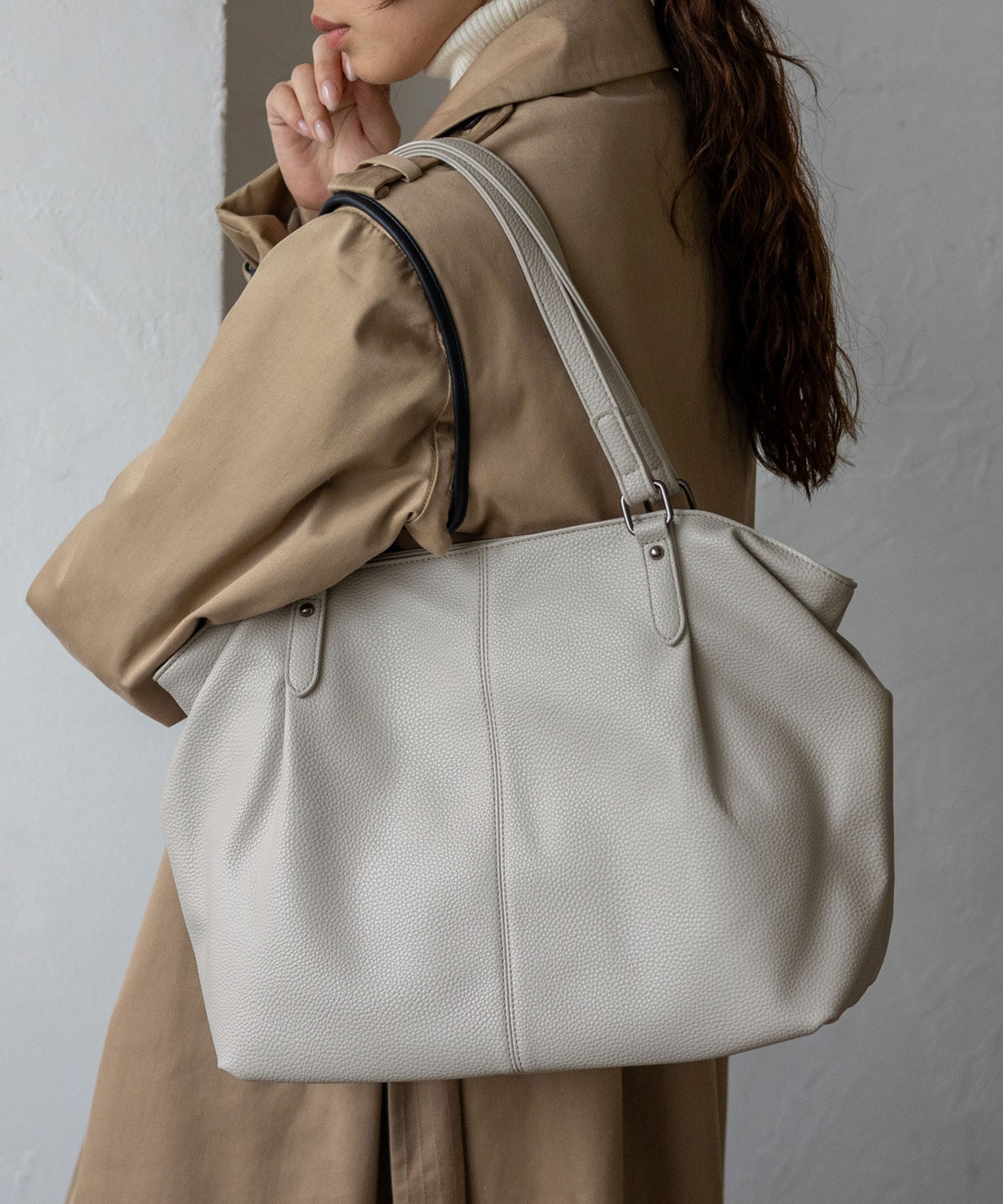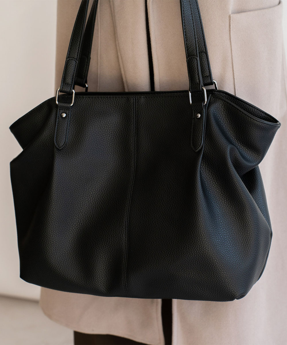 長めのハンドル設計で、厚手アウターの上からでも肩掛けしやすい仕様。デイリーに安心して使える実用的なデザインです。