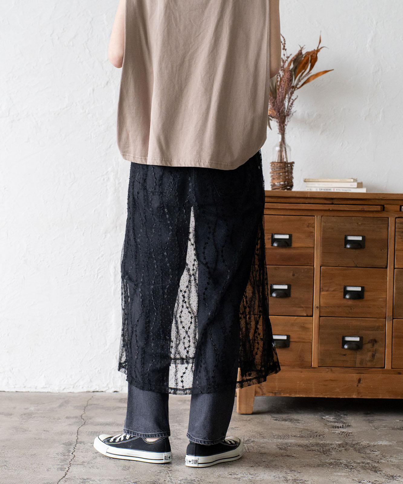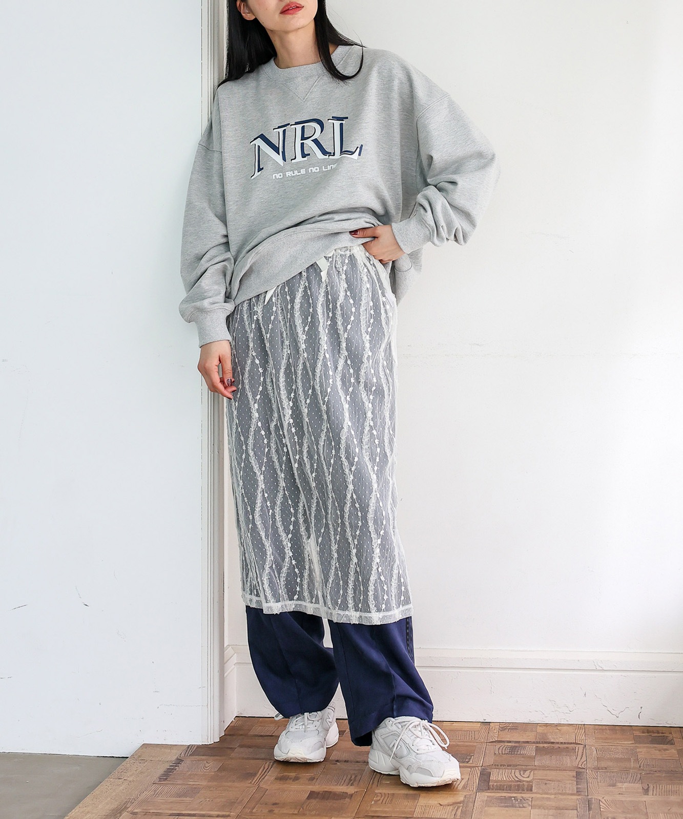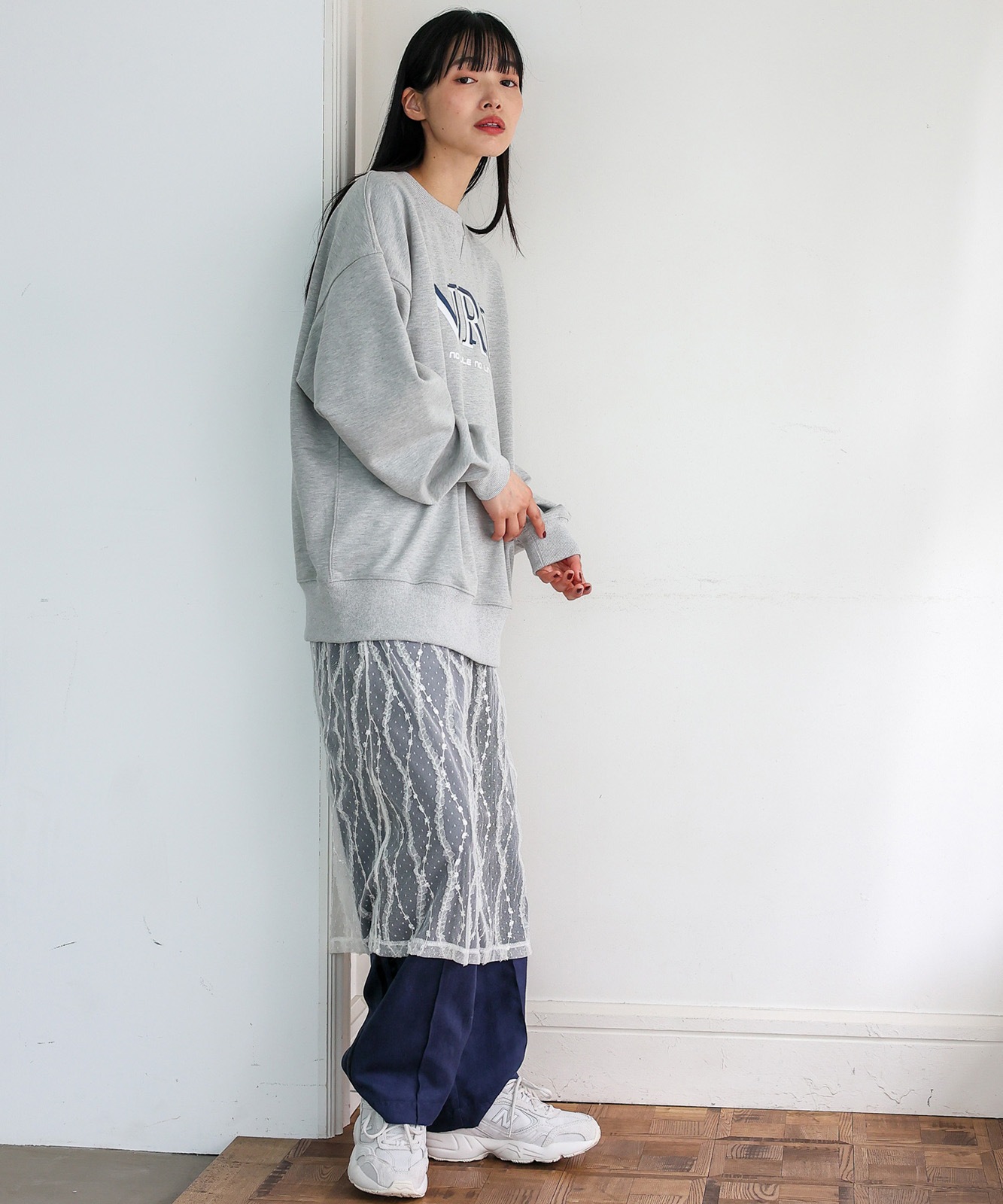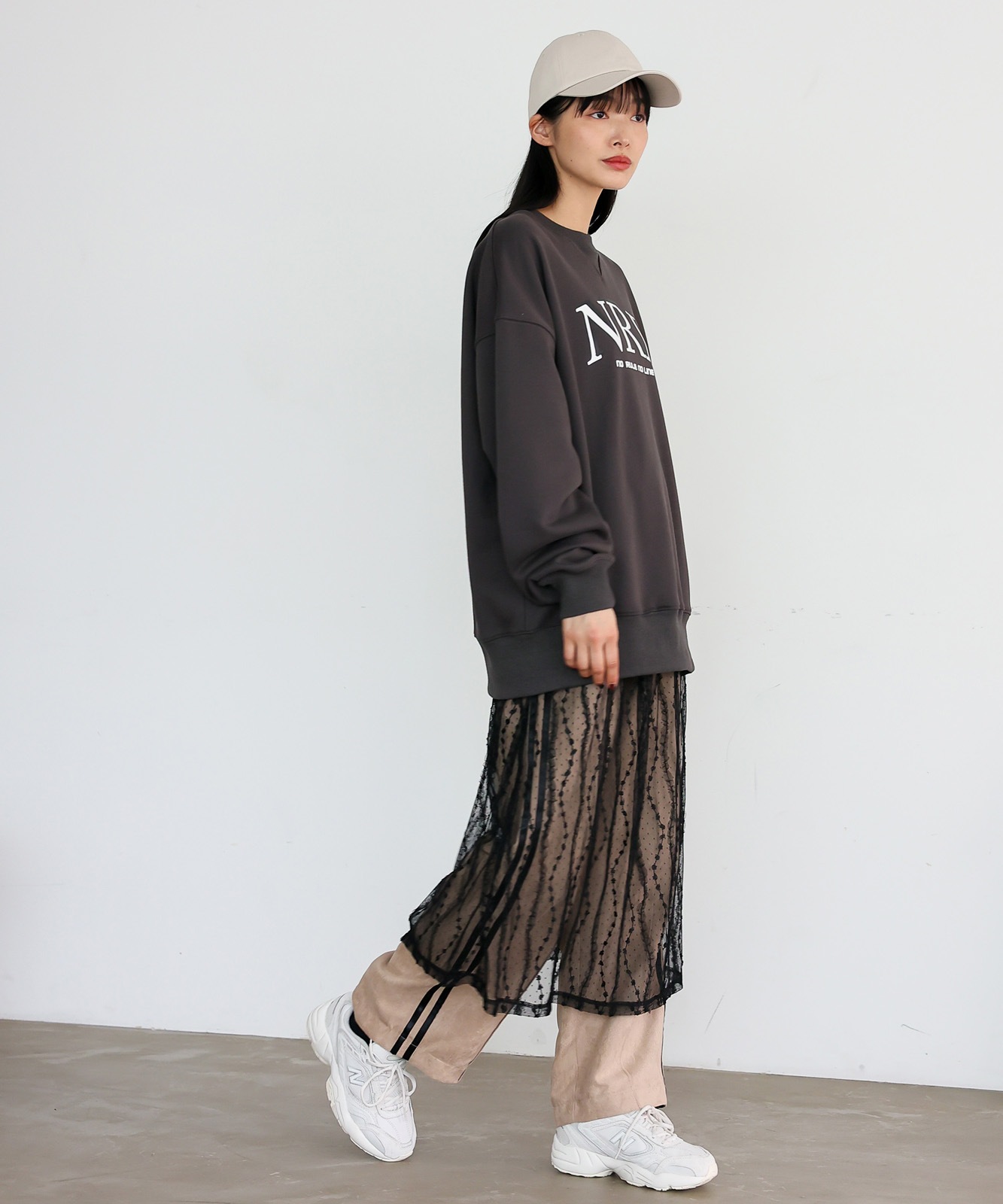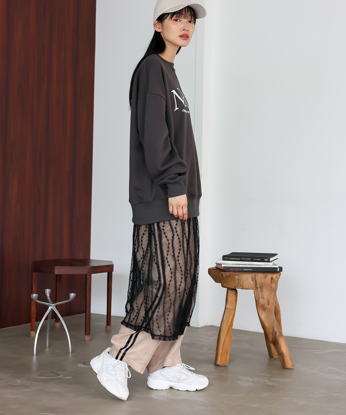 デニムパンツとのレイヤード相性はもちろん、スラックスやジャージ、スカートとのレイヤードも。