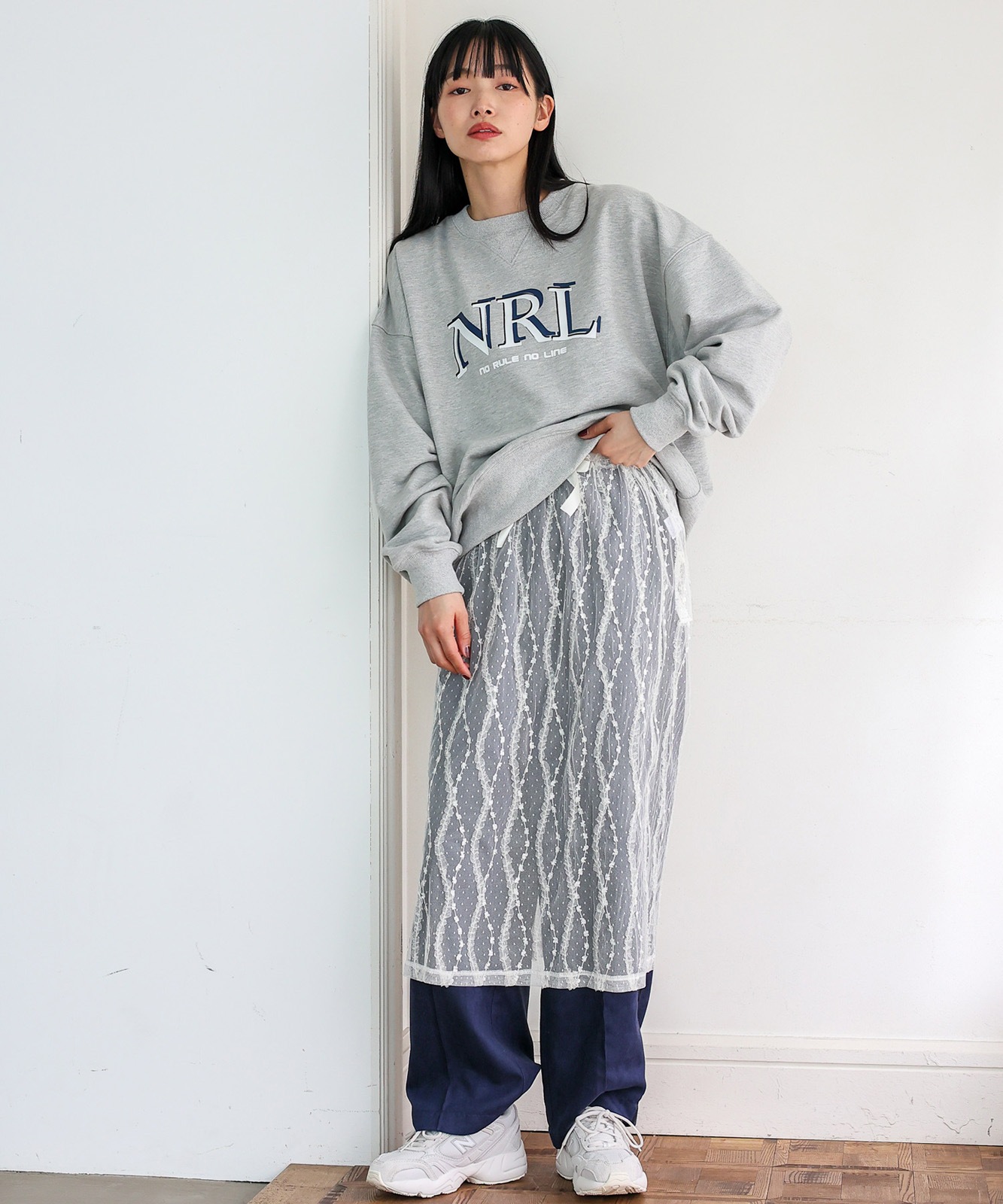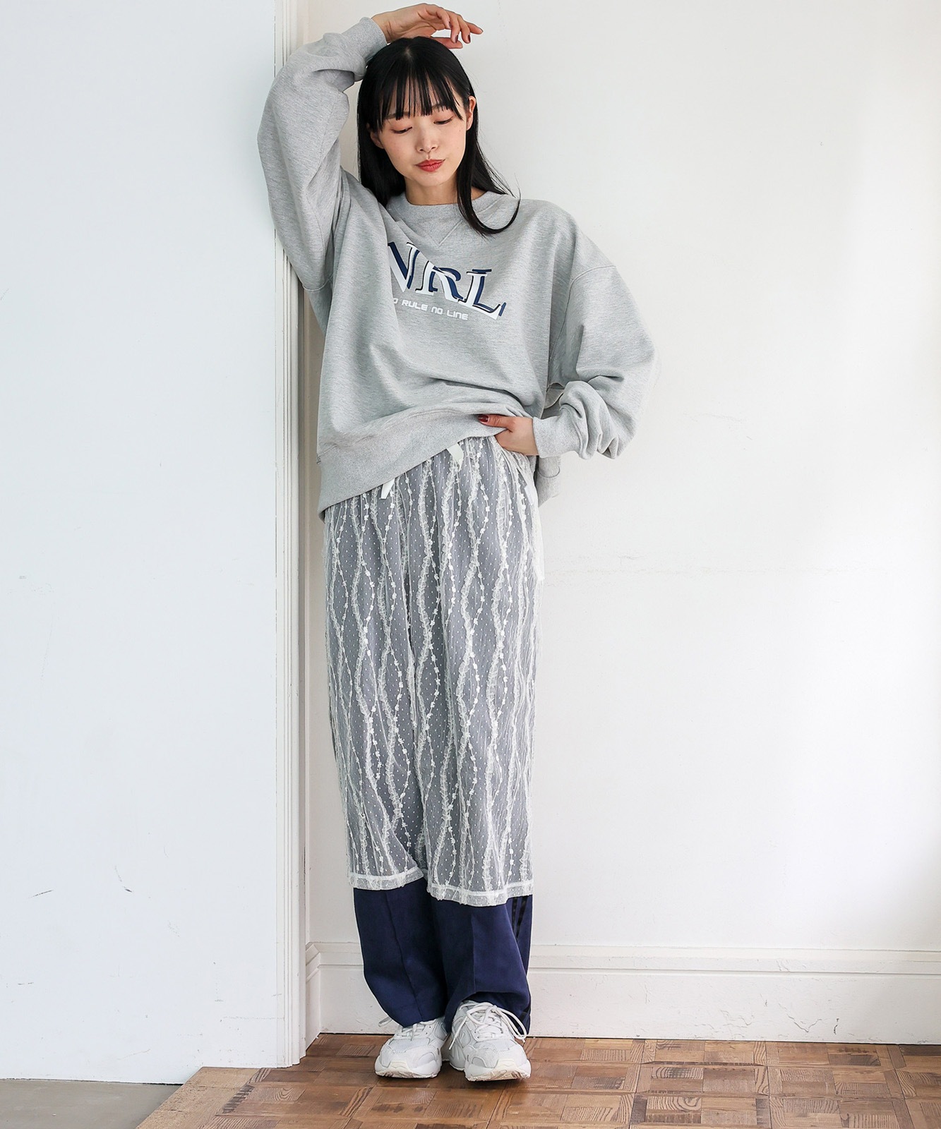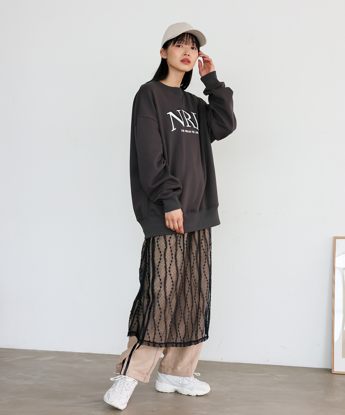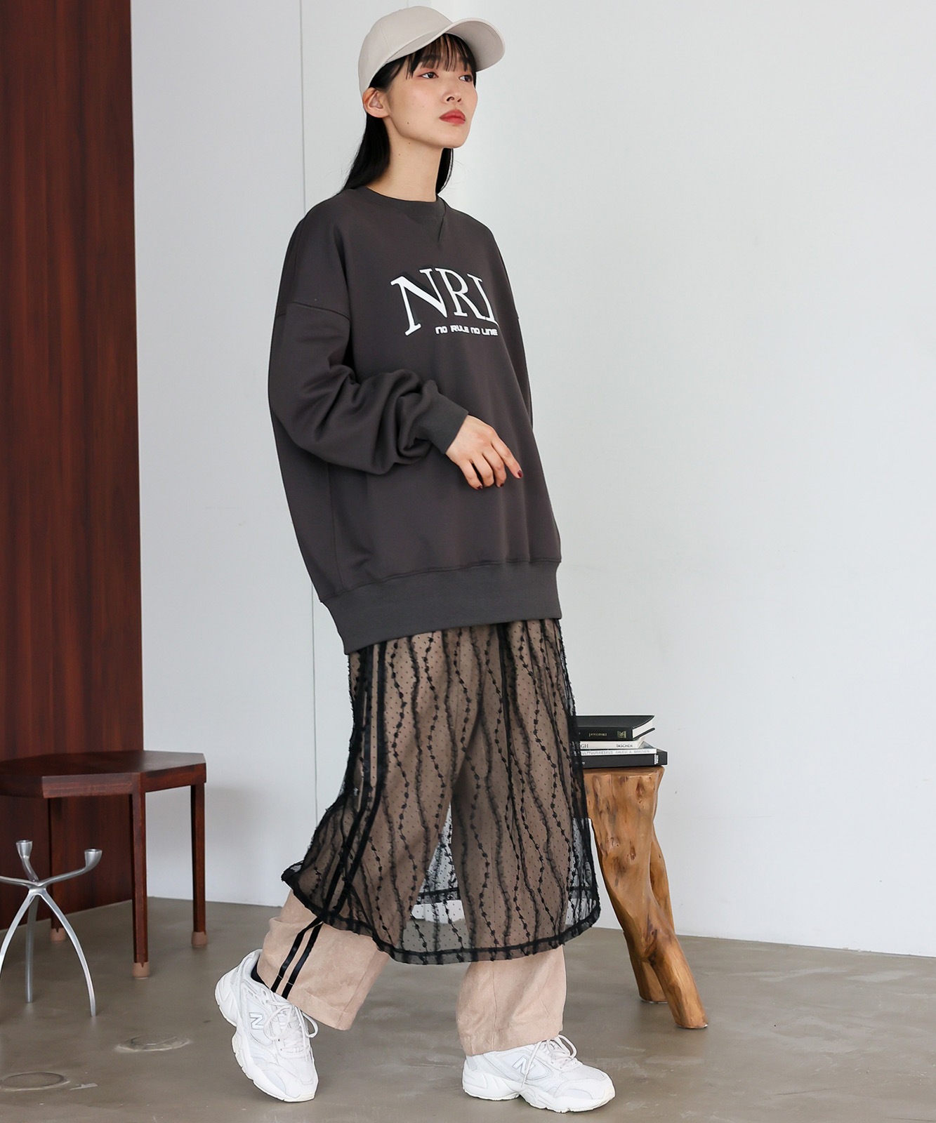 デニムパンツとのレイヤード相性はもちろん、スラックスやジャージ、スカートとのレイヤードも。