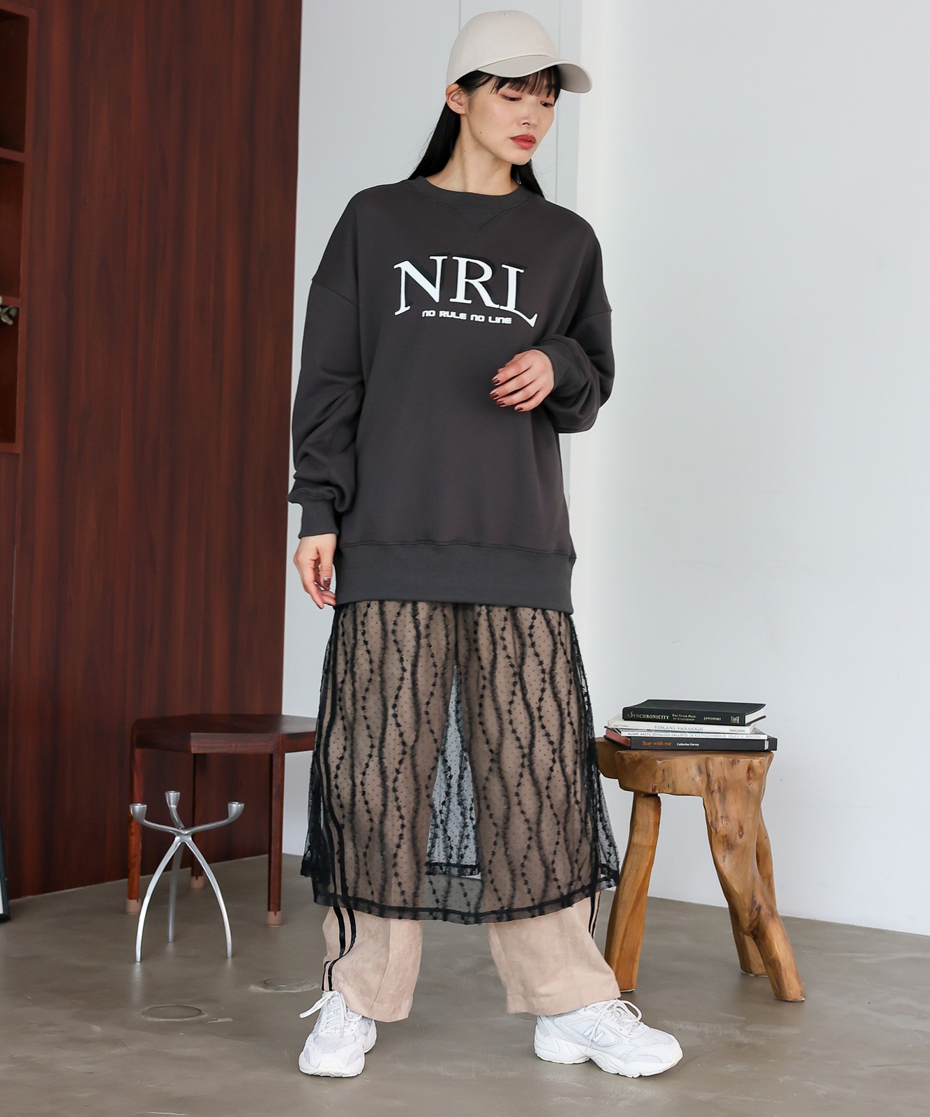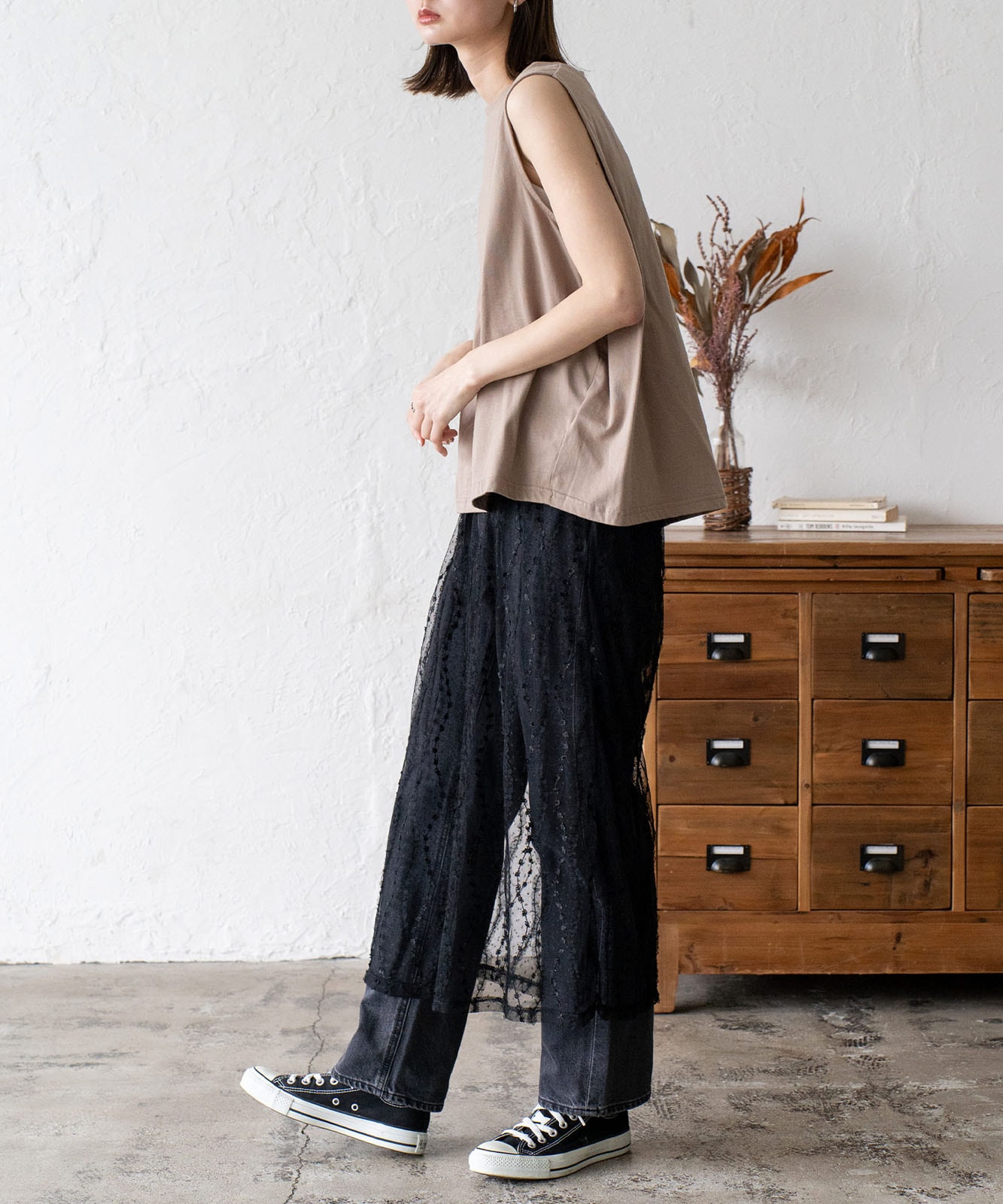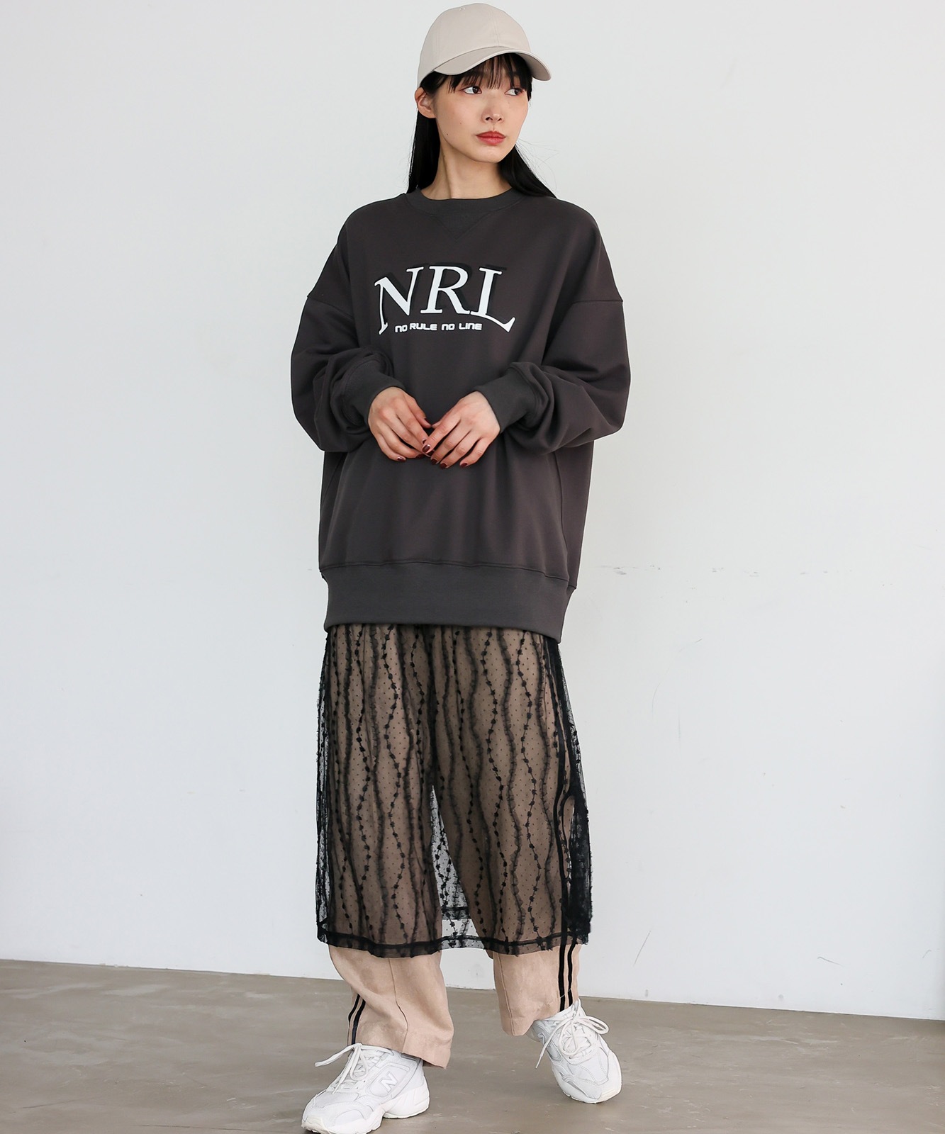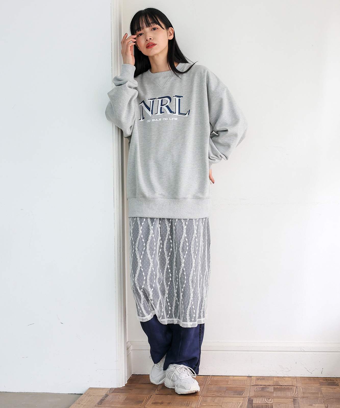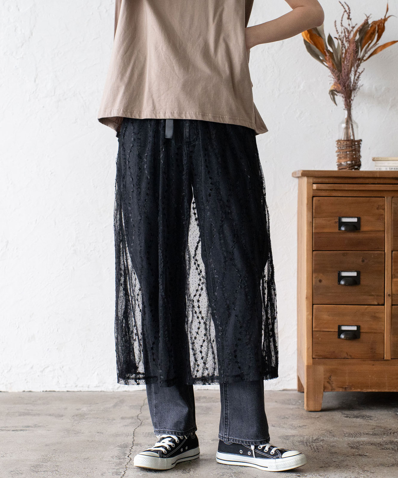 デニムパンツとのレイヤード相性はもちろん、スラックスやジャージ、スカートとのレイヤードも。