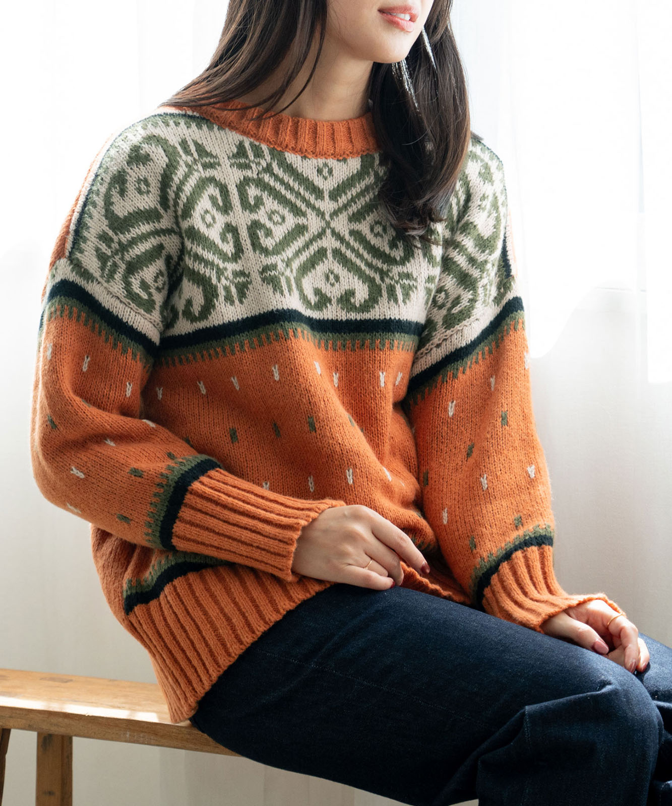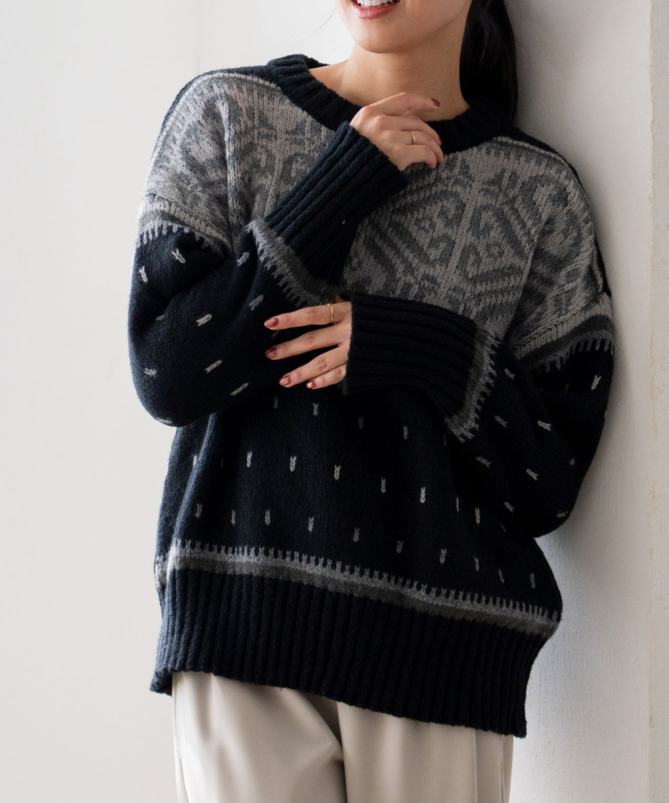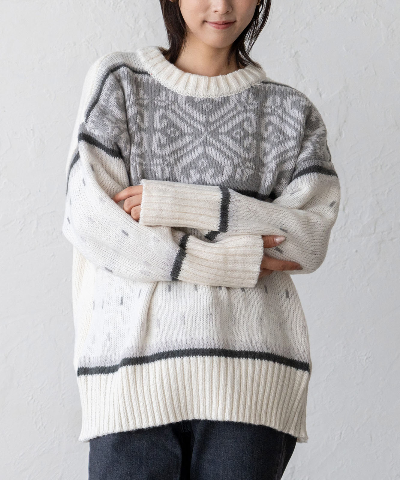 シーズンムードにぴったりのルディック柄で、温かみがあふれる1着。