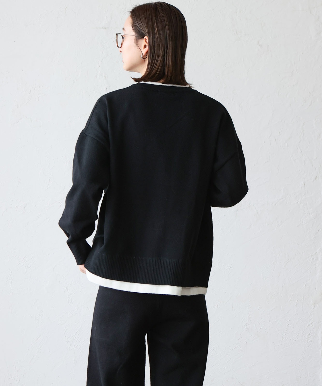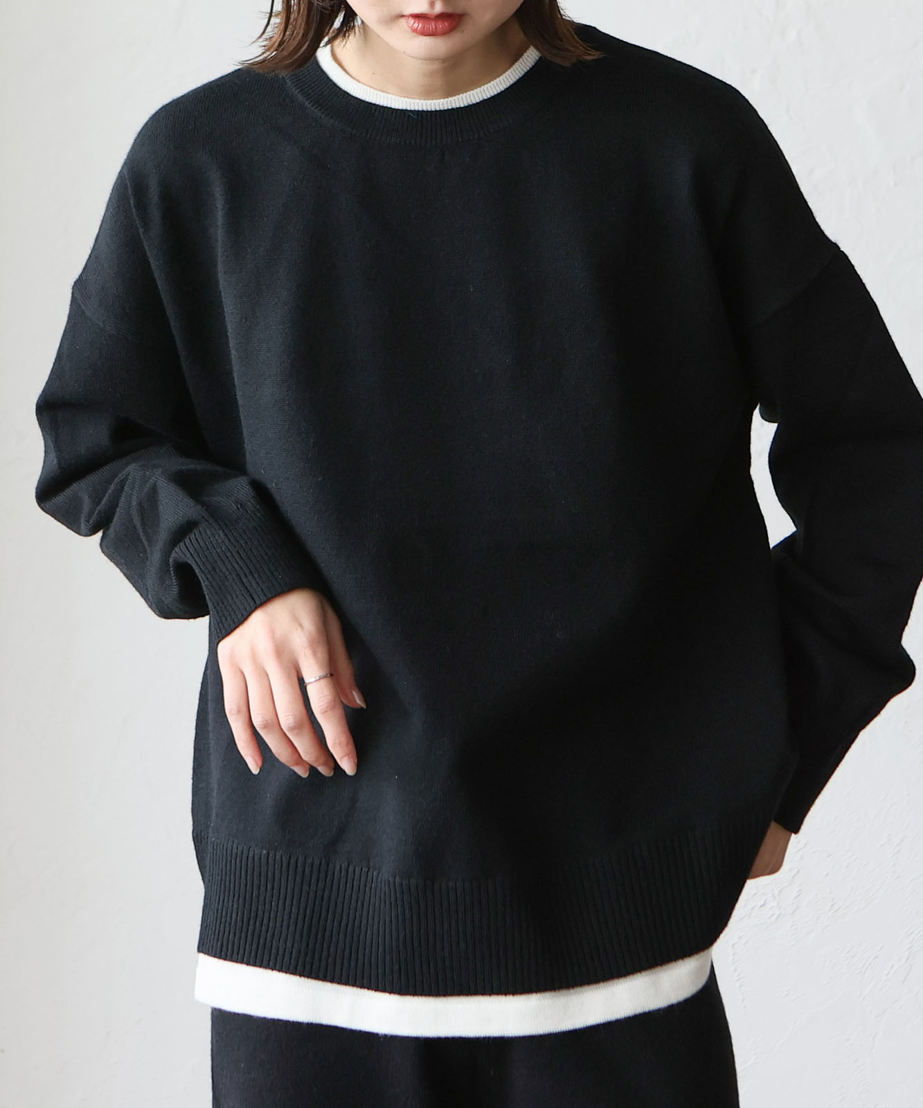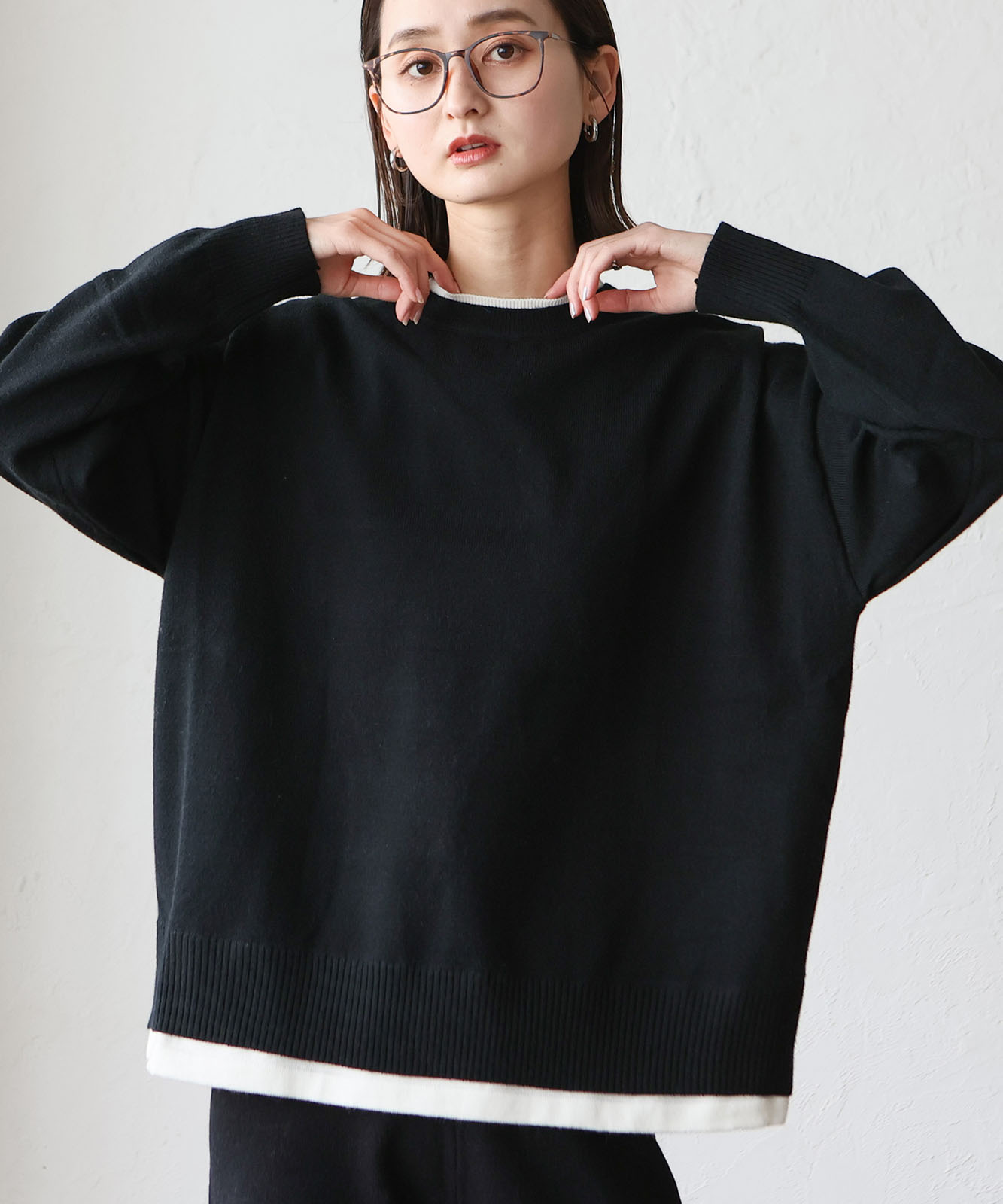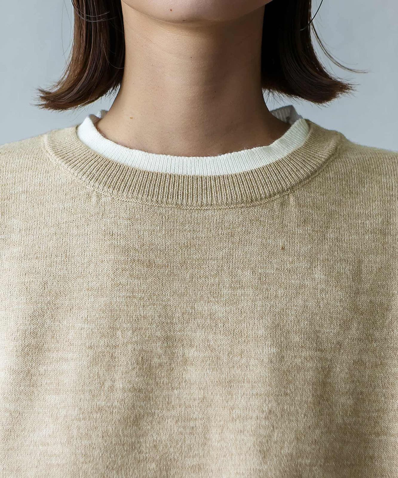 首元と裾部分がレイヤード風のデザインになったトップス、