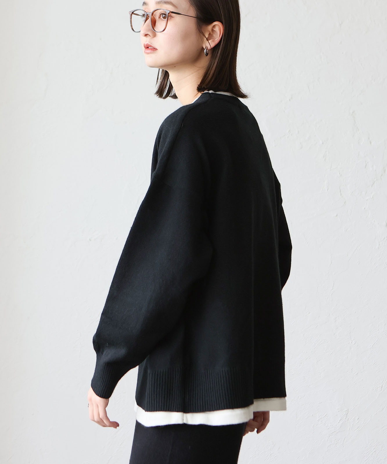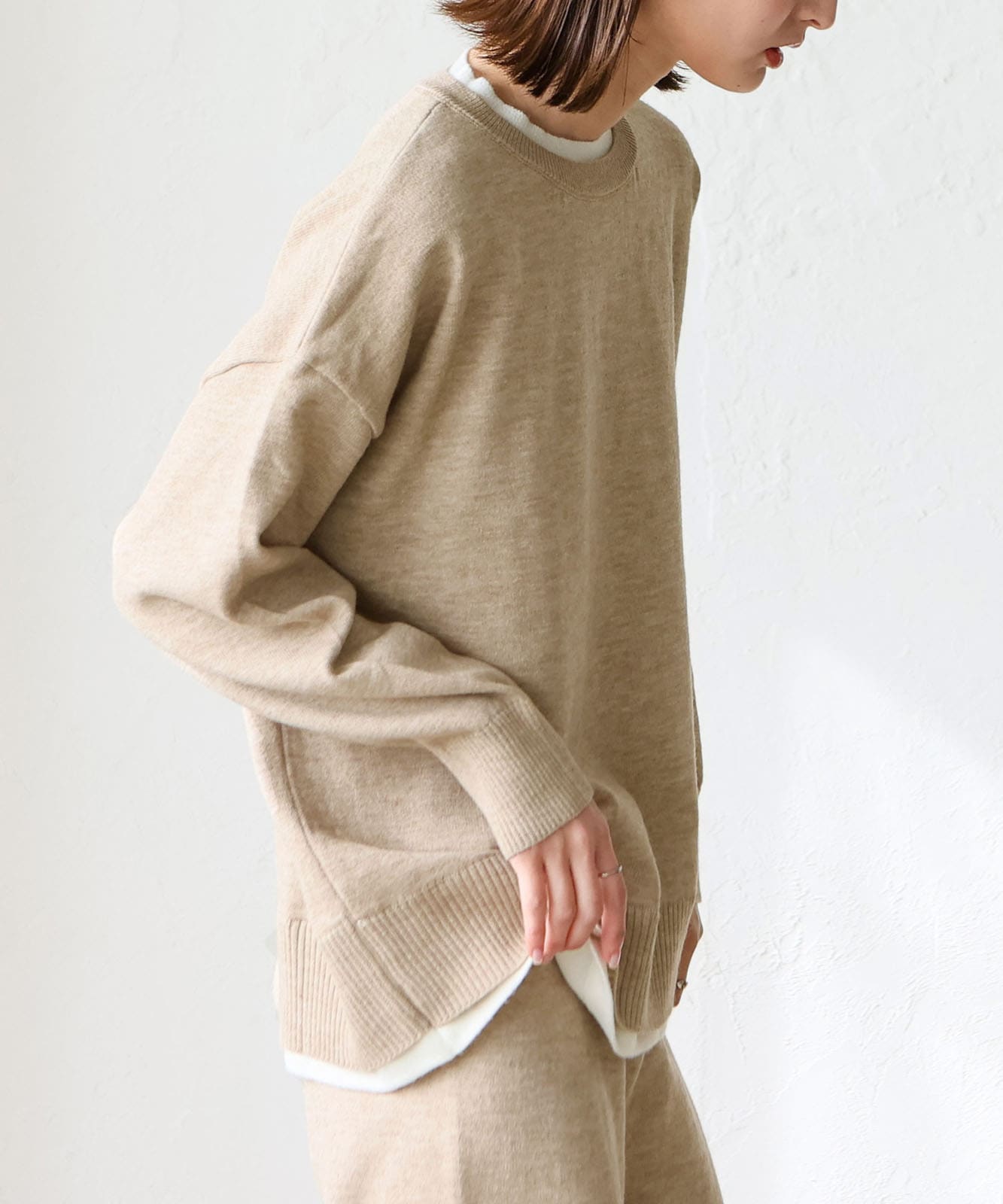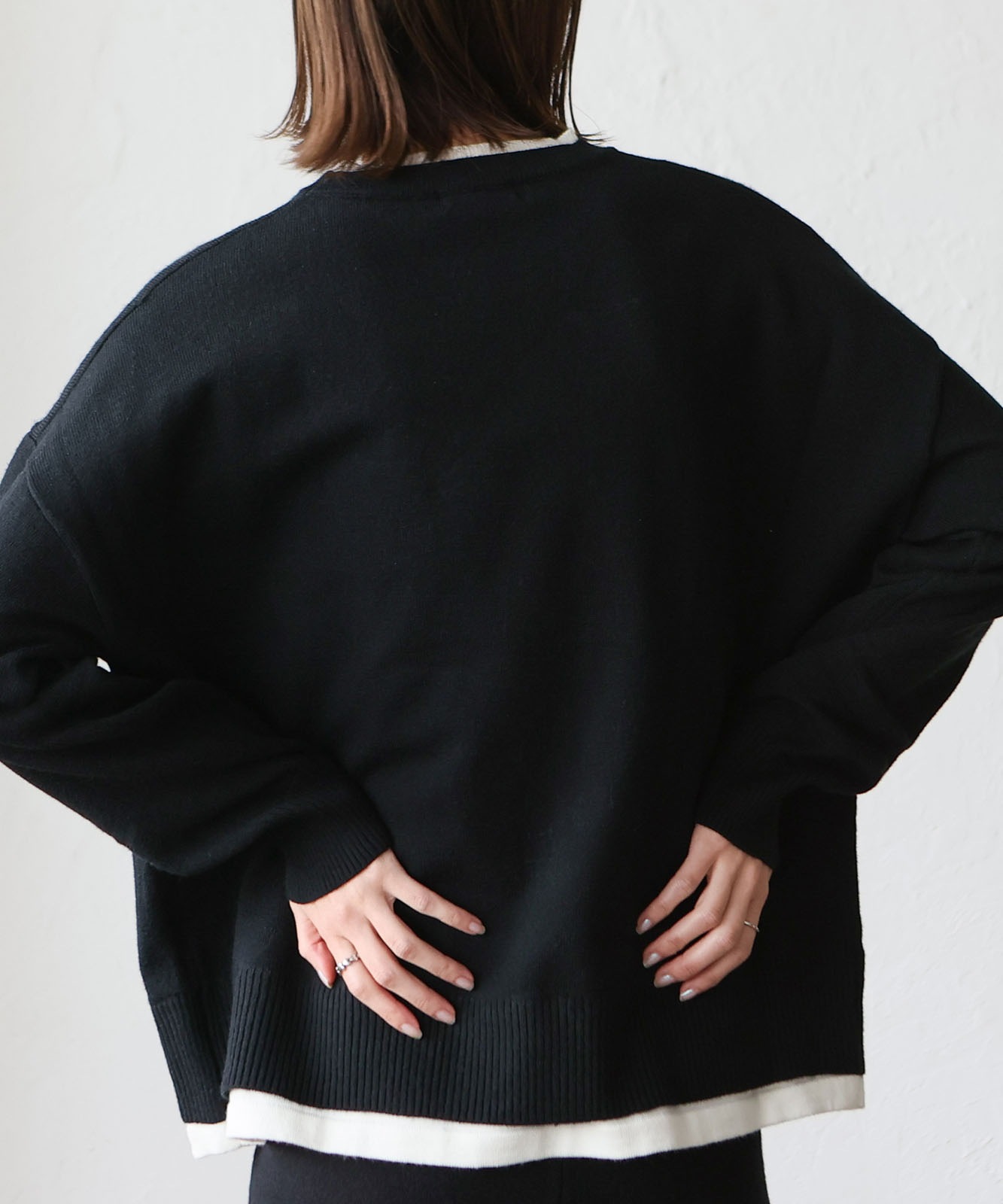 首元と裾部分がレイヤード風のデザインになったトップス、