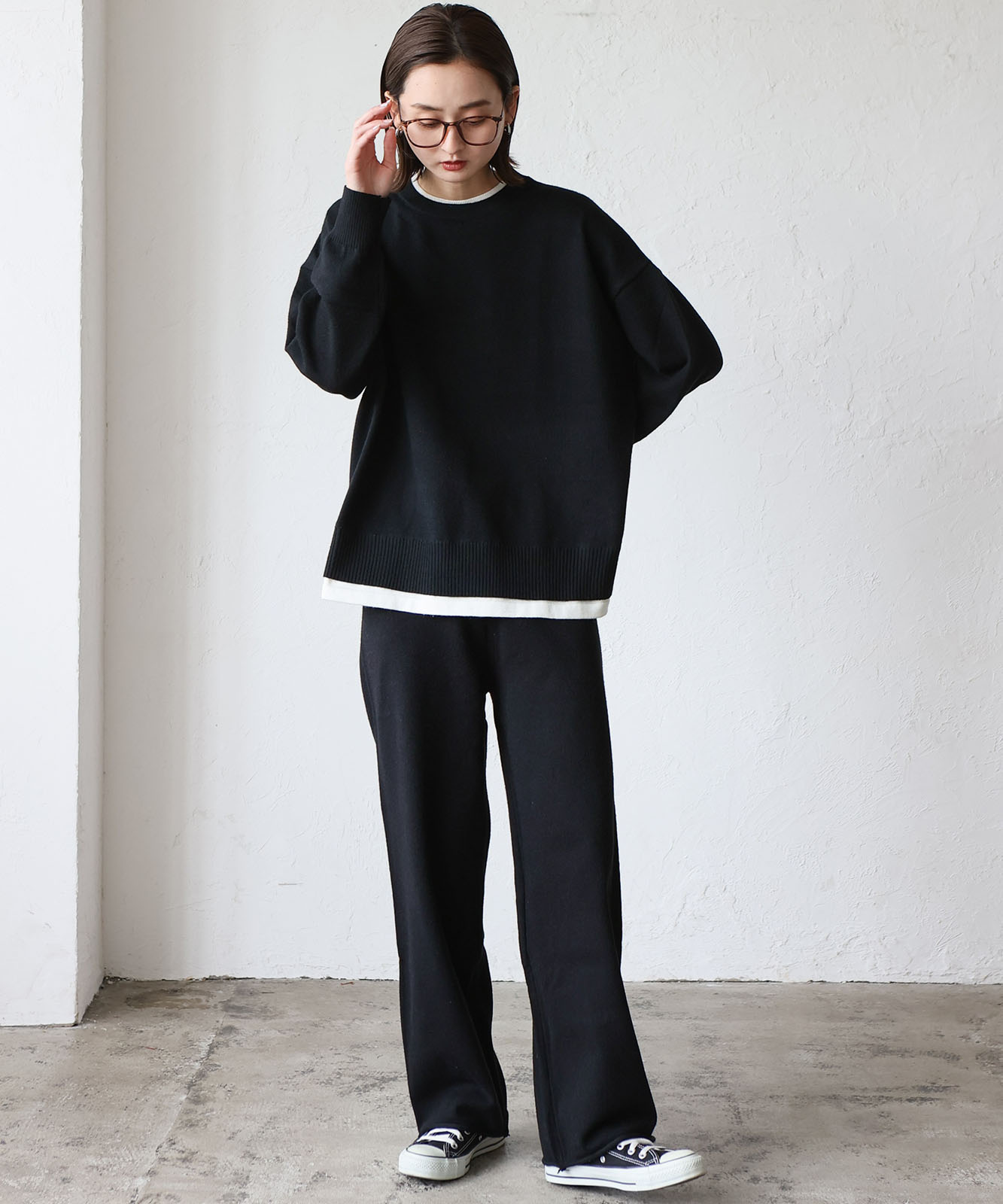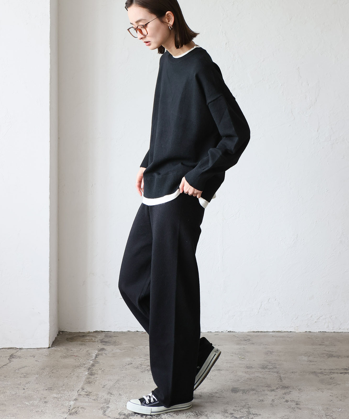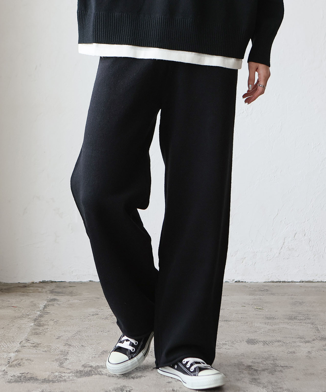 太すぎずゆったり目のワイドシルエットなパンツがこなれ感と抜け感を演出。