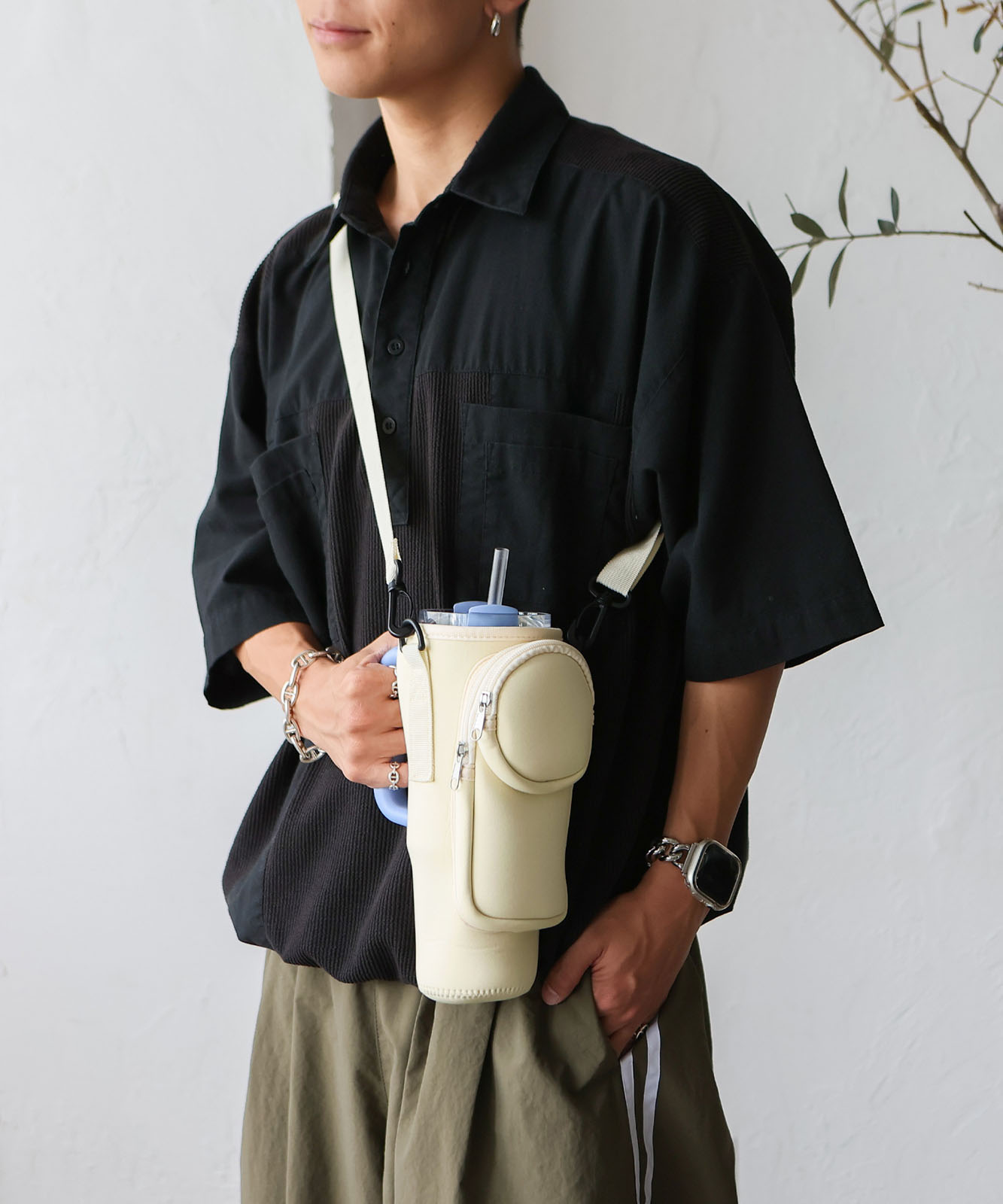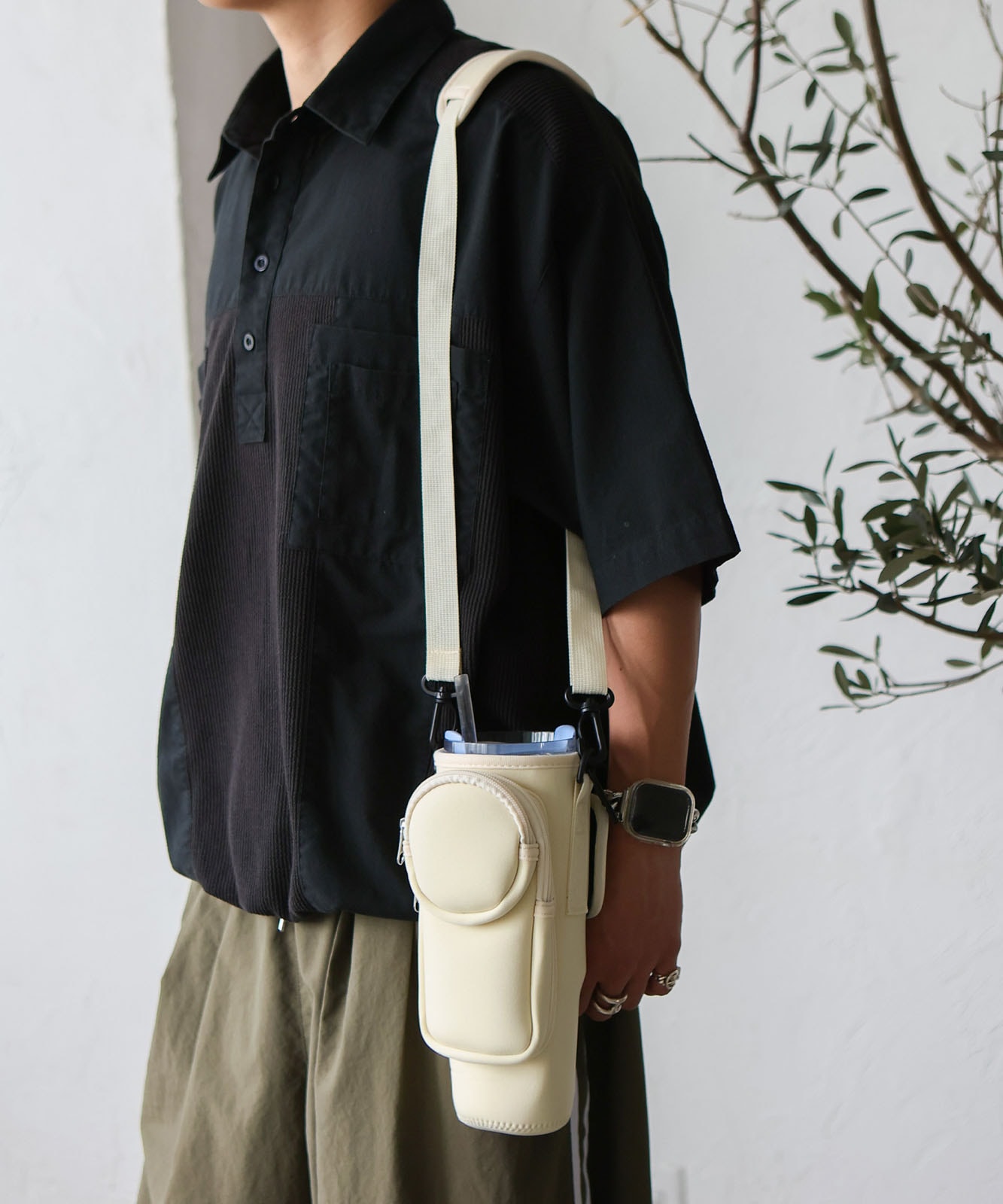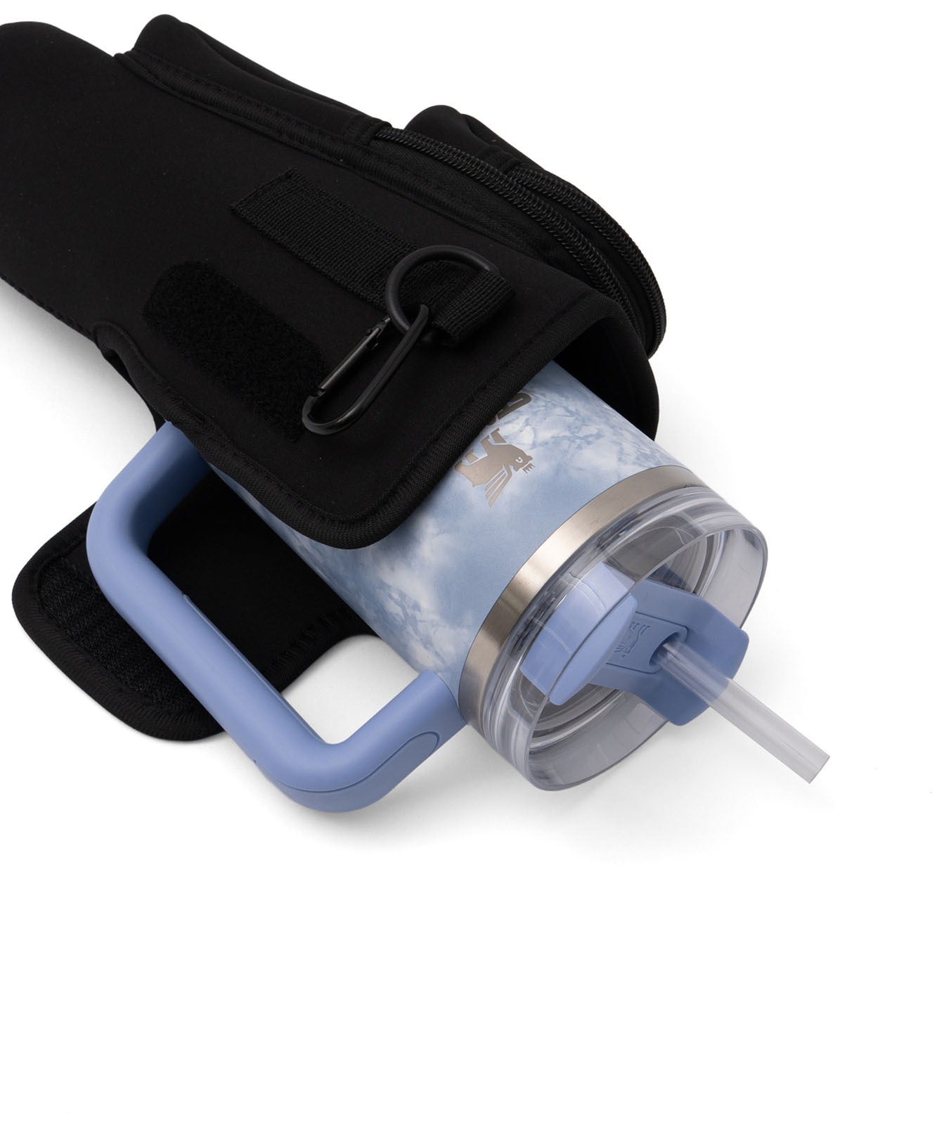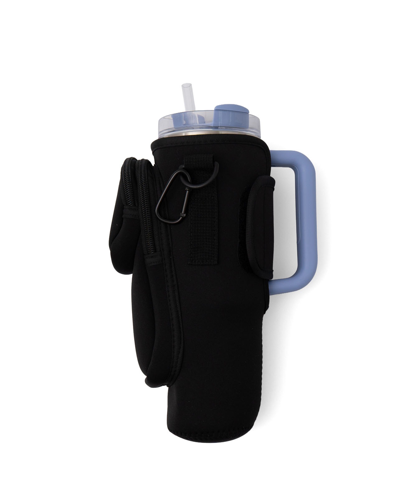 ベルクロ(面ファスナー)タイプで、持ち手付きタンブラーはもしっかり固定可能。スタンレーのタンブラー0.88Lサイズがぴったりなサイズ感でストレスフリーに持ち運び可能。