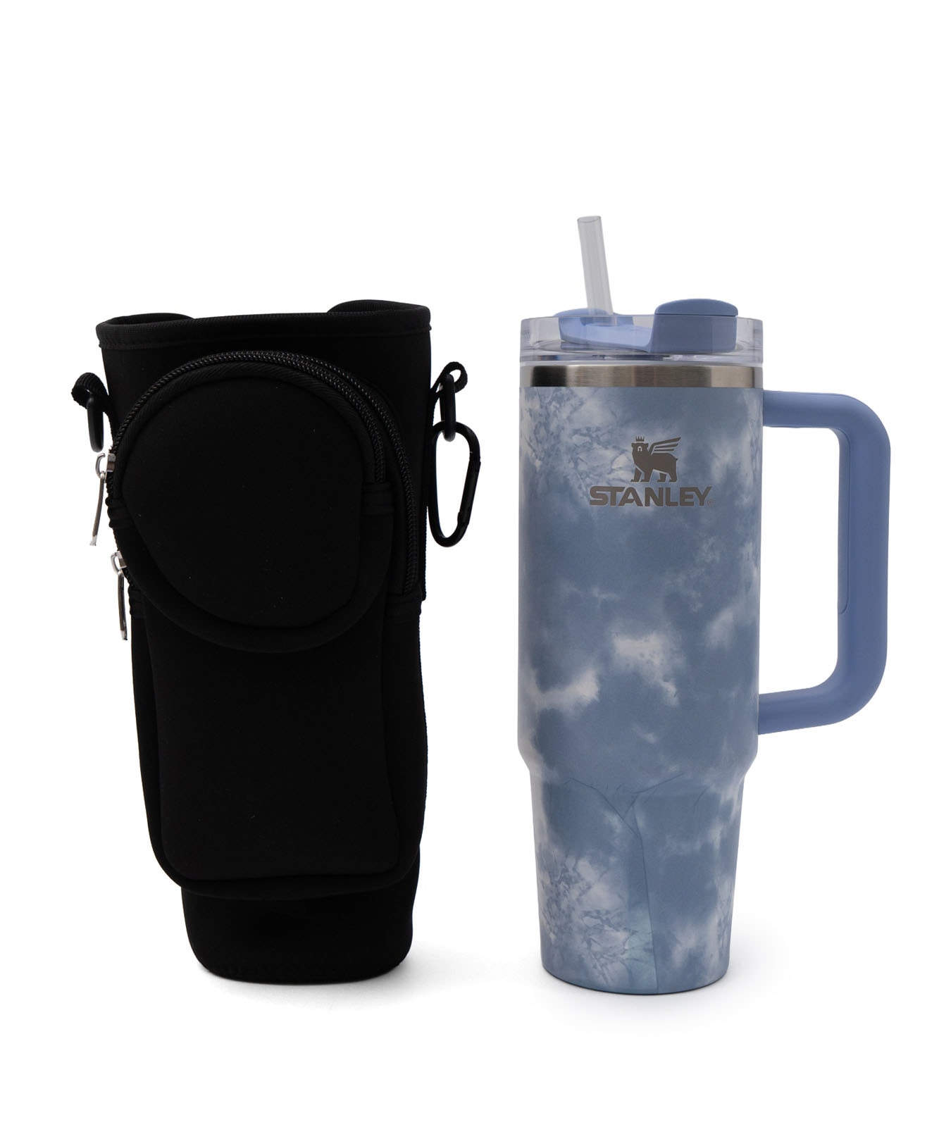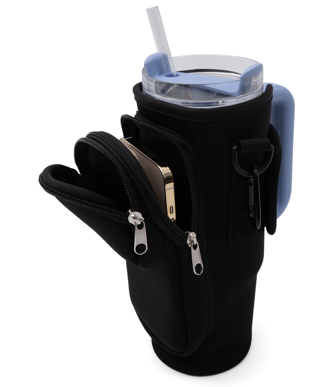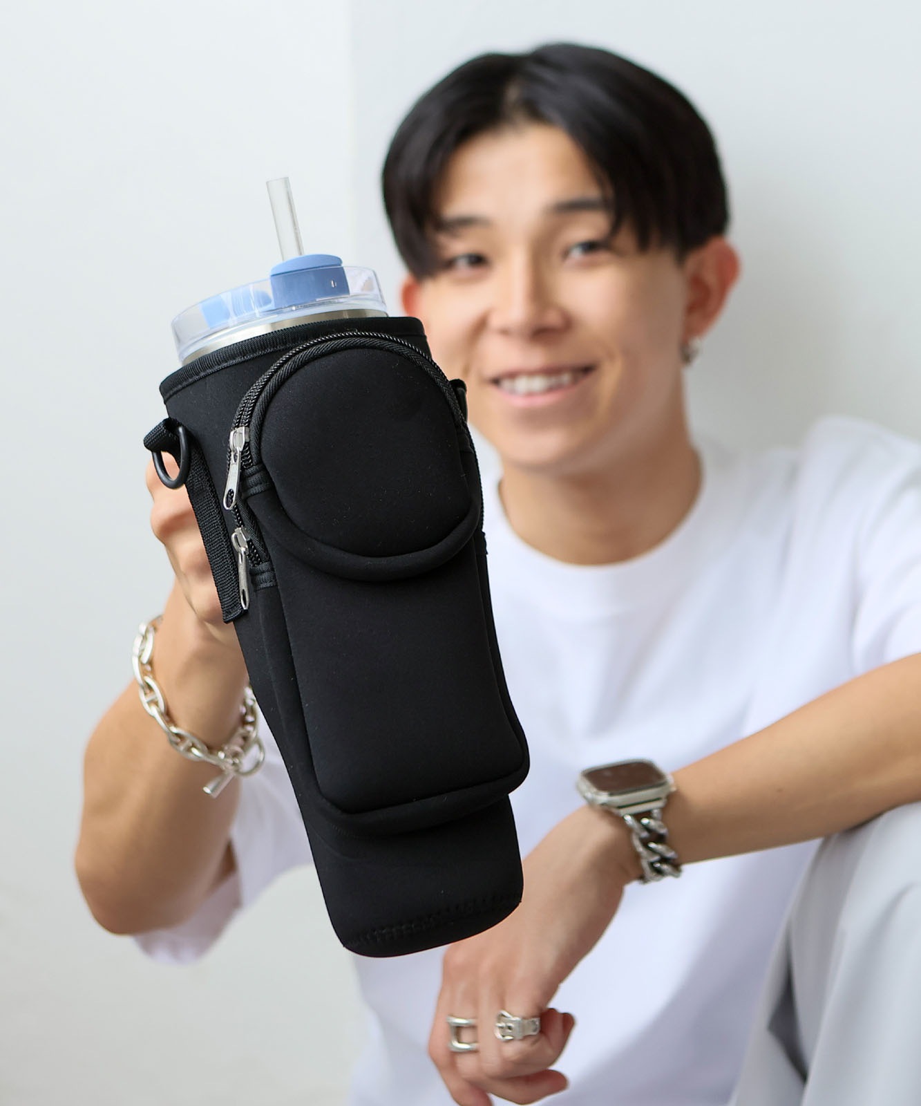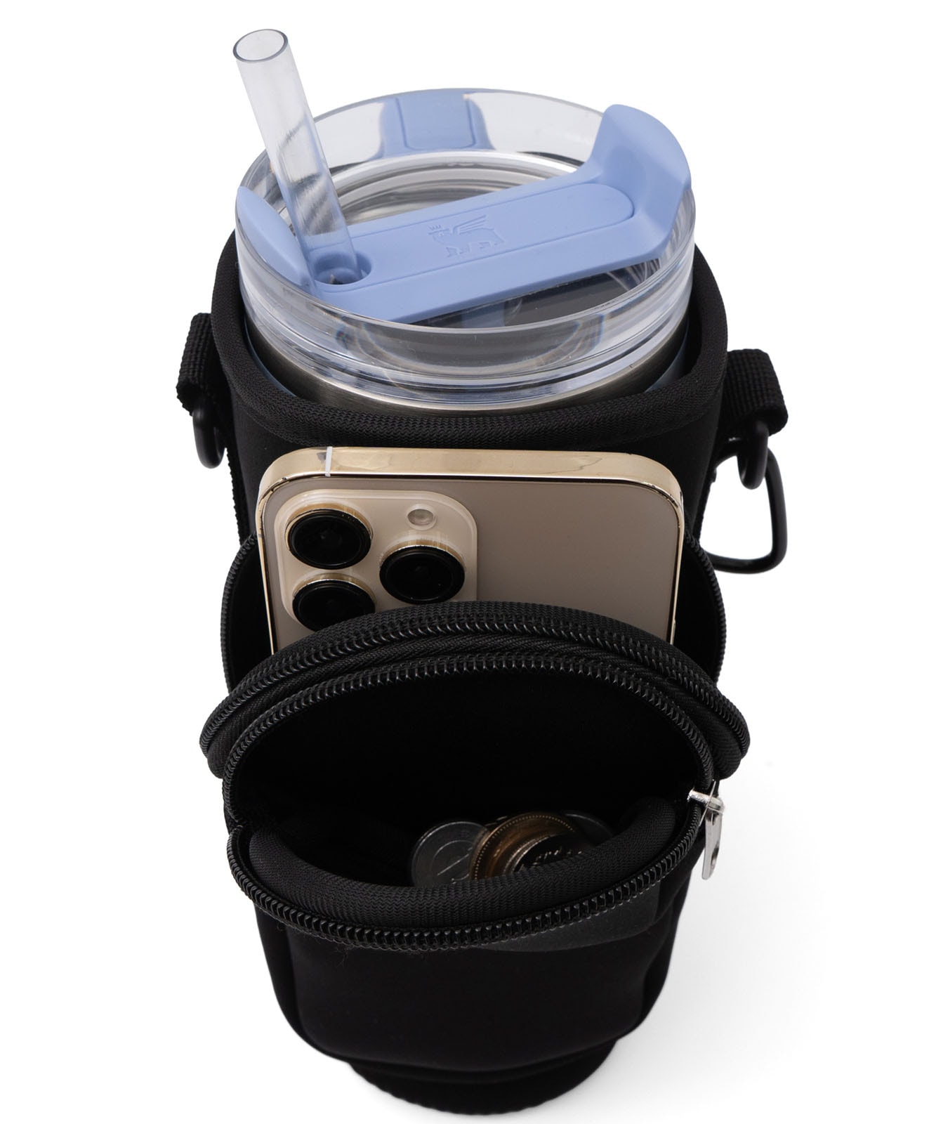 ベルクロ(面ファスナー)タイプで、持ち手付きタンブラーはもしっかり固定可能。スタンレーのタンブラー0.88Lサイズがぴったりなサイズ感でストレスフリーに持ち運び可能。