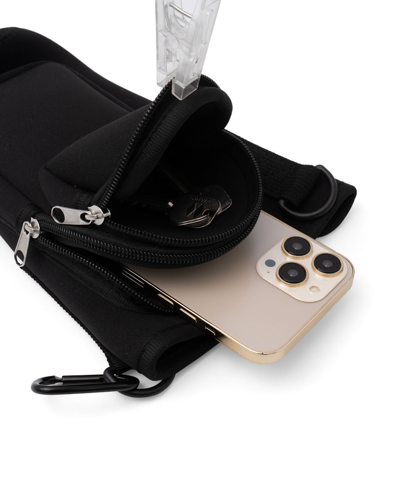 前面に配置された2つのファスナーポケットは、スマートフォンや鍵、リップなど小物の収納が可能。