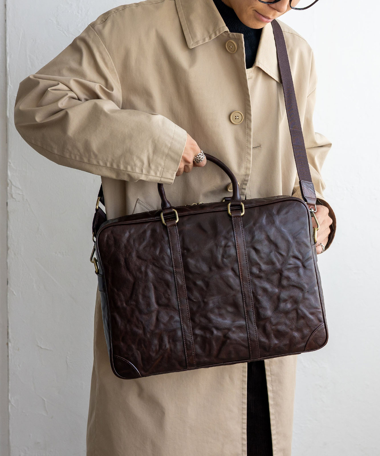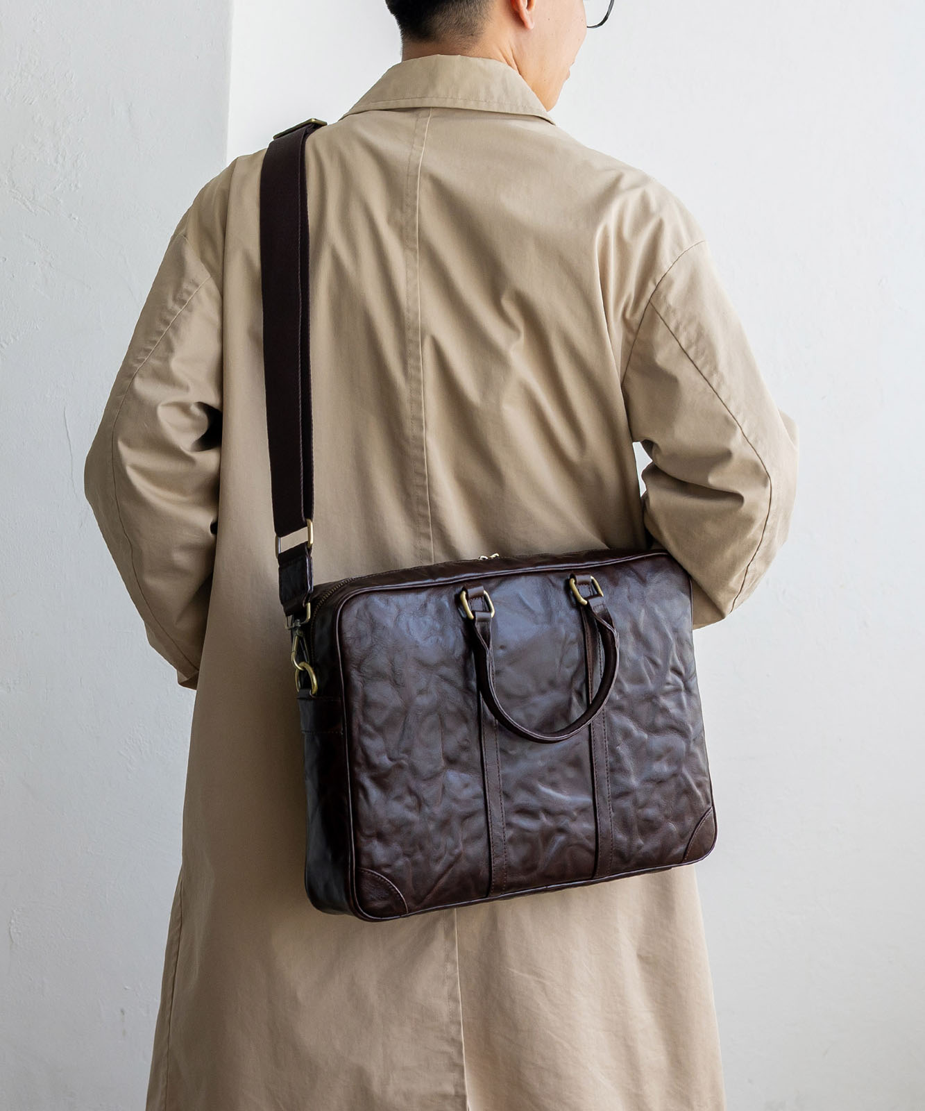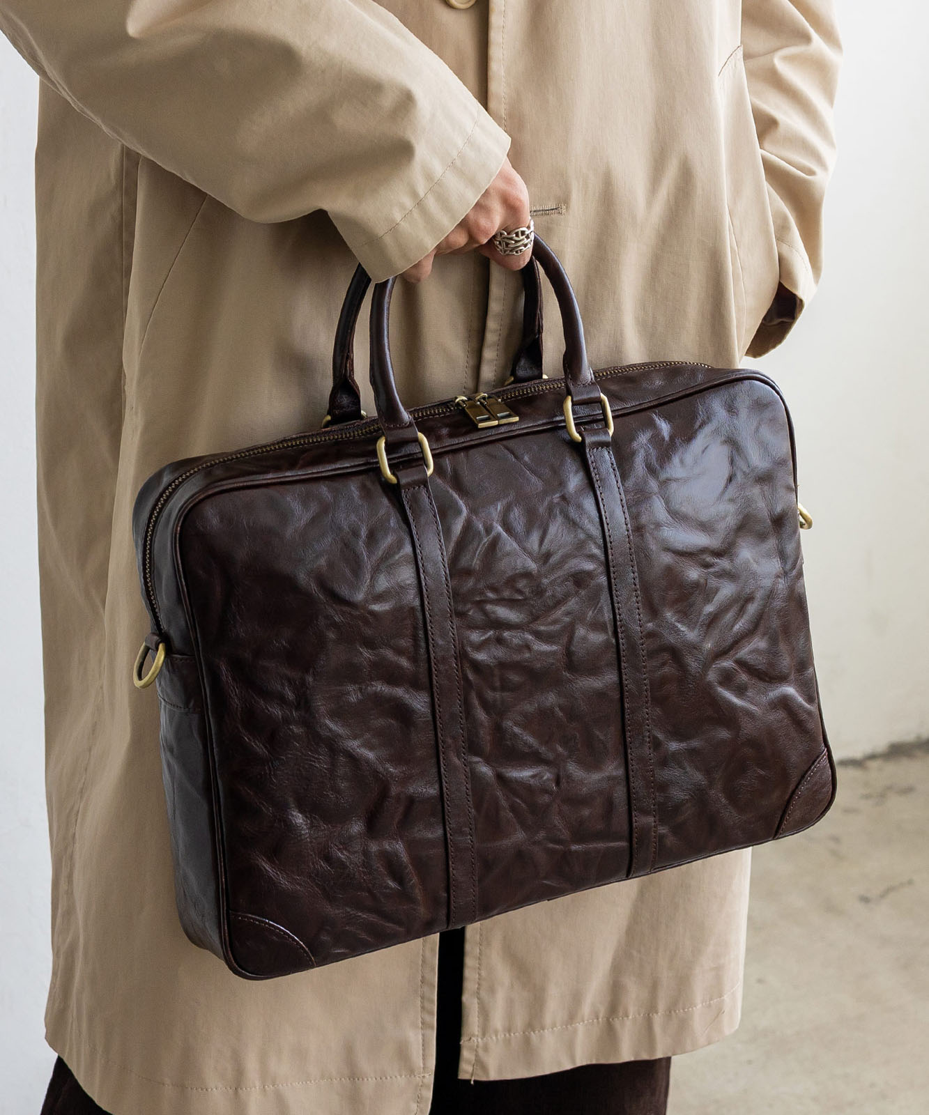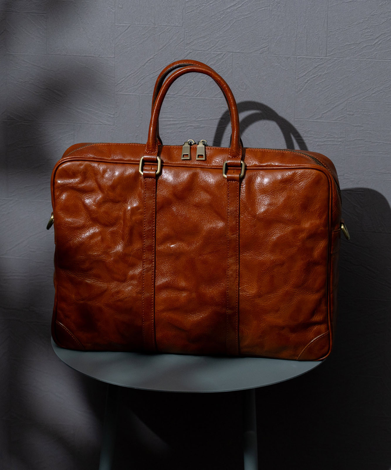 シワ加工を施した本革は、一つひとつ異なる表情を持ち、ヴィンテージ感と高級感を演出。