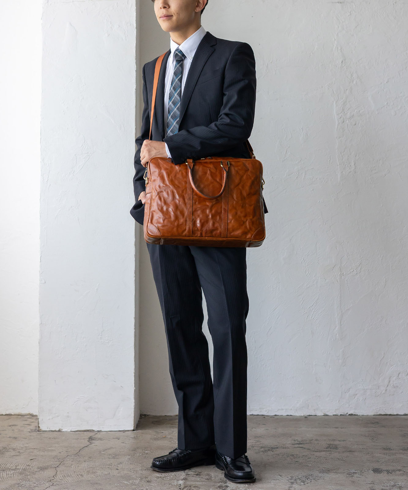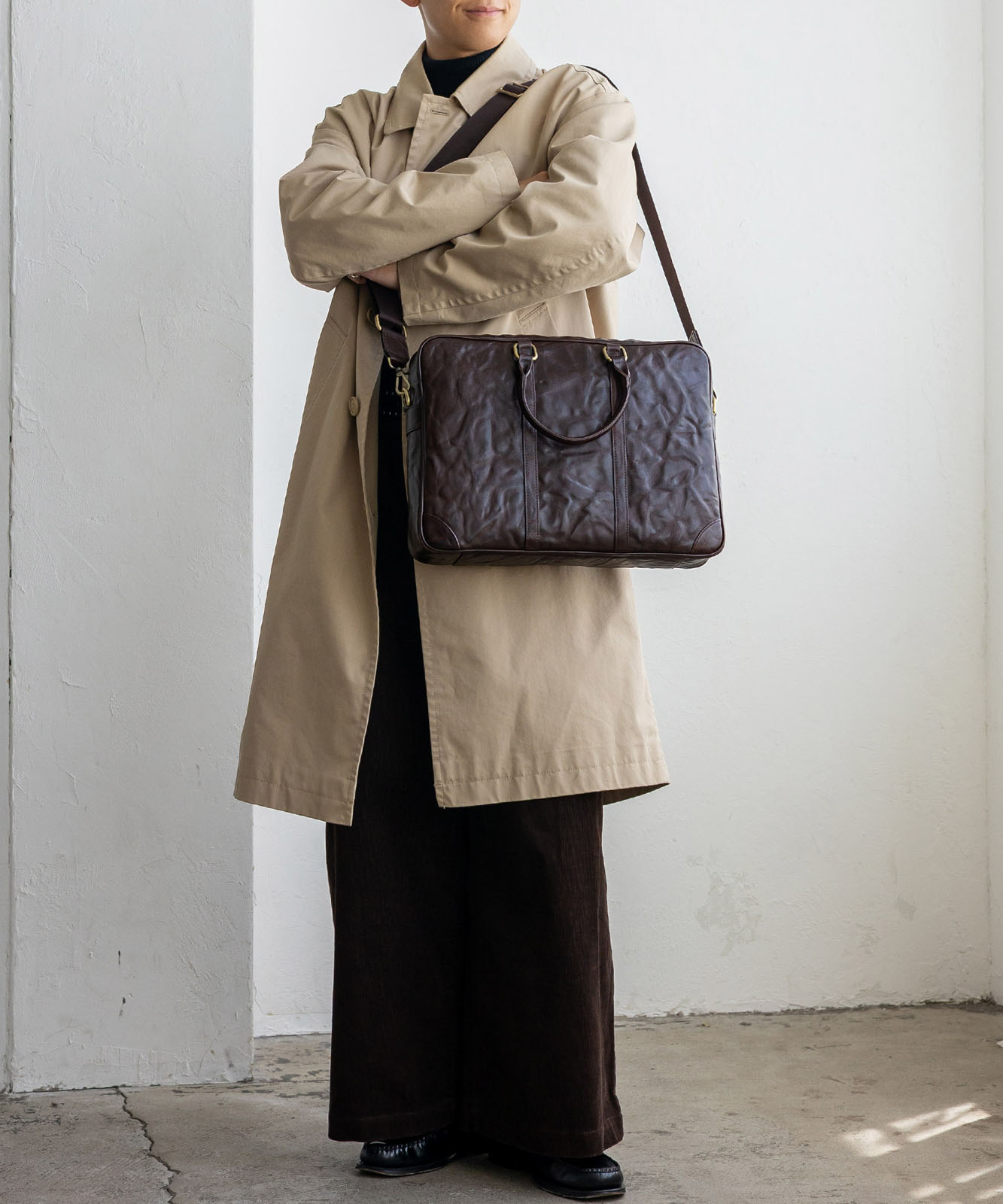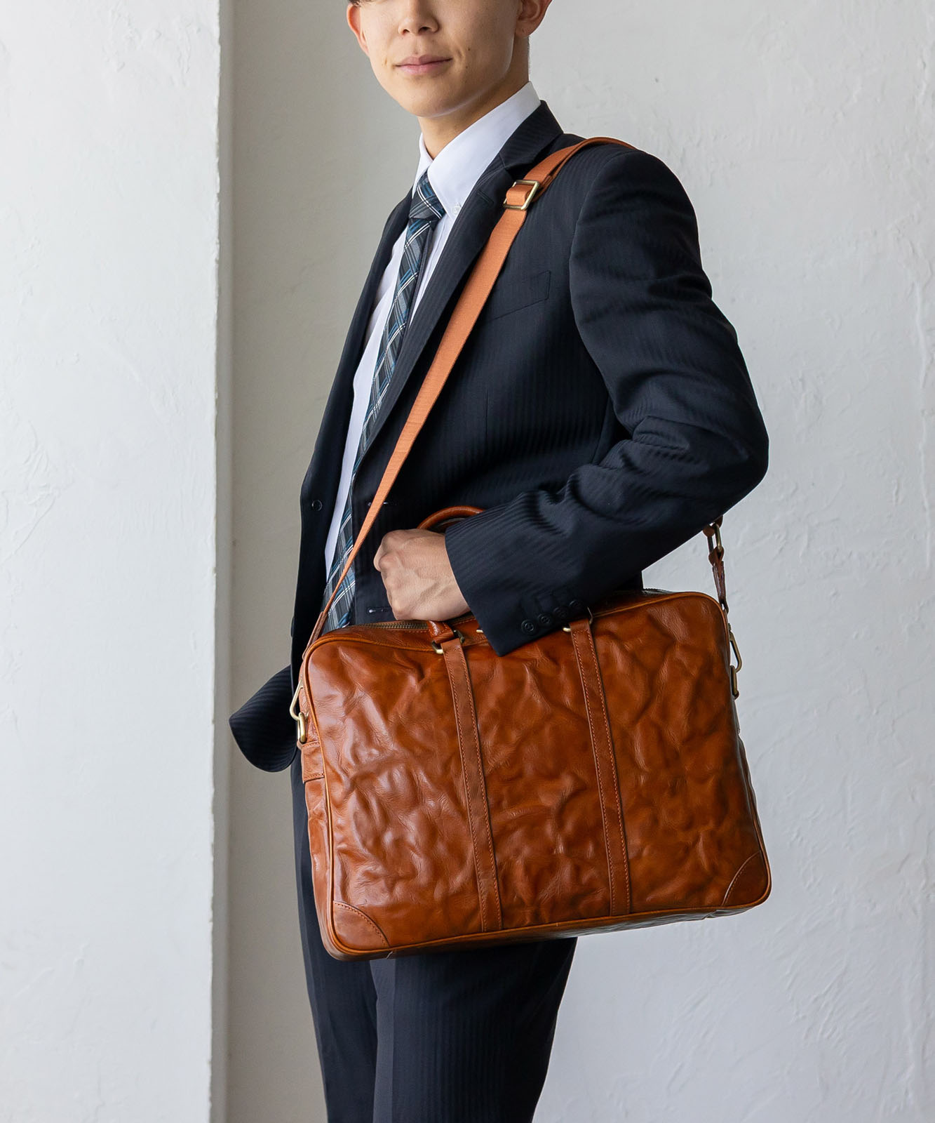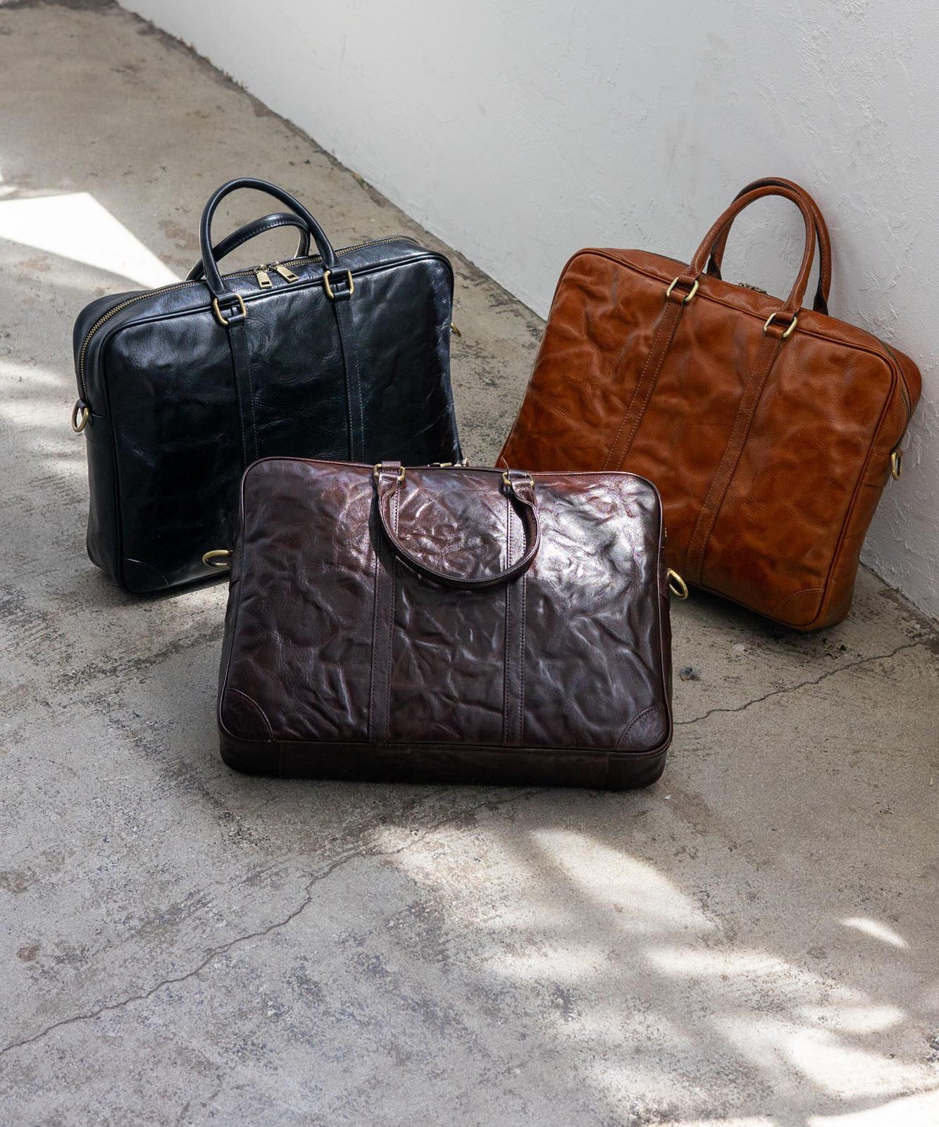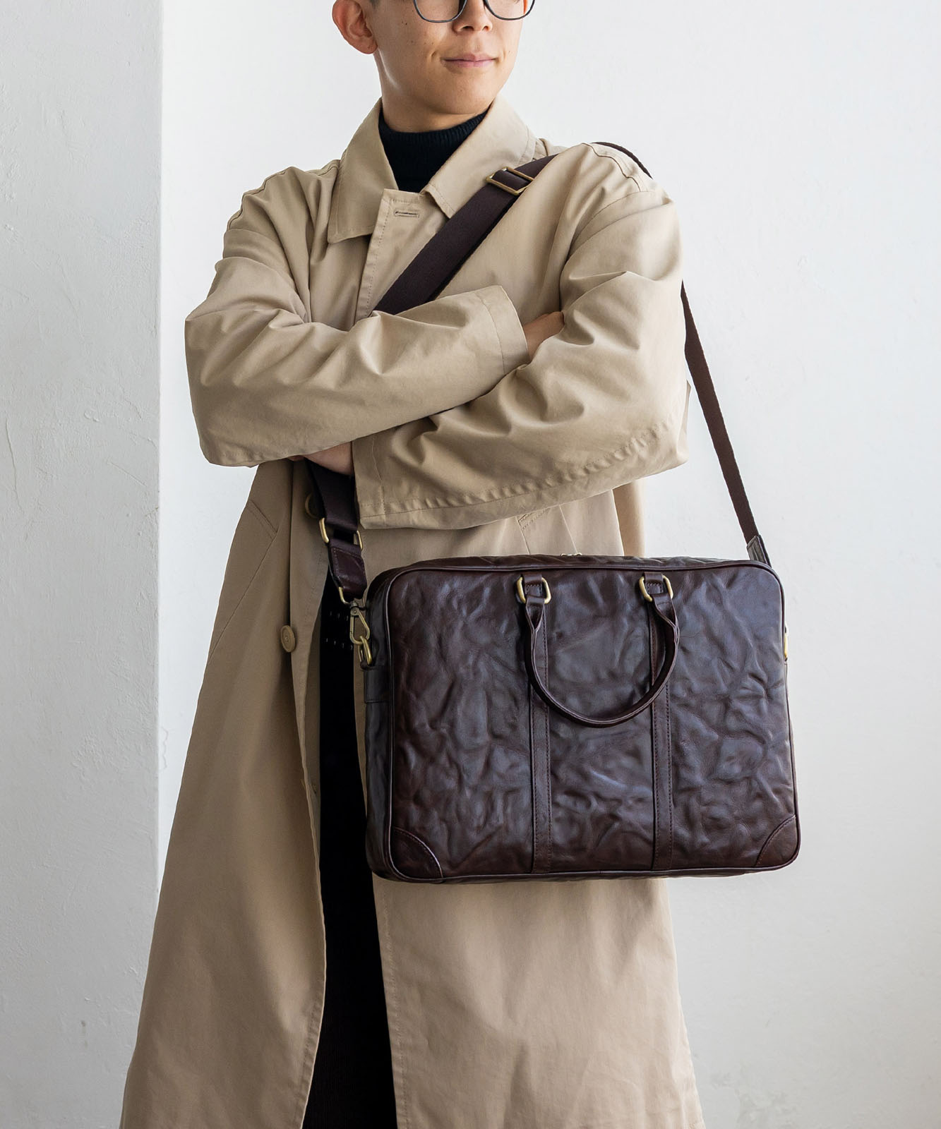 シワ加工を施した本革は、一つひとつ異なる表情を持ち、ヴィンテージ感と高級感を演出。