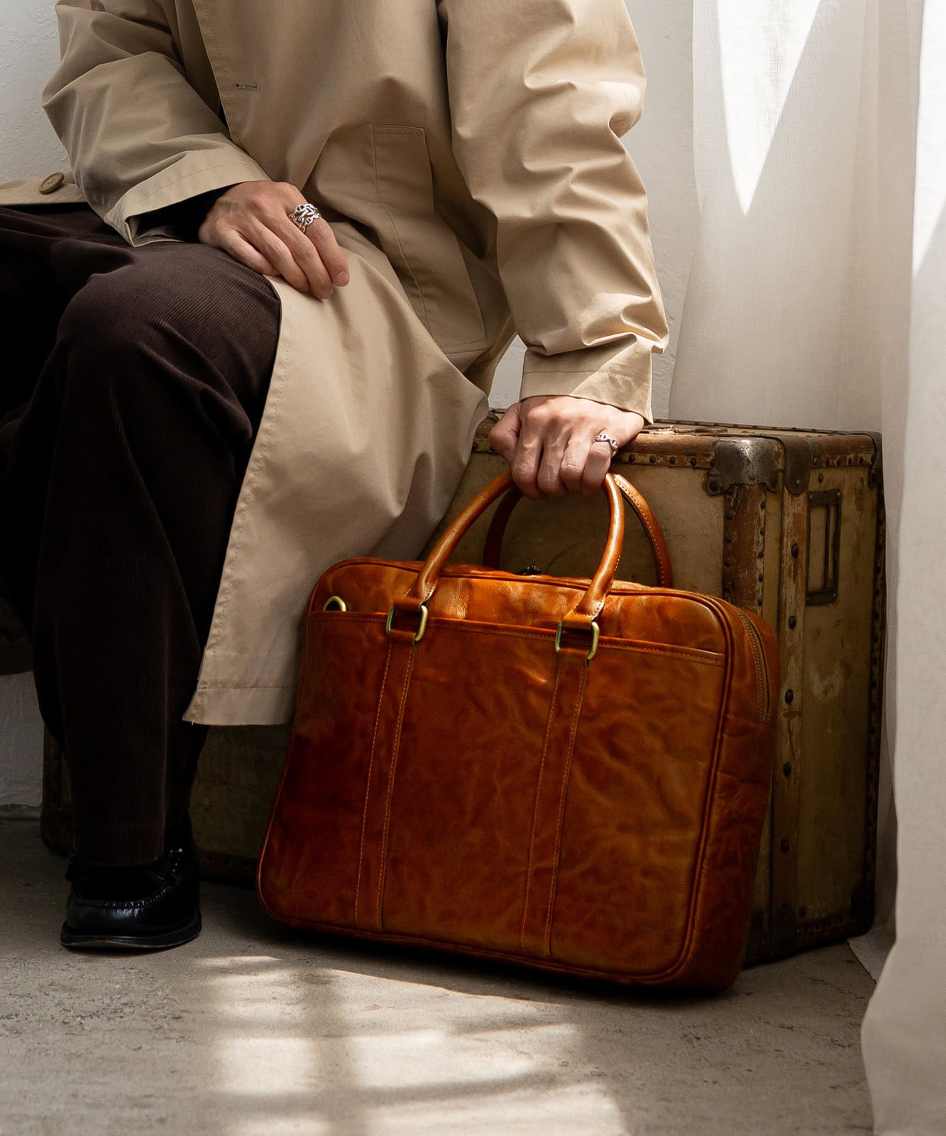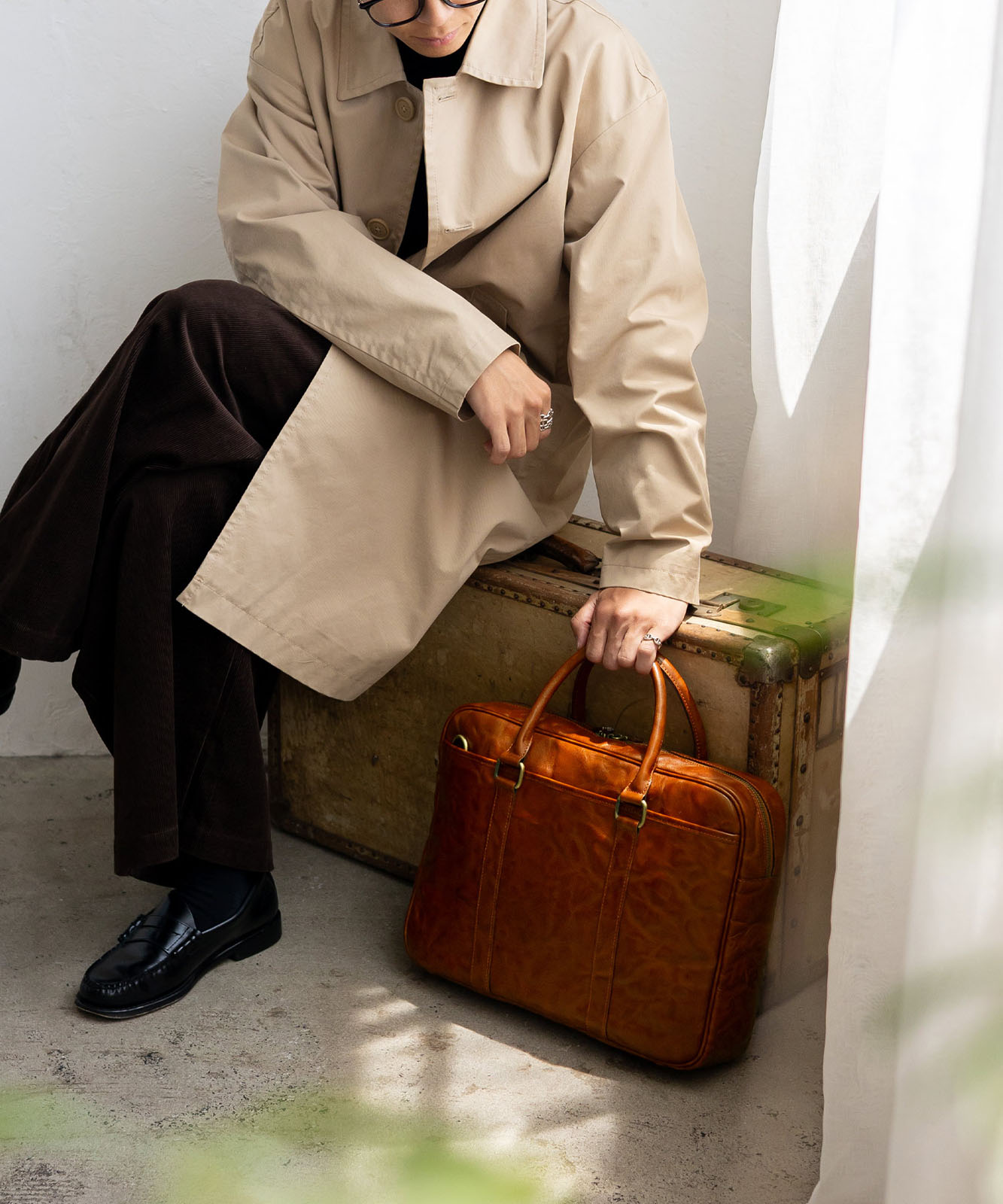 シワ加工を施した本革は、一つひとつ異なる表情を持ち、ヴィンテージ感と高級感を演出。
