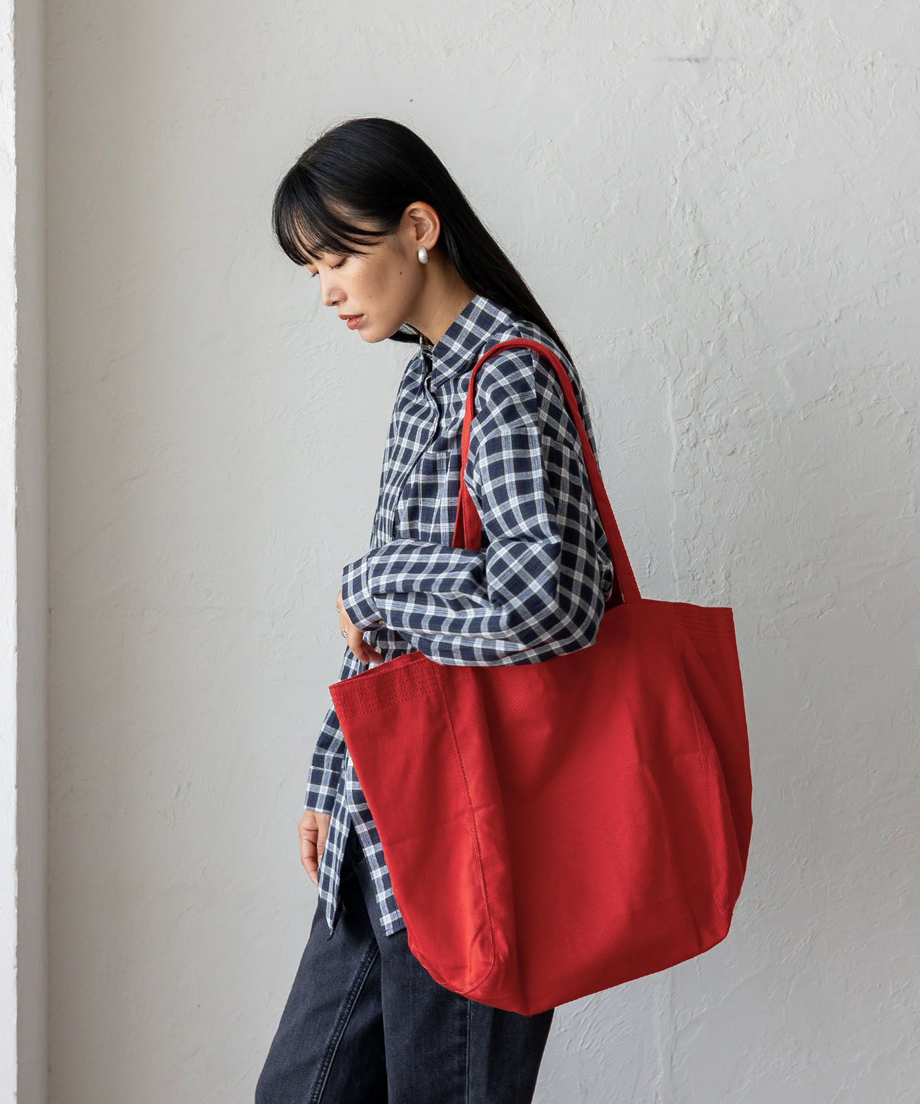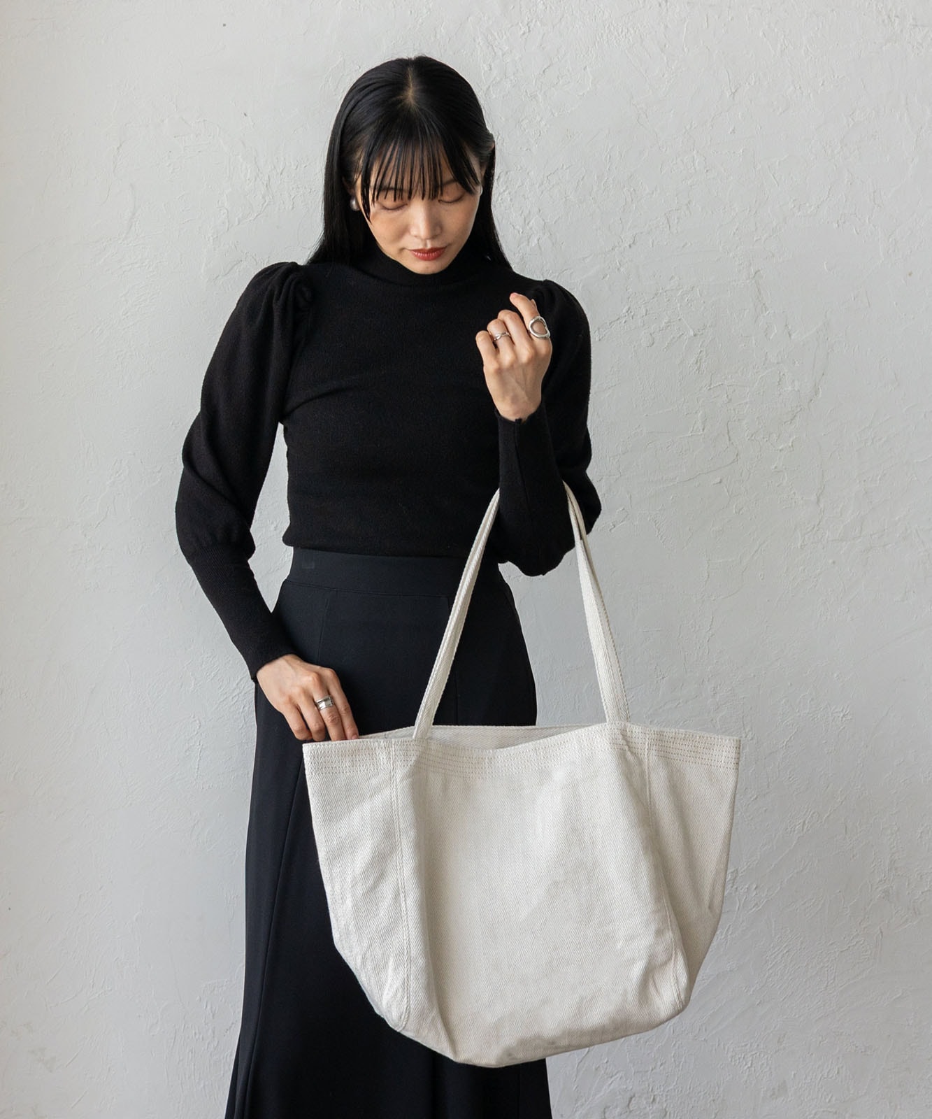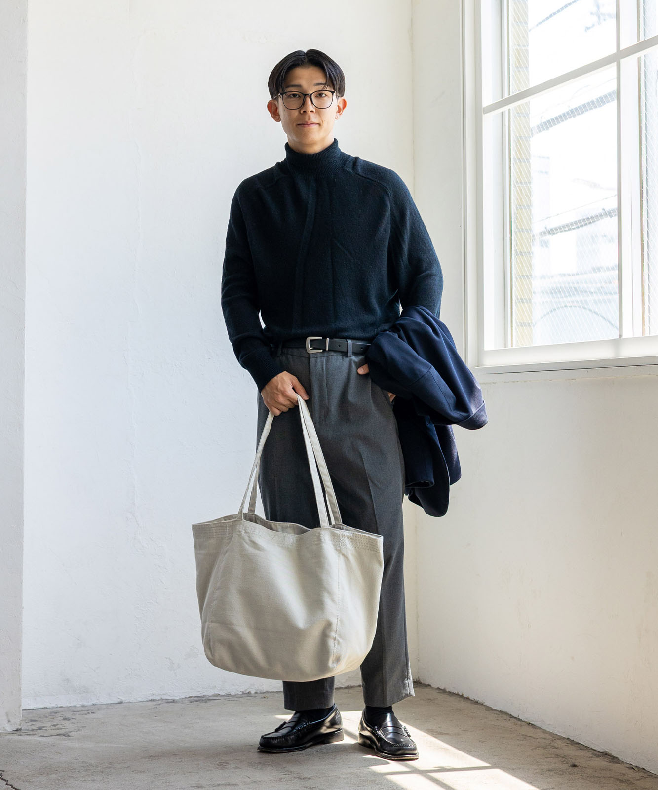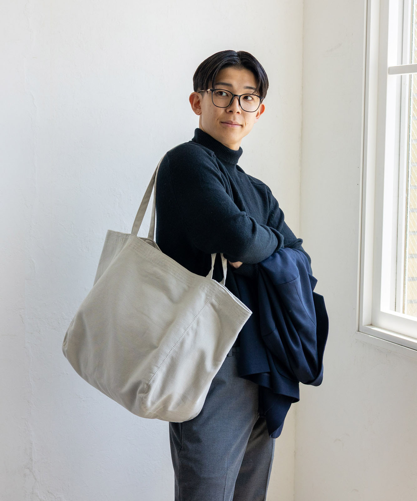長めのハンドルだから、厚手のアウターの上からでも楽に肩掛け可能。季節を問わず活躍するトートです。