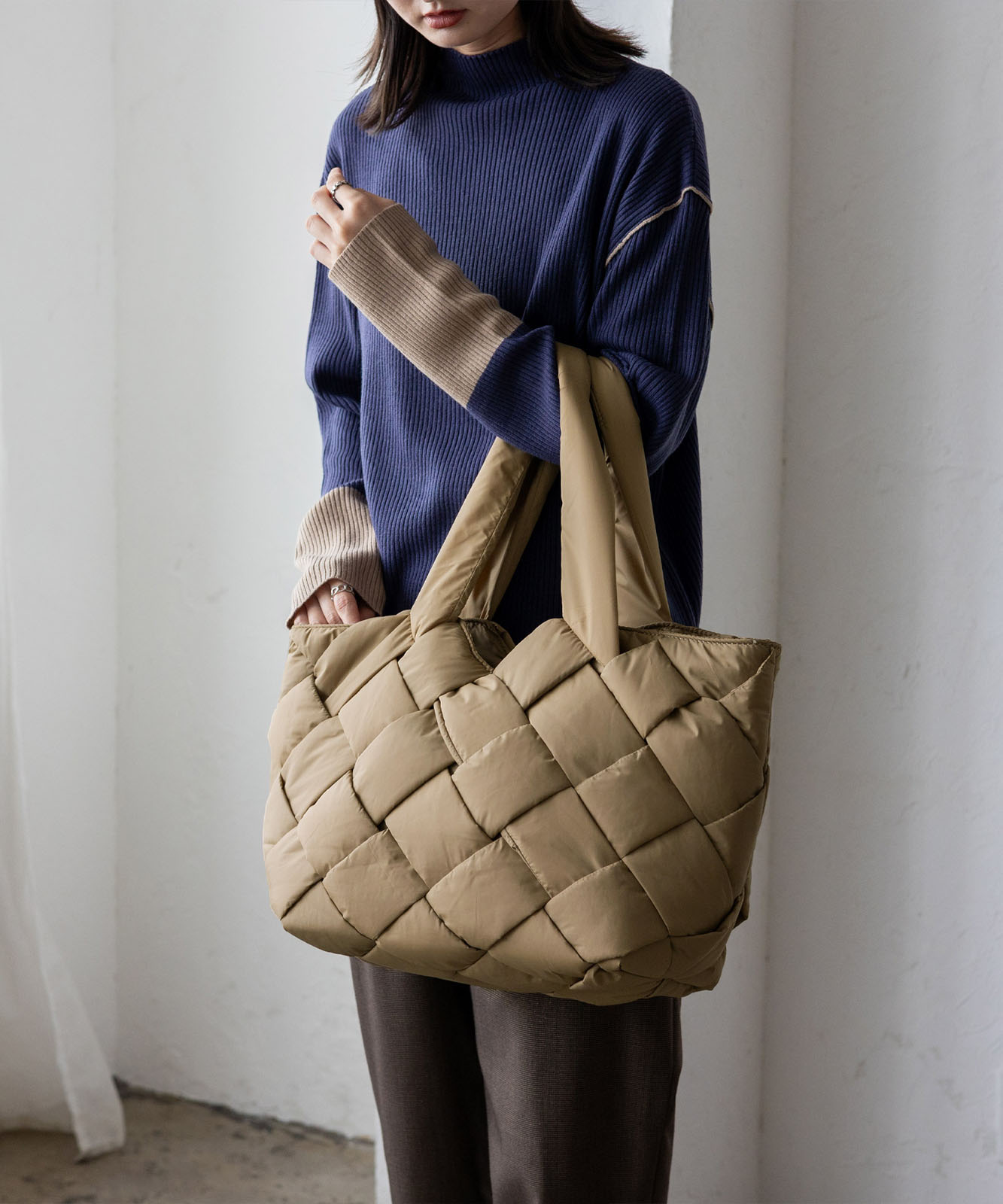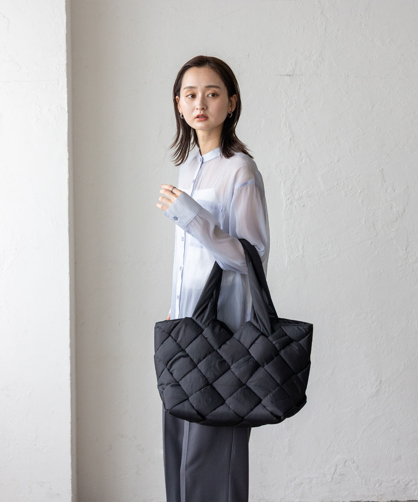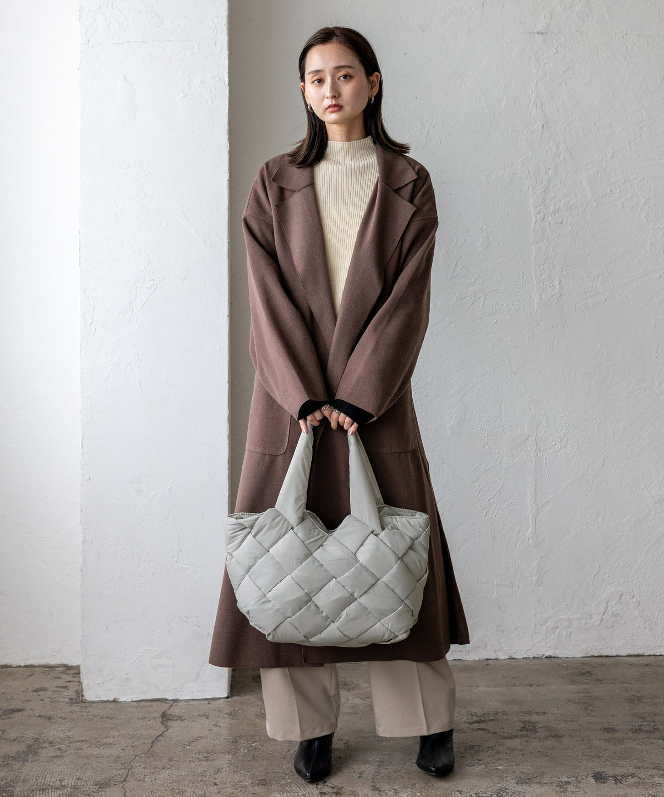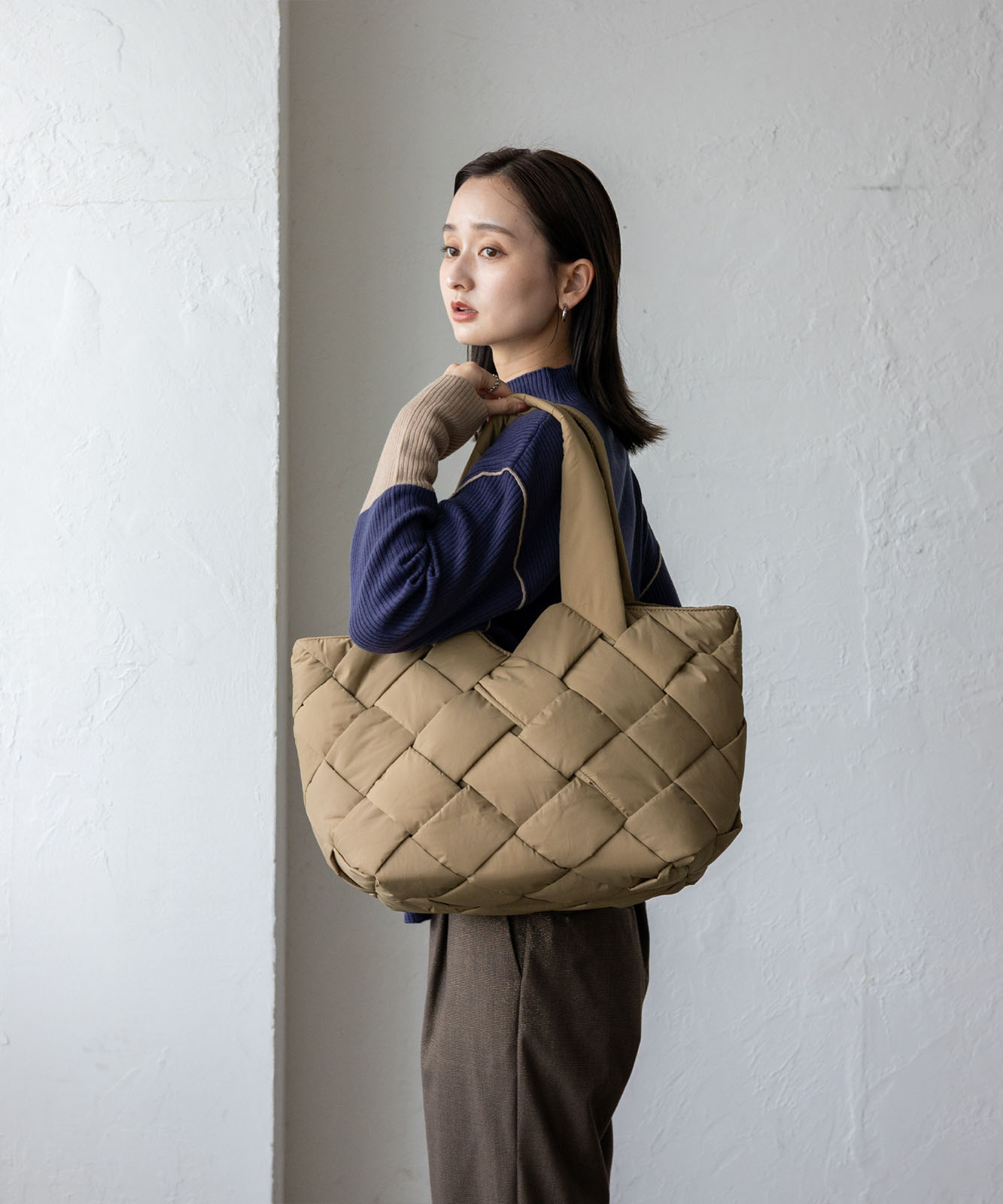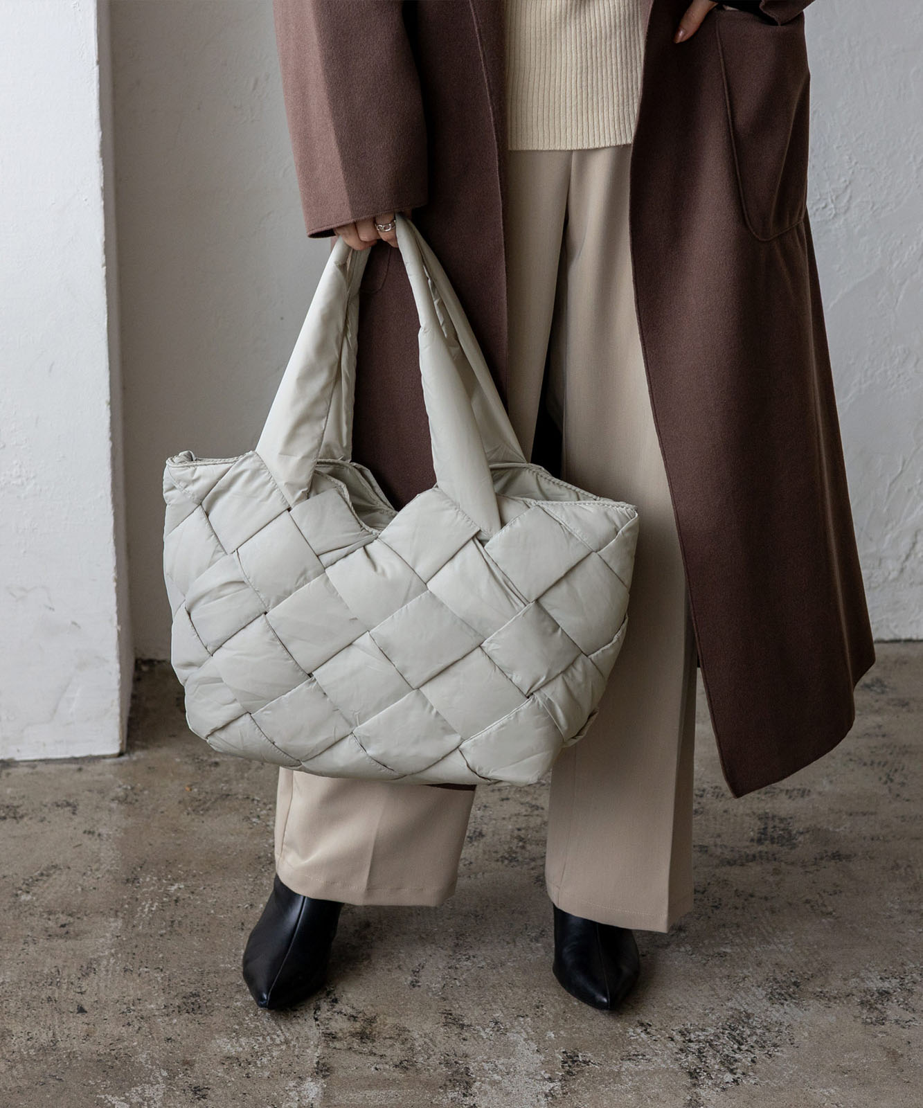 長めのハンドル設計で、アウターを着ても肩掛けしやすく、季節を問わず使える実用的なデザイン。