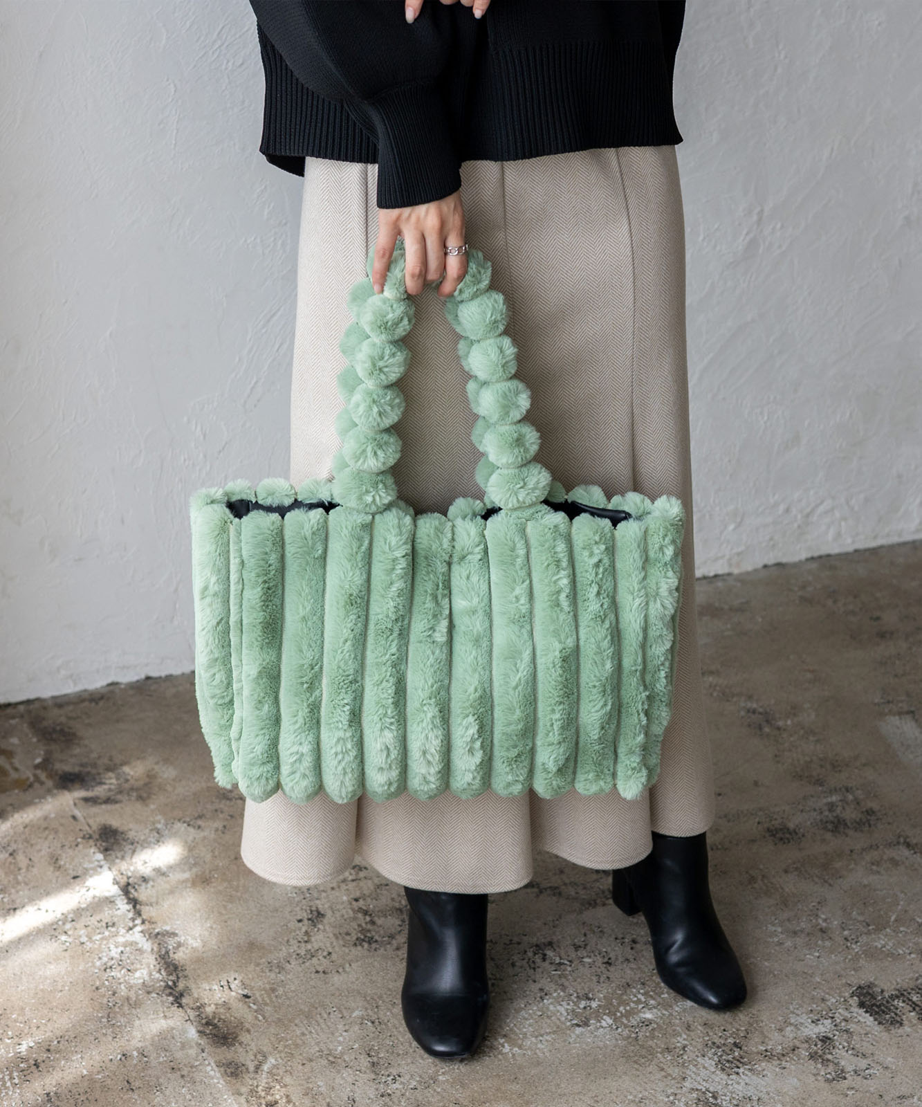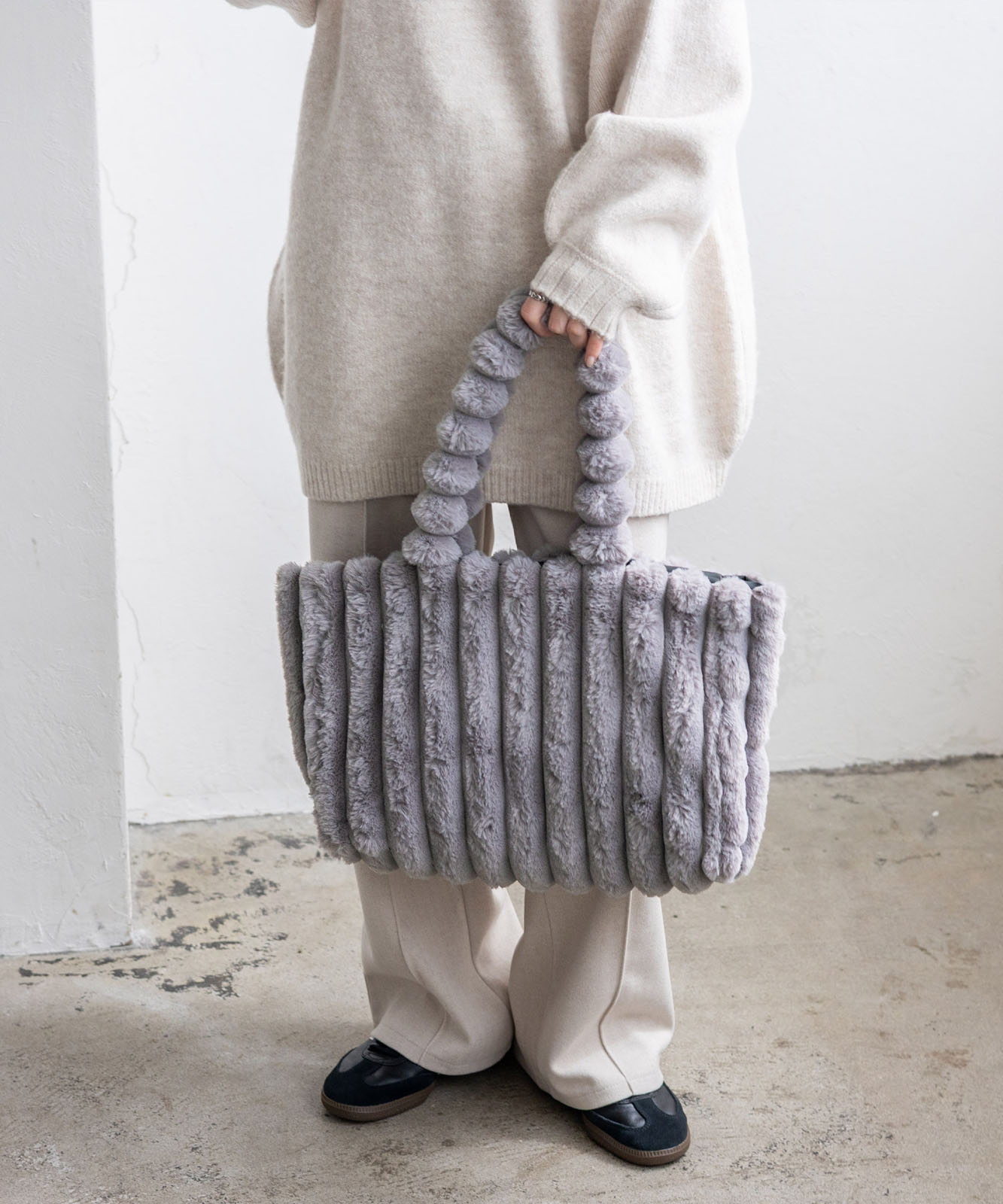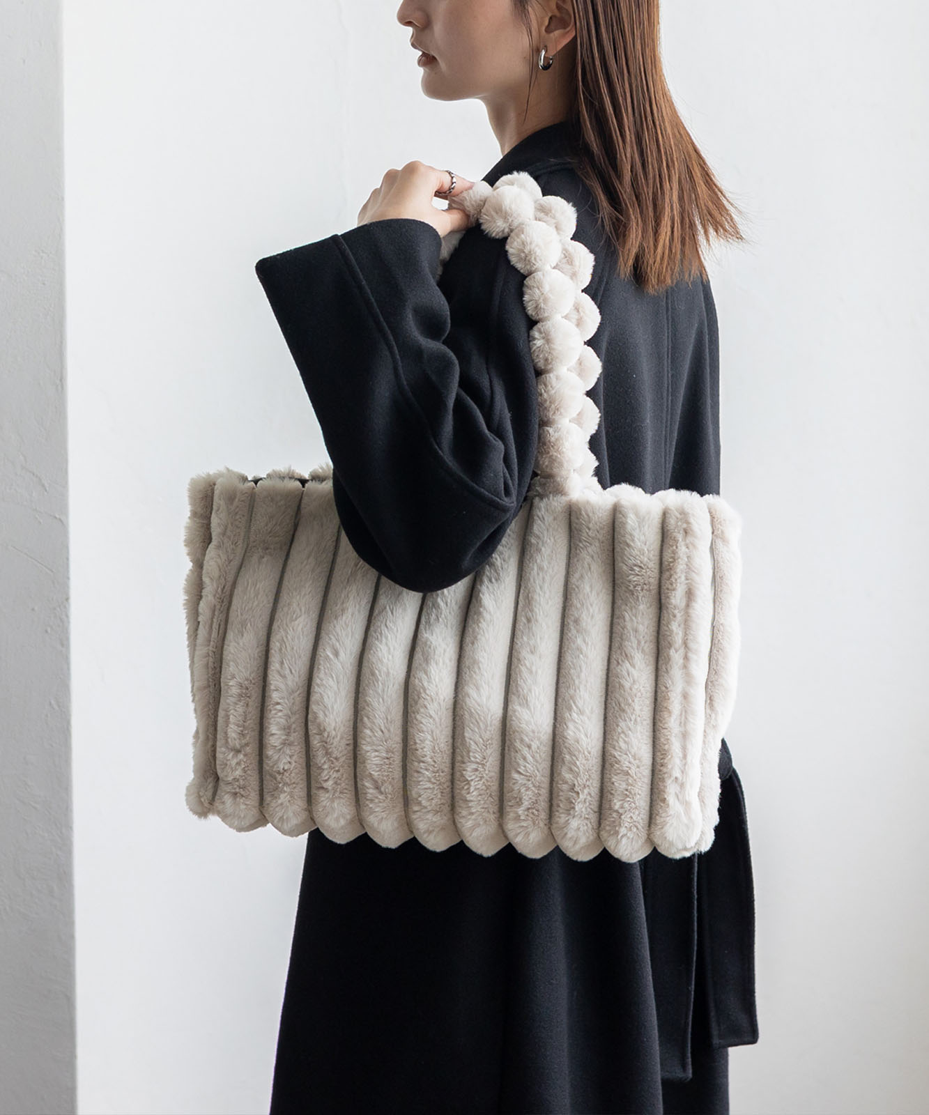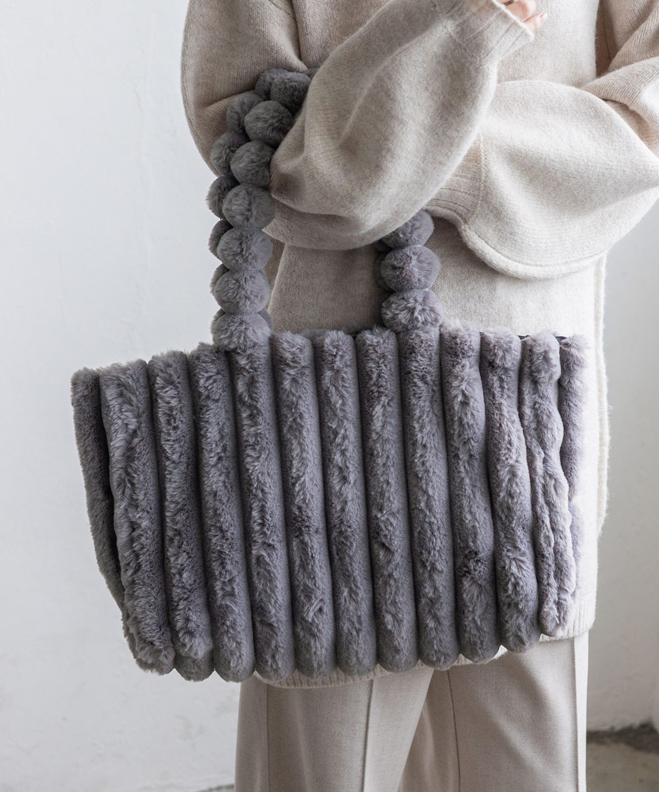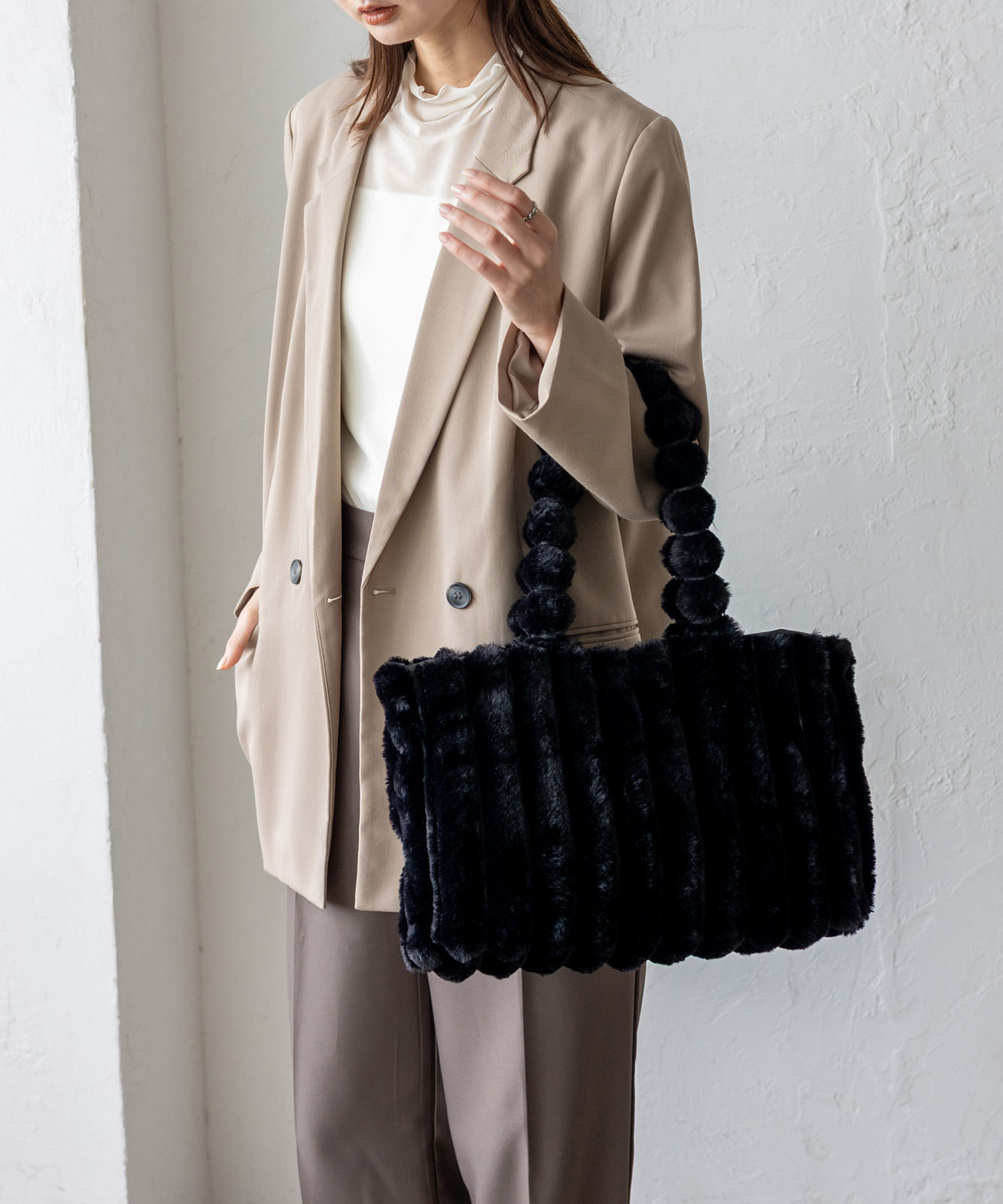 ころんとしたフォルムとふわもこ感が、冬のコーデに季節感と華やかさをプラス。