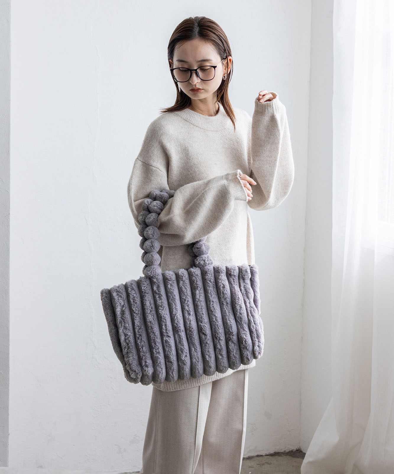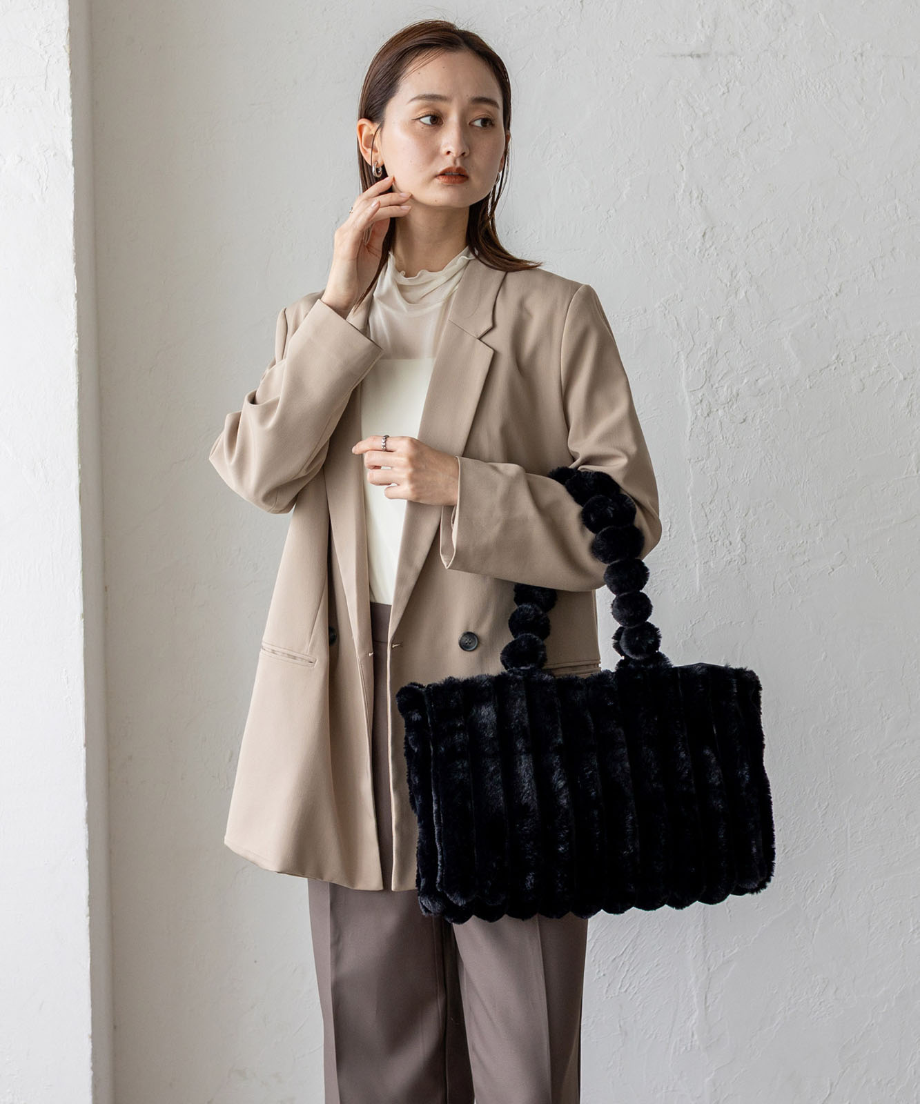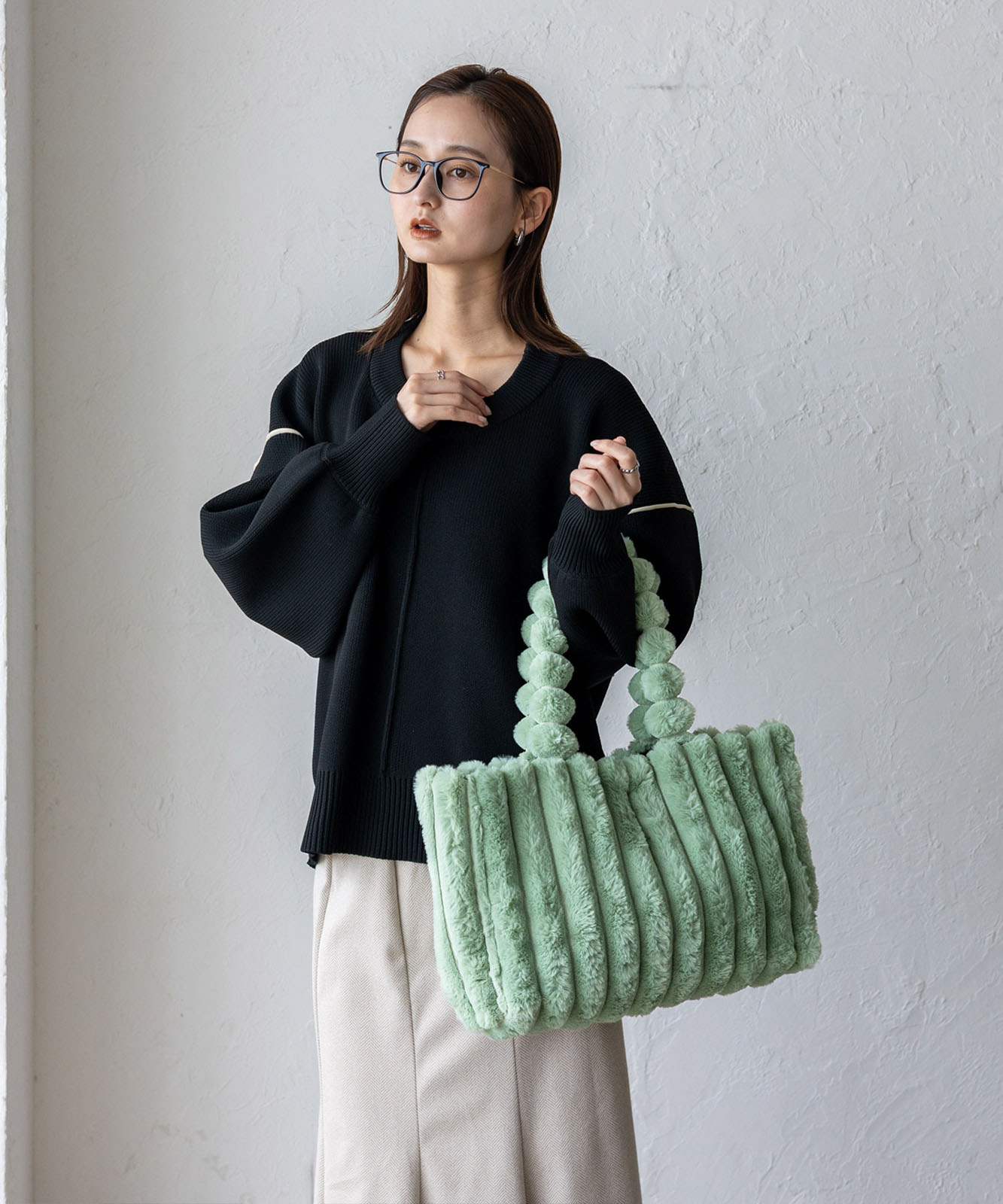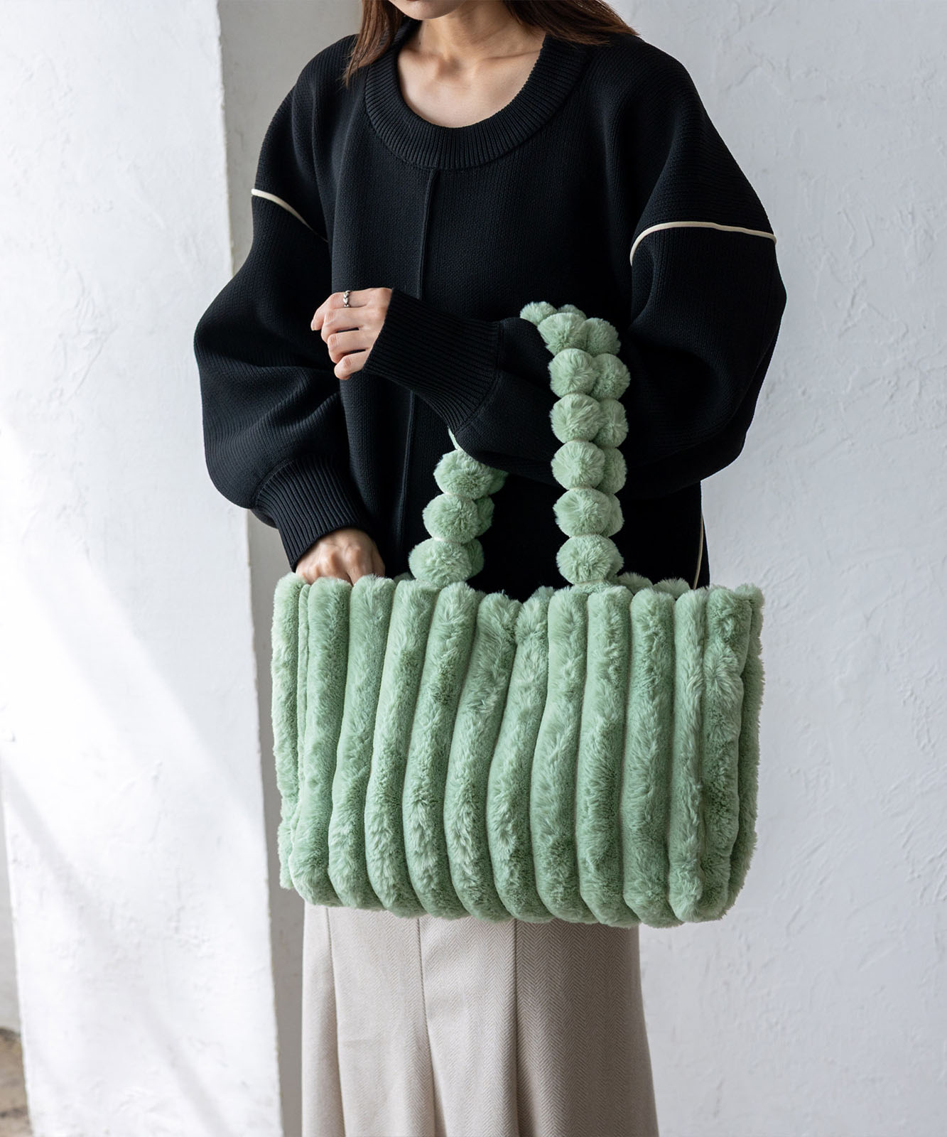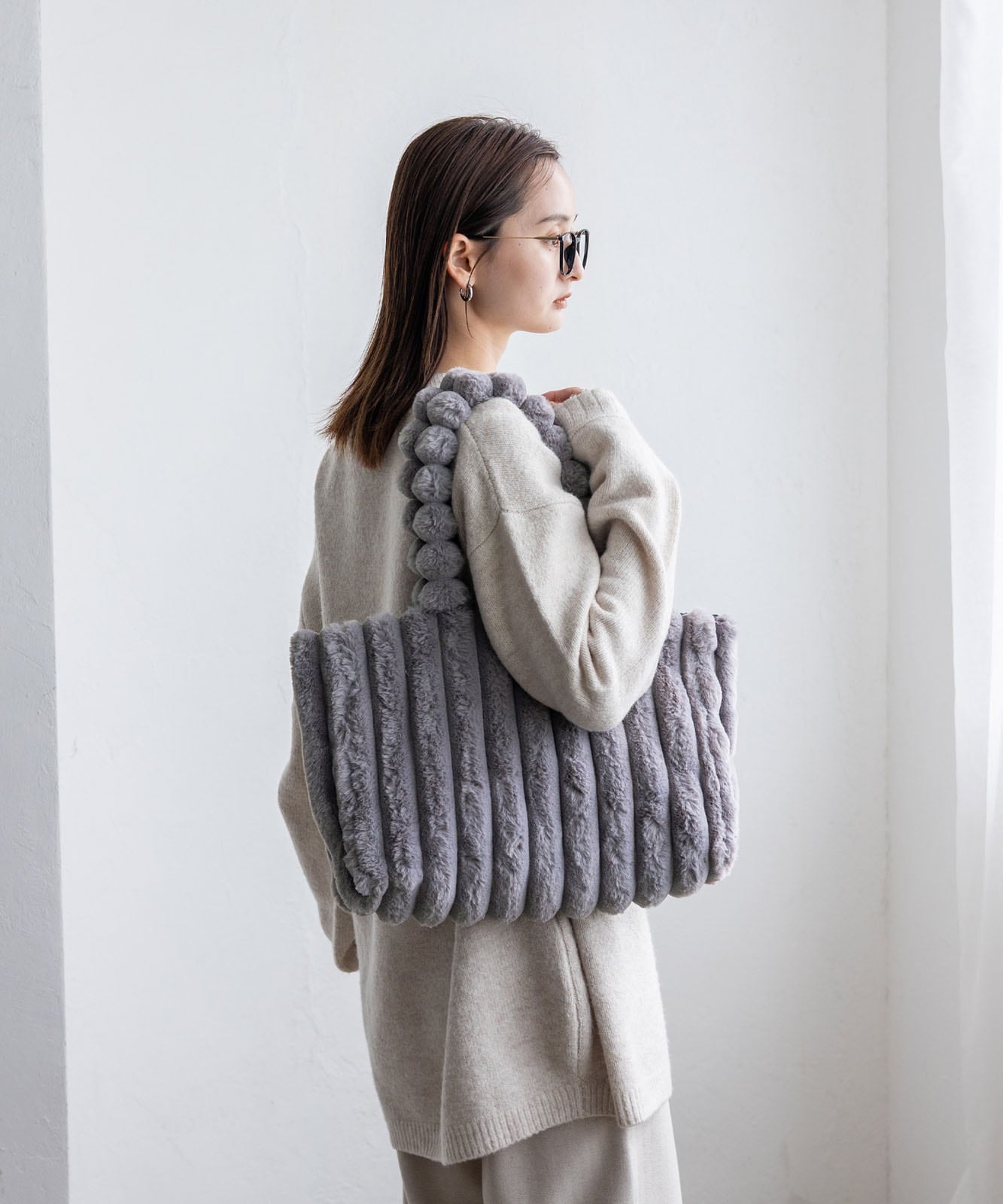 ころんとしたフォルムとふわもこ感が、冬のコーデに季節感と華やかさをプラス。