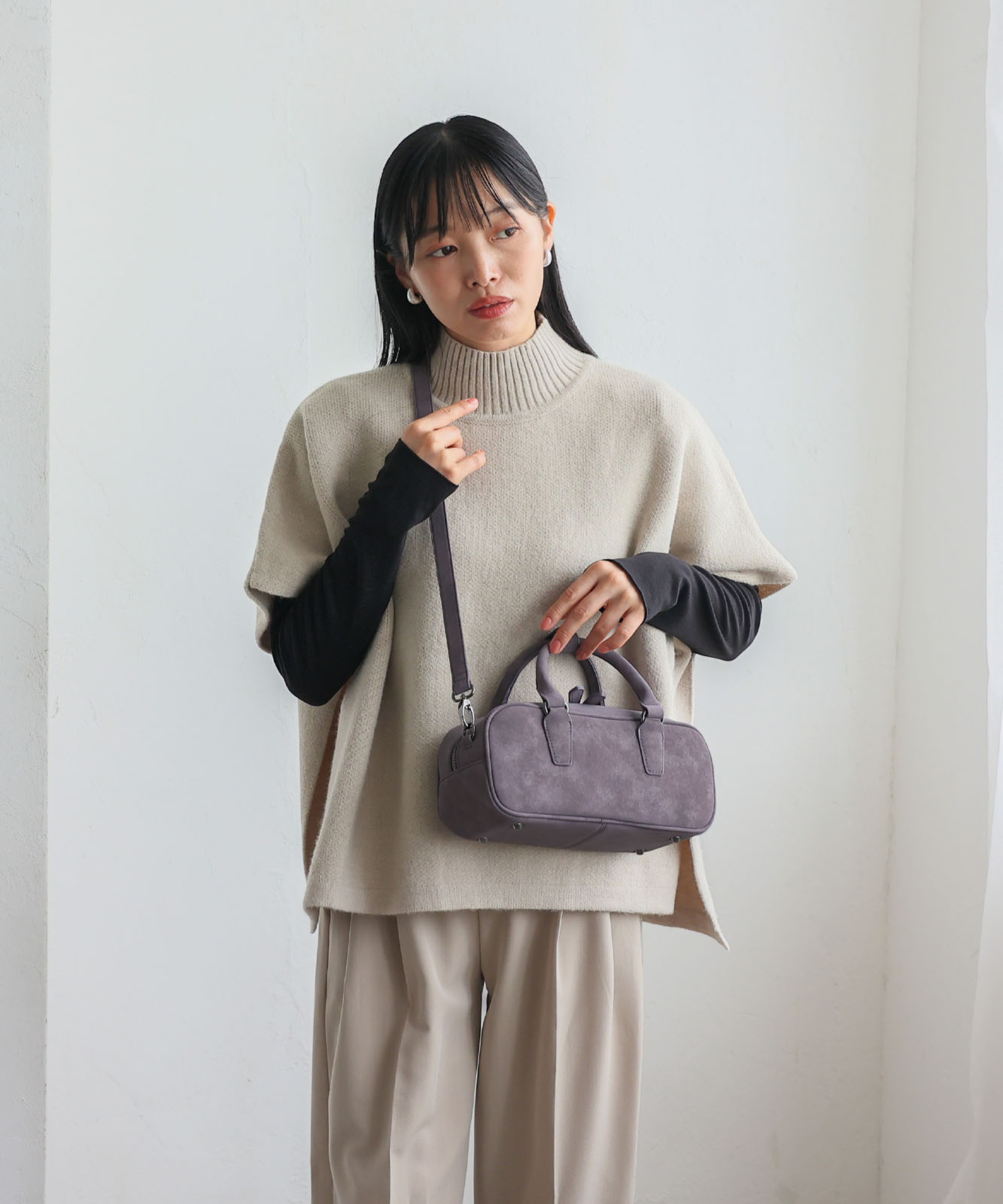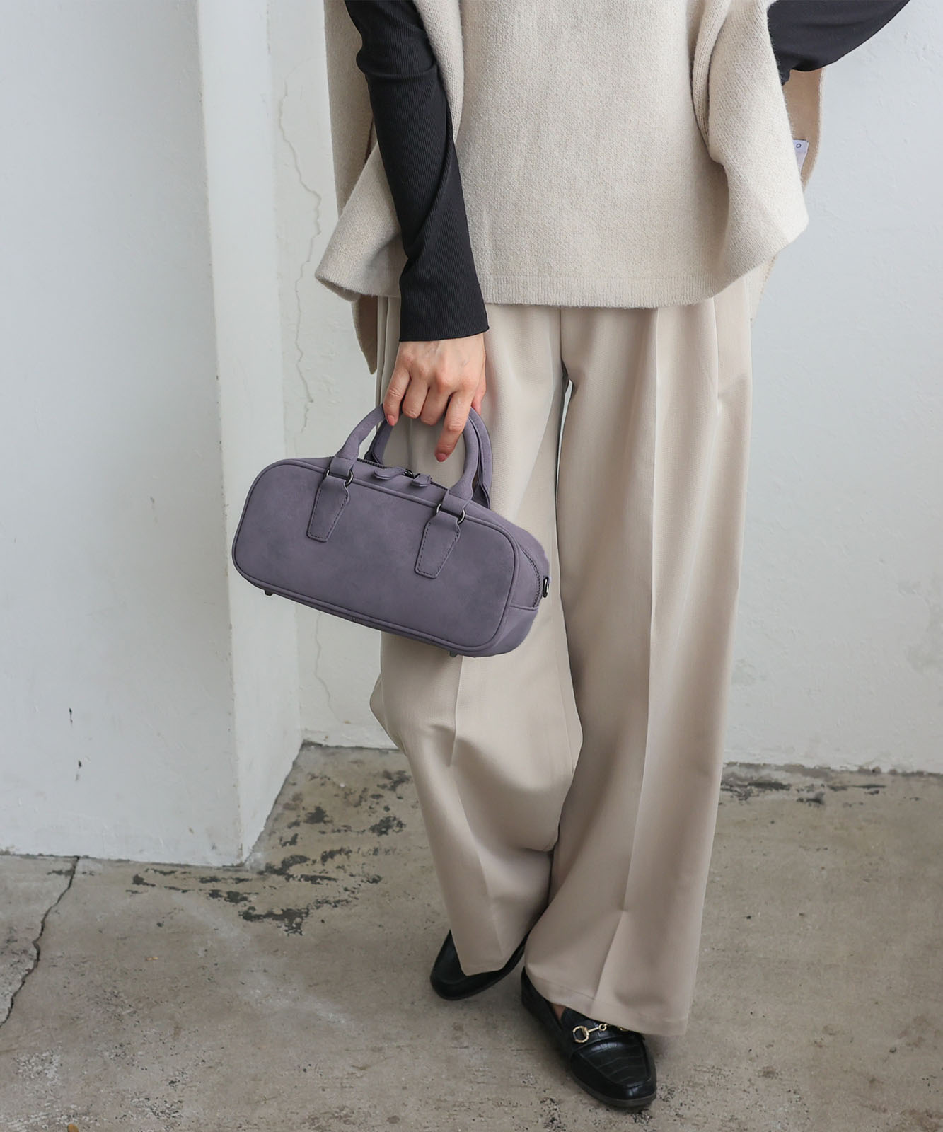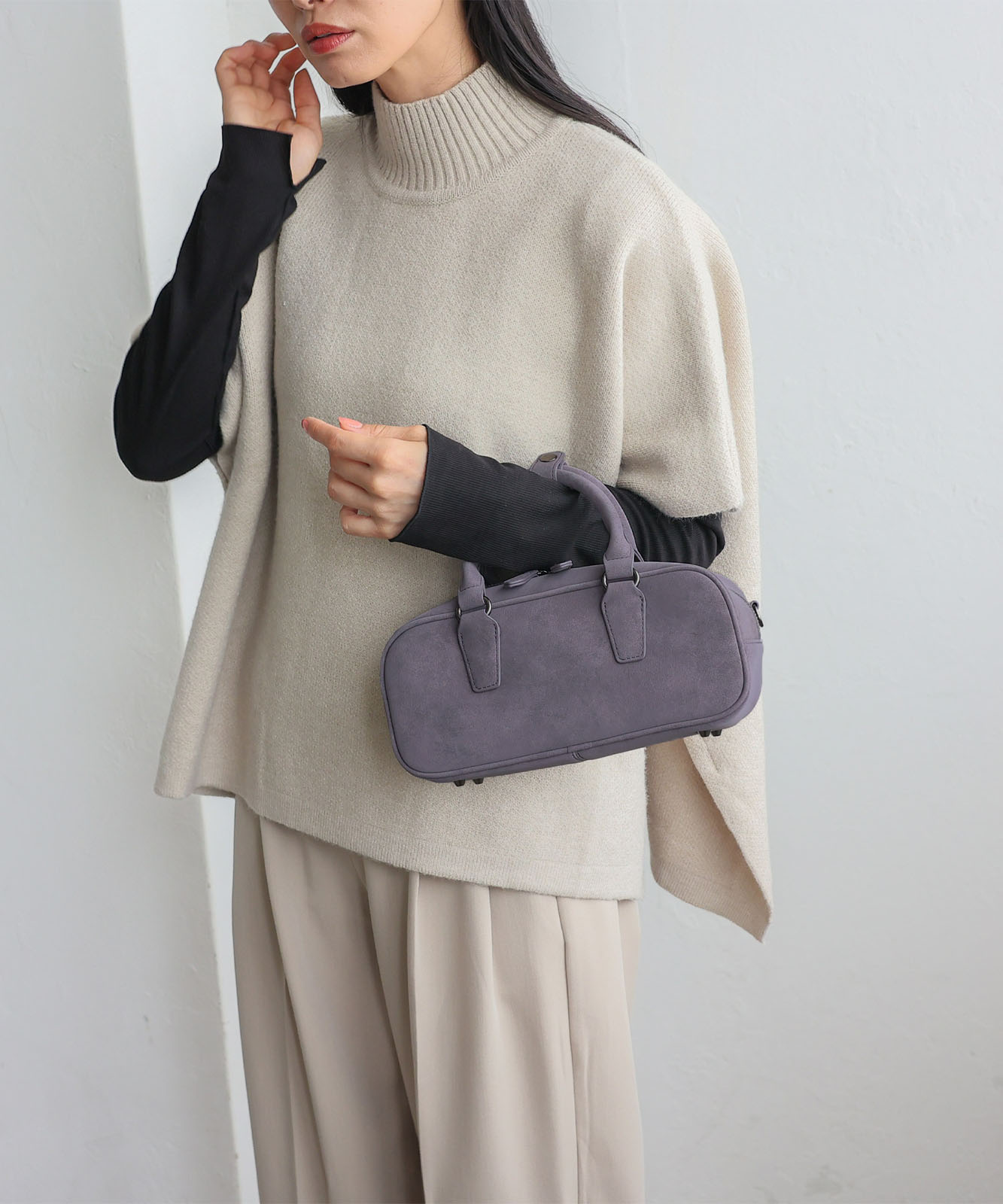 トレンドの横長フォルムにスエードタッチ生地を合わせたおしゃれなミニバッグ。