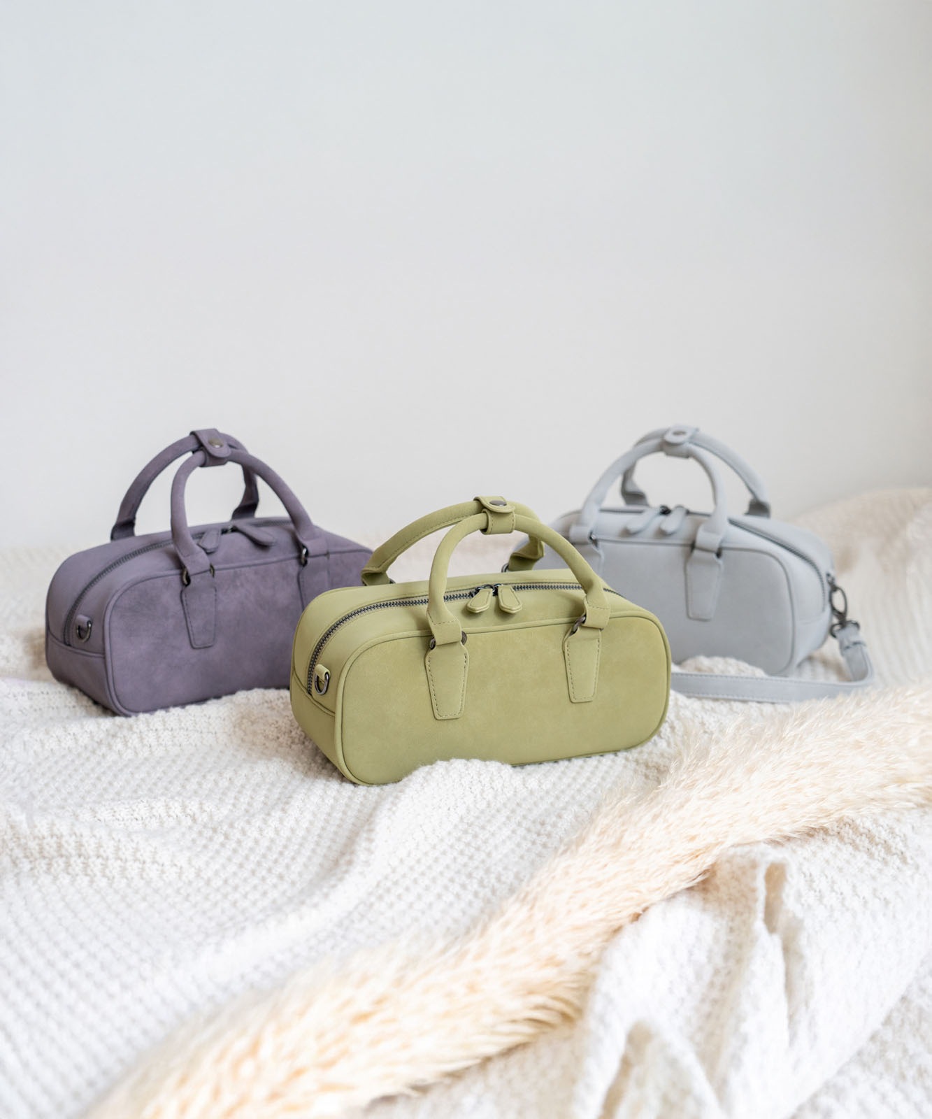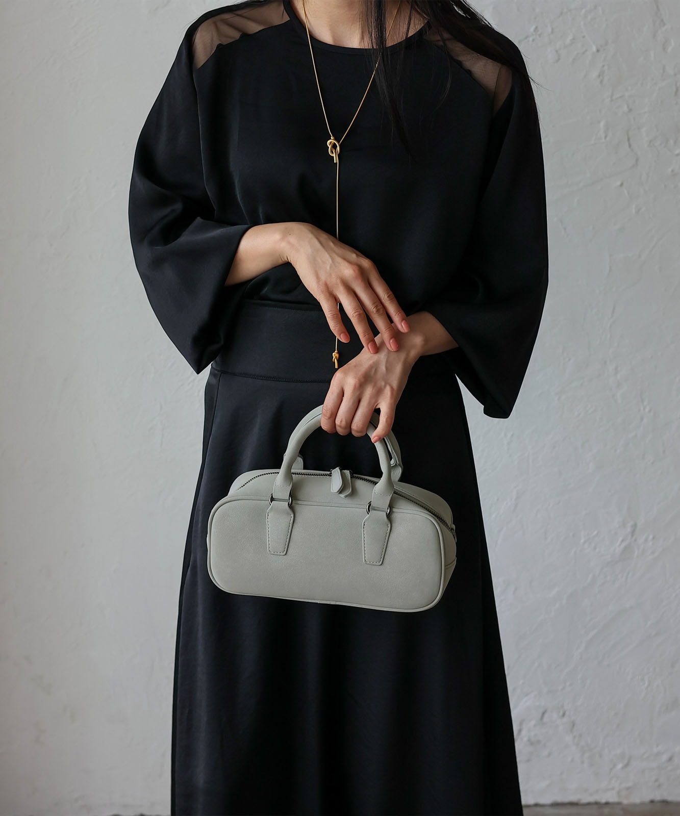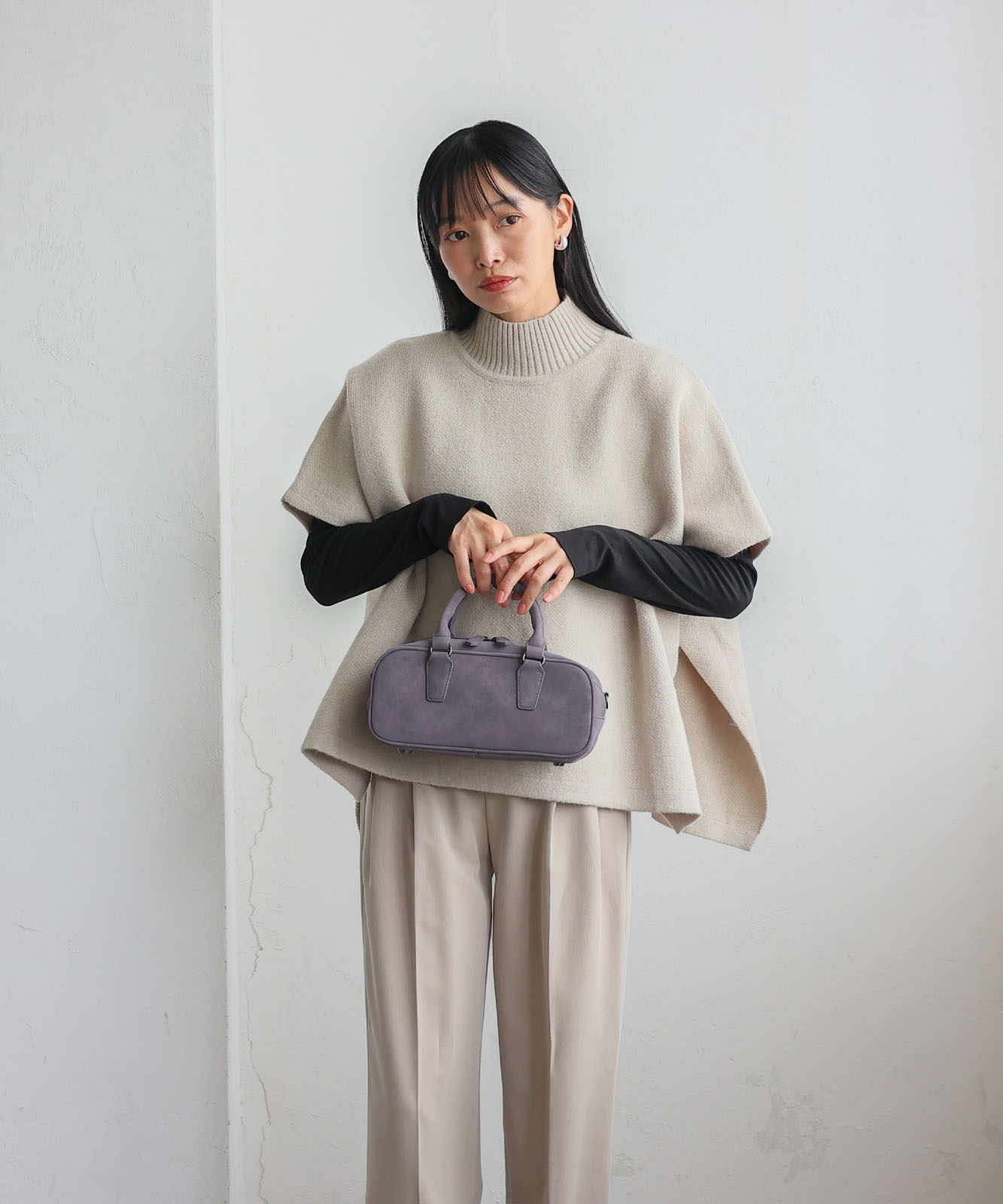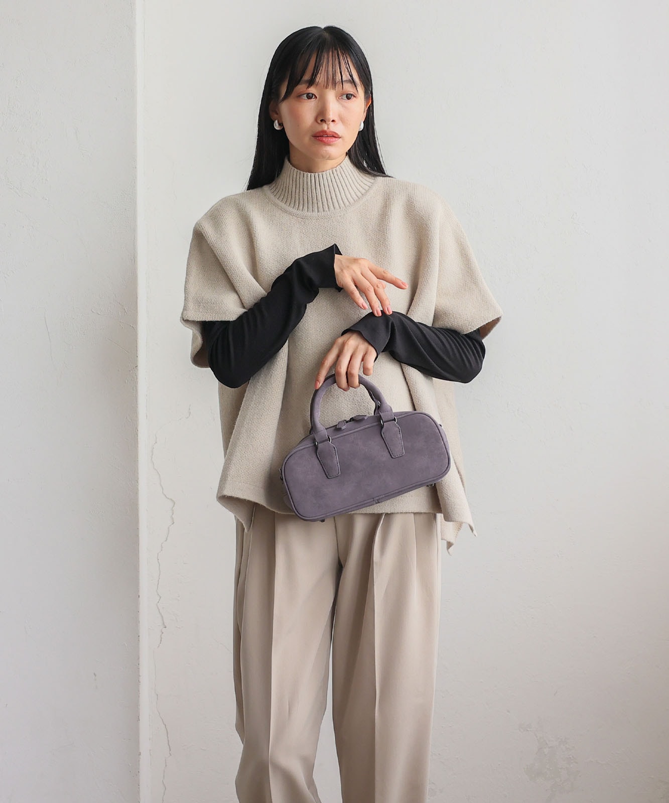トレンドの横長フォルムにスエードタッチ生地を合わせたおしゃれなミニバッグ。