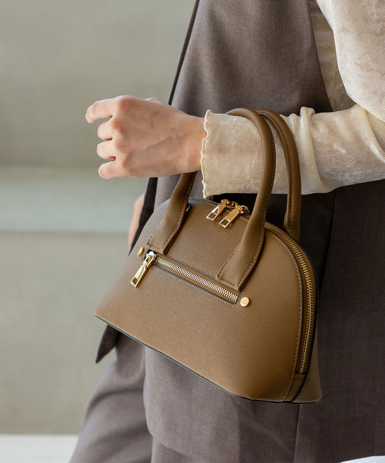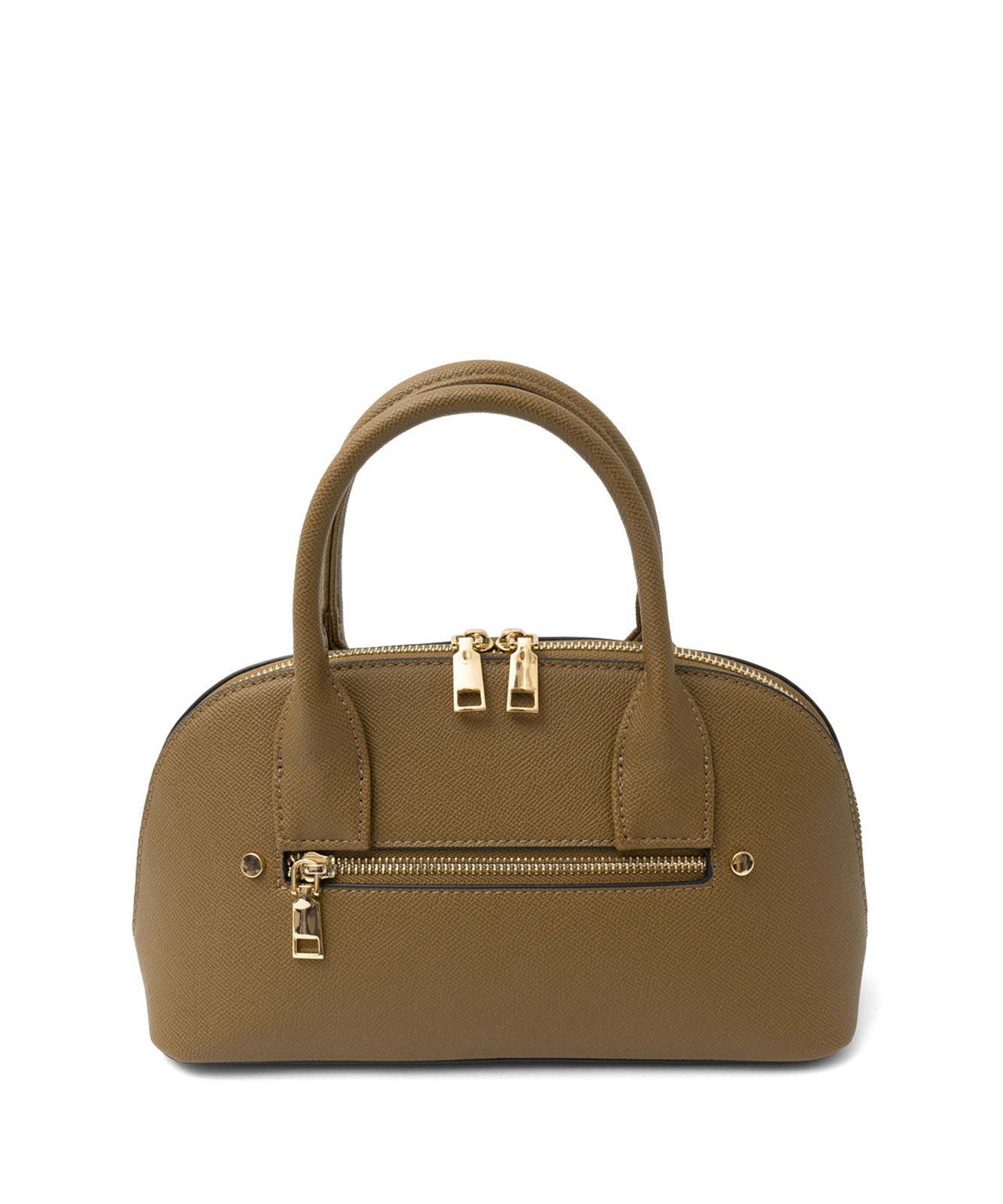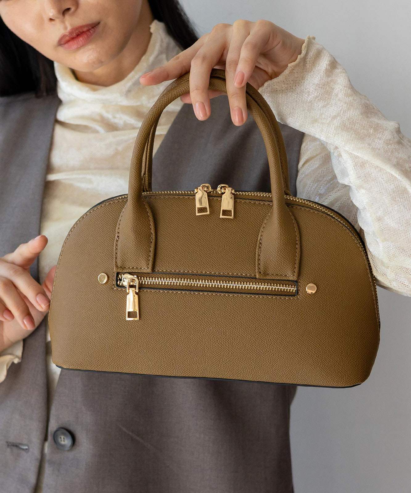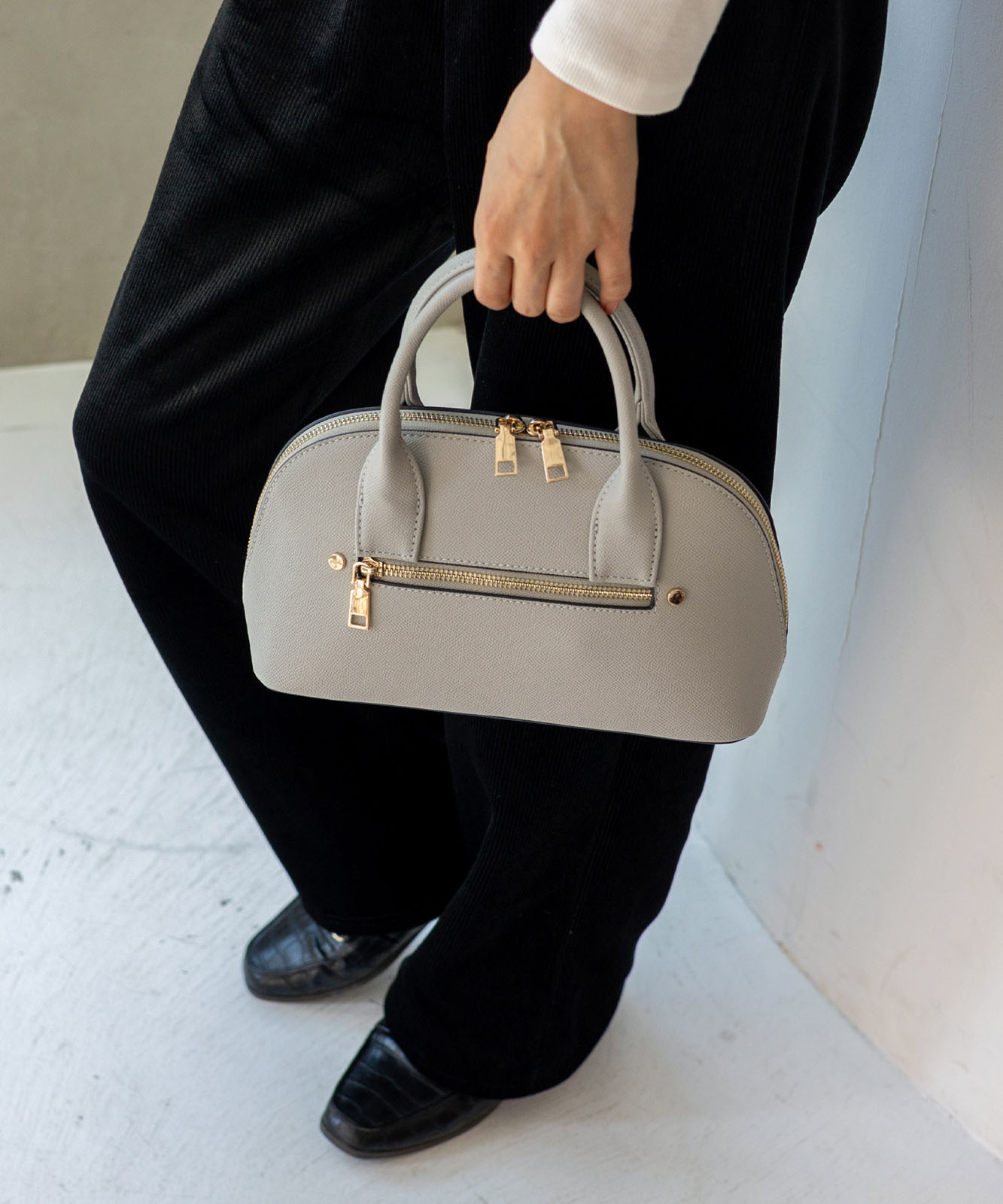 ころんとしたフォルムと上質感のある角シボ合皮が、持つだけで洗練された印象に。