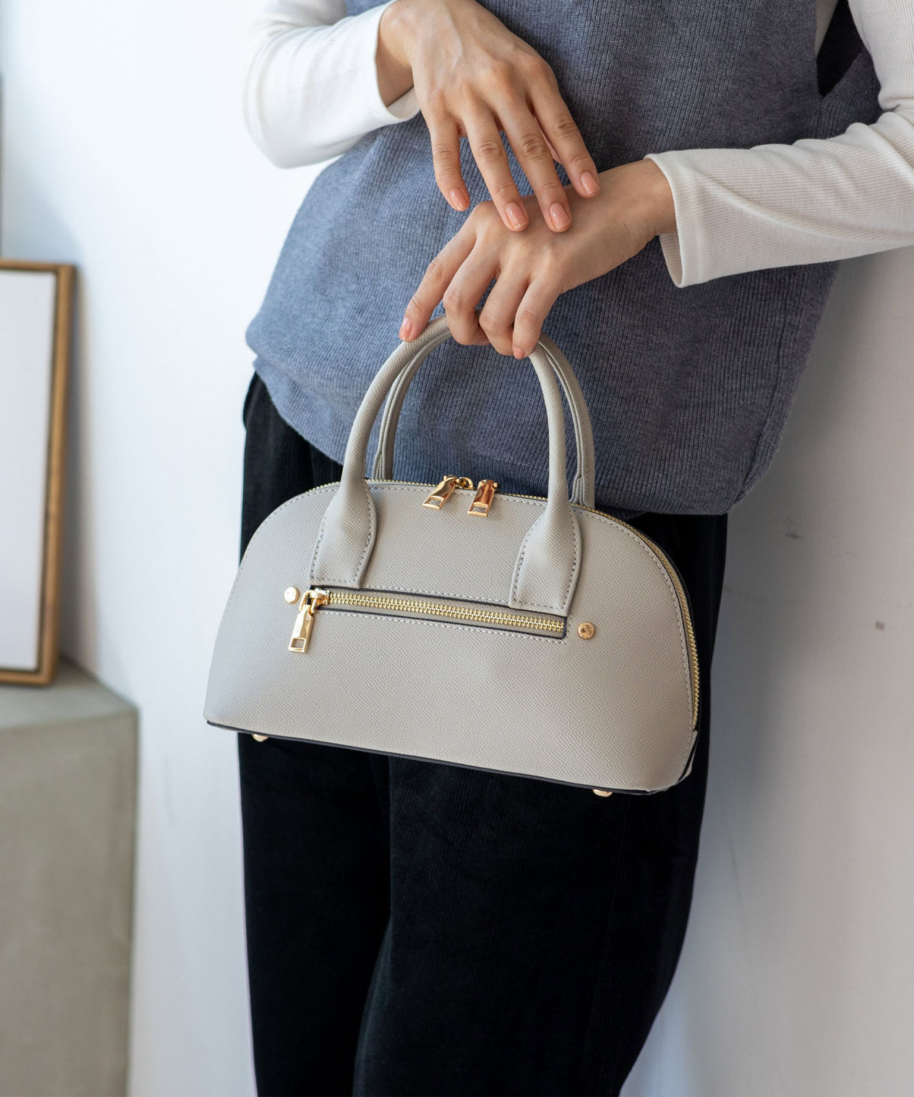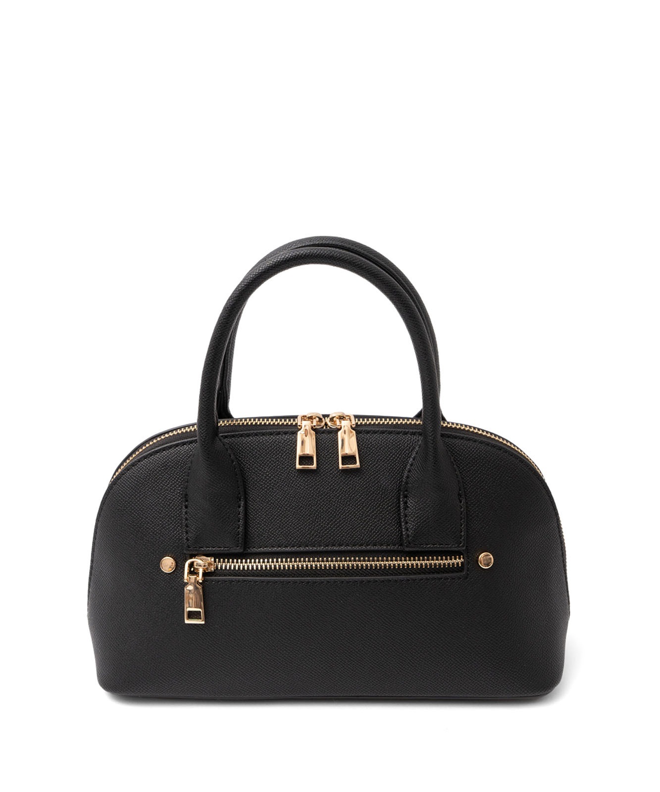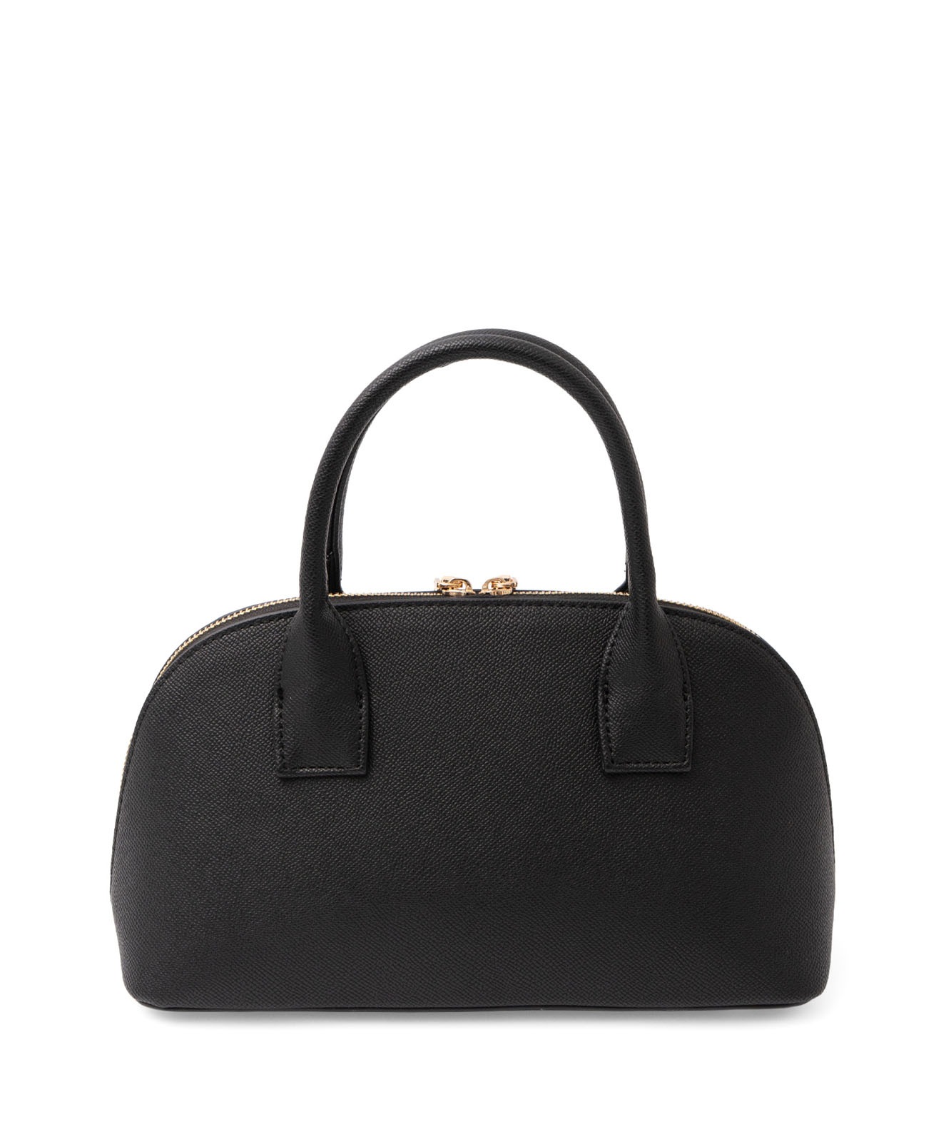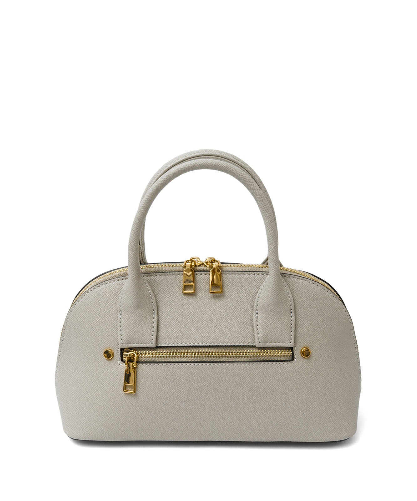 ころんとしたフォルムと上質感のある角シボ合皮が、持つだけで洗練された印象に。