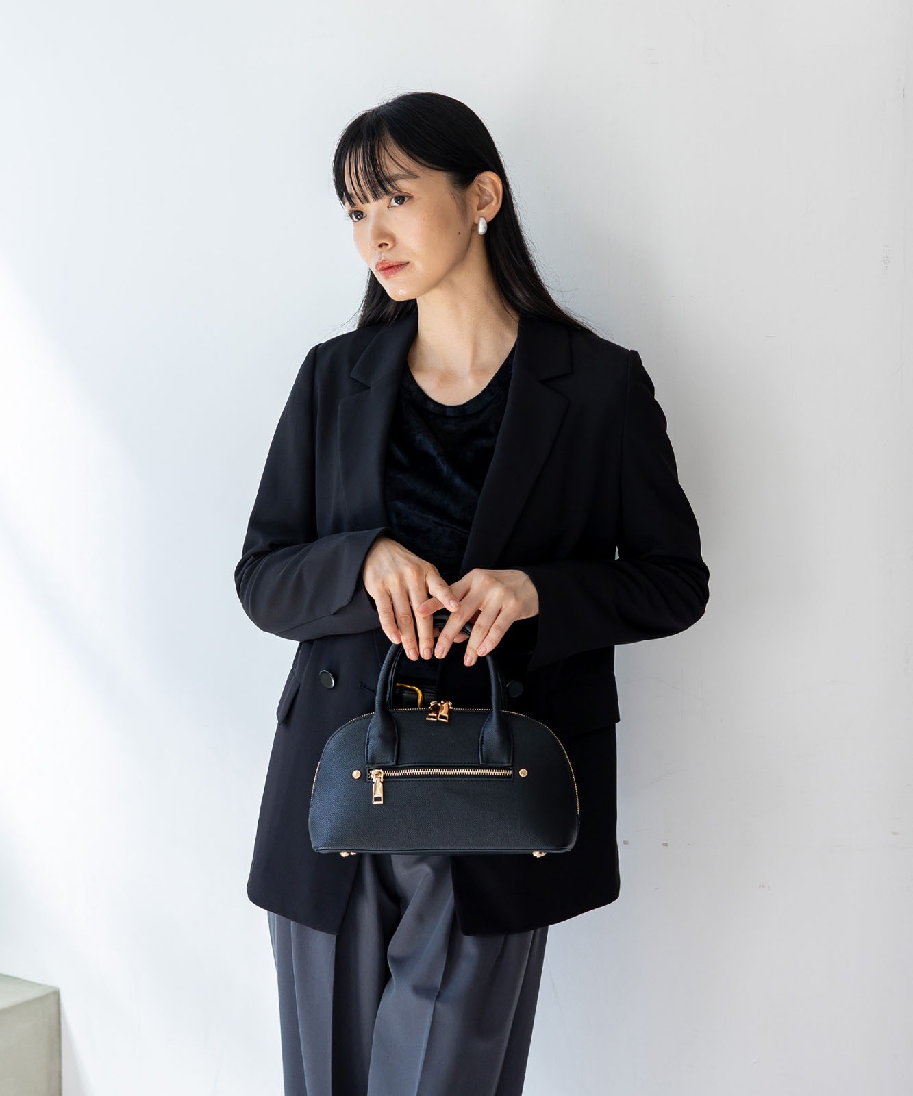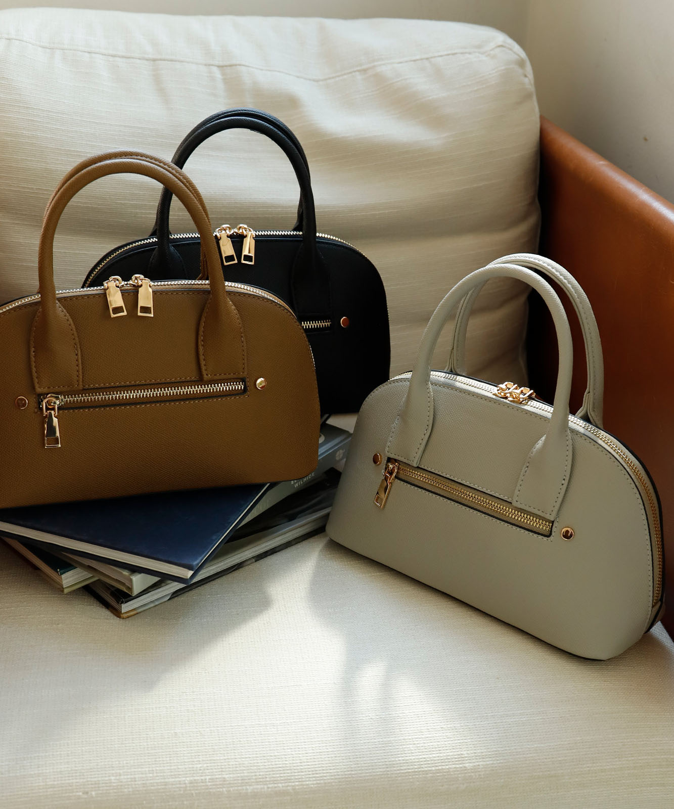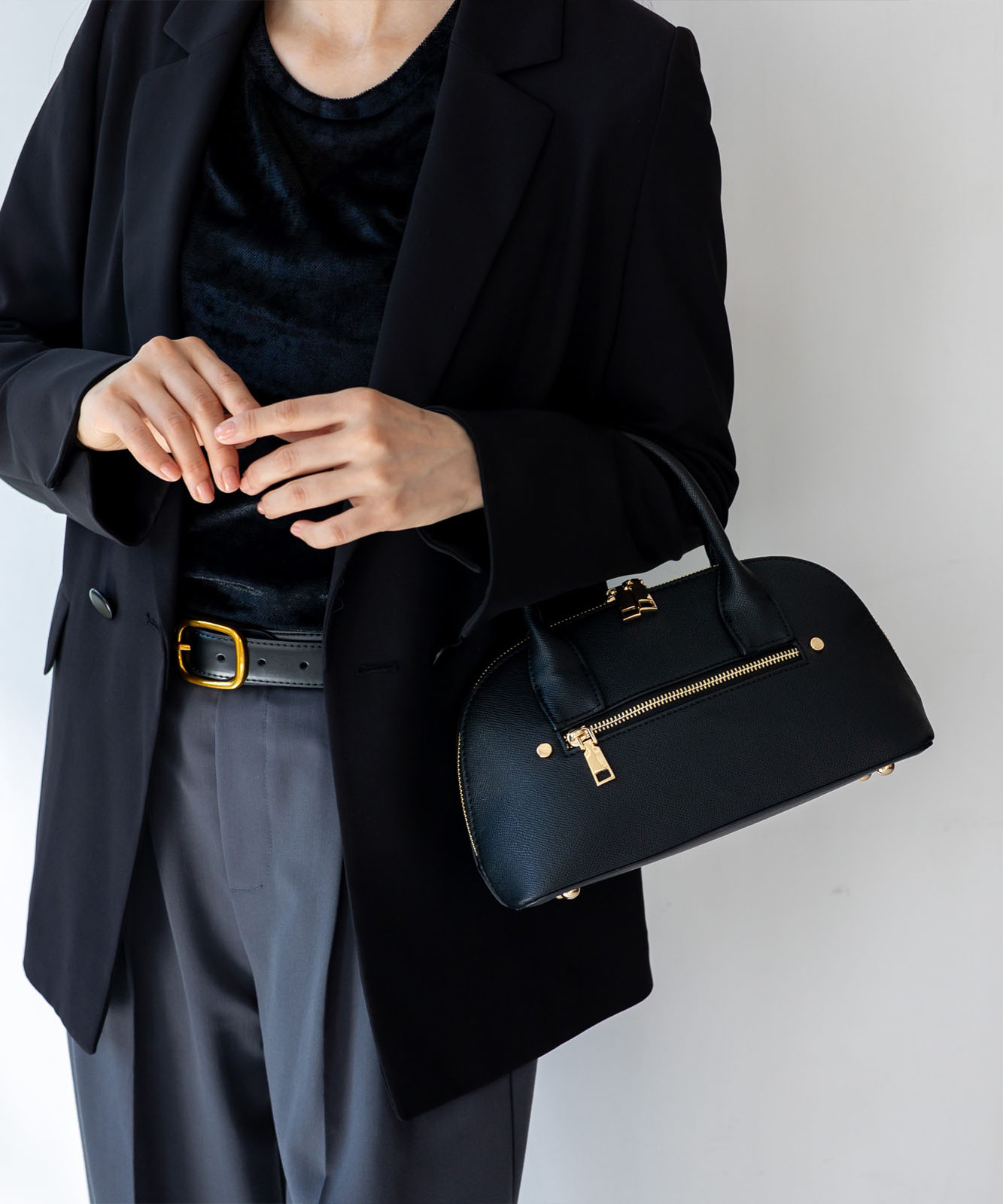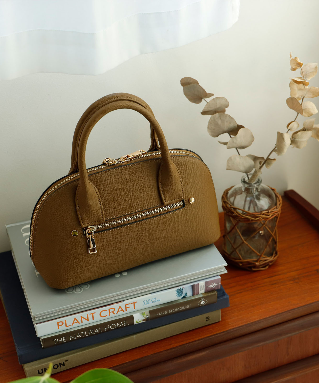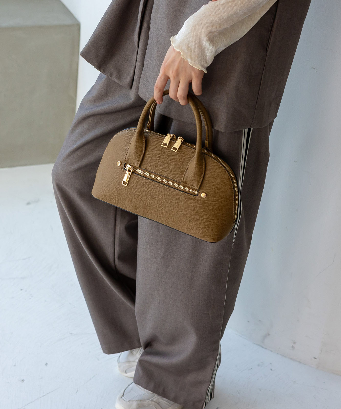 ころんとしたフォルムと上質感のある角シボ合皮が、持つだけで洗練された印象に。