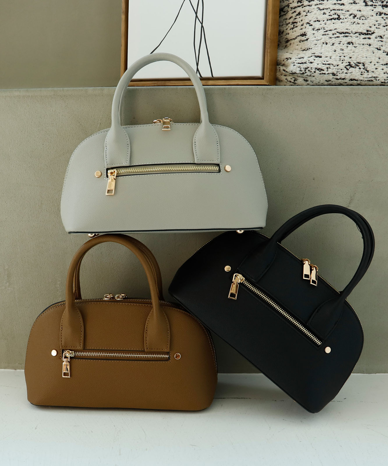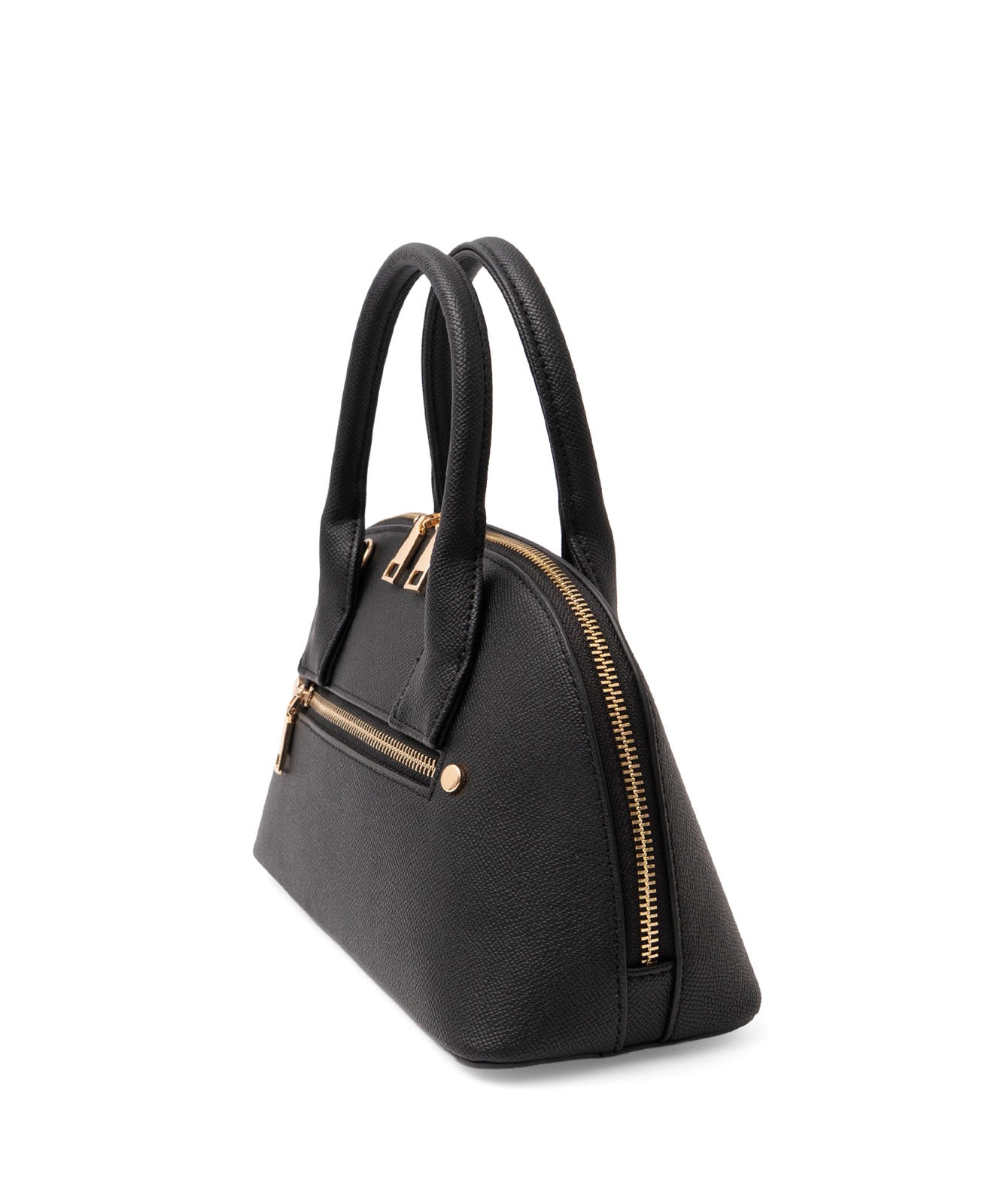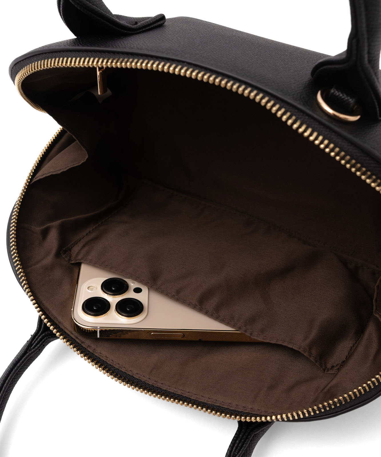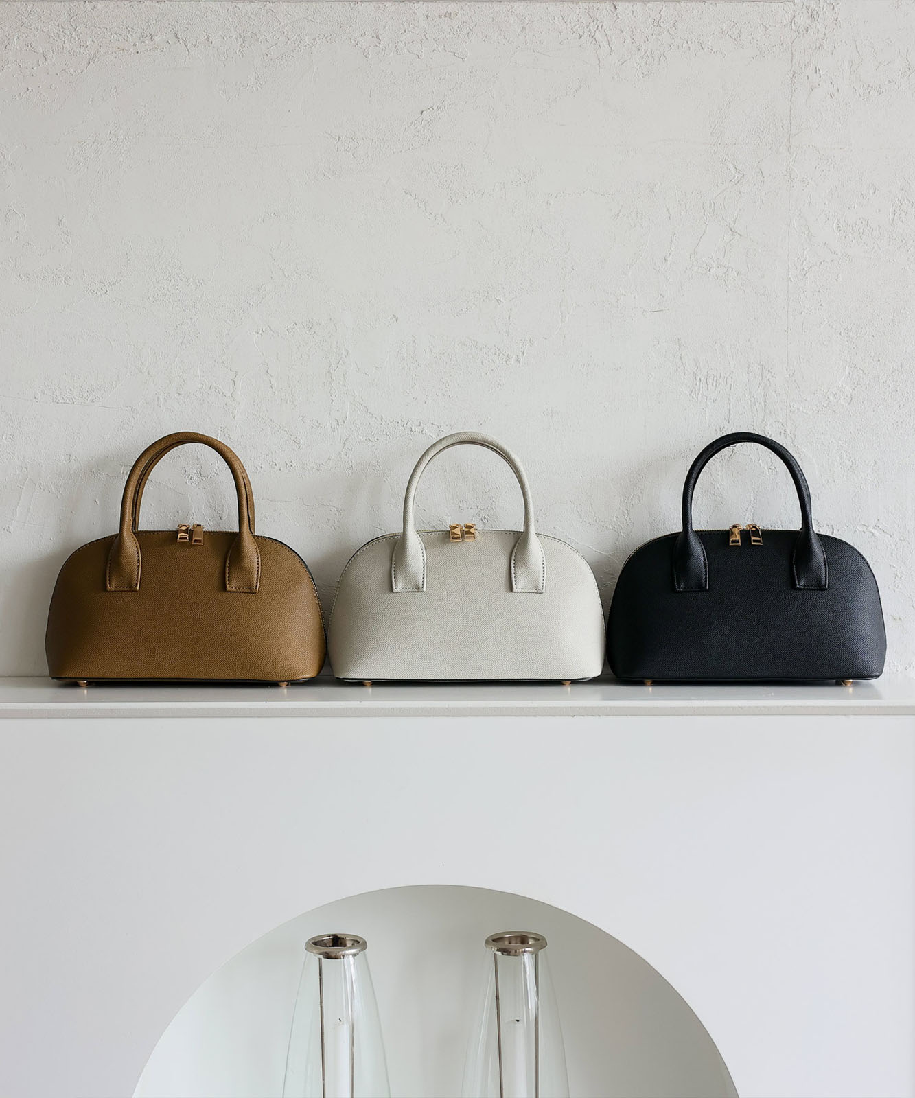 ころんとしたフォルムと上質感のある角シボ合皮が、持つだけで洗練された印象に。