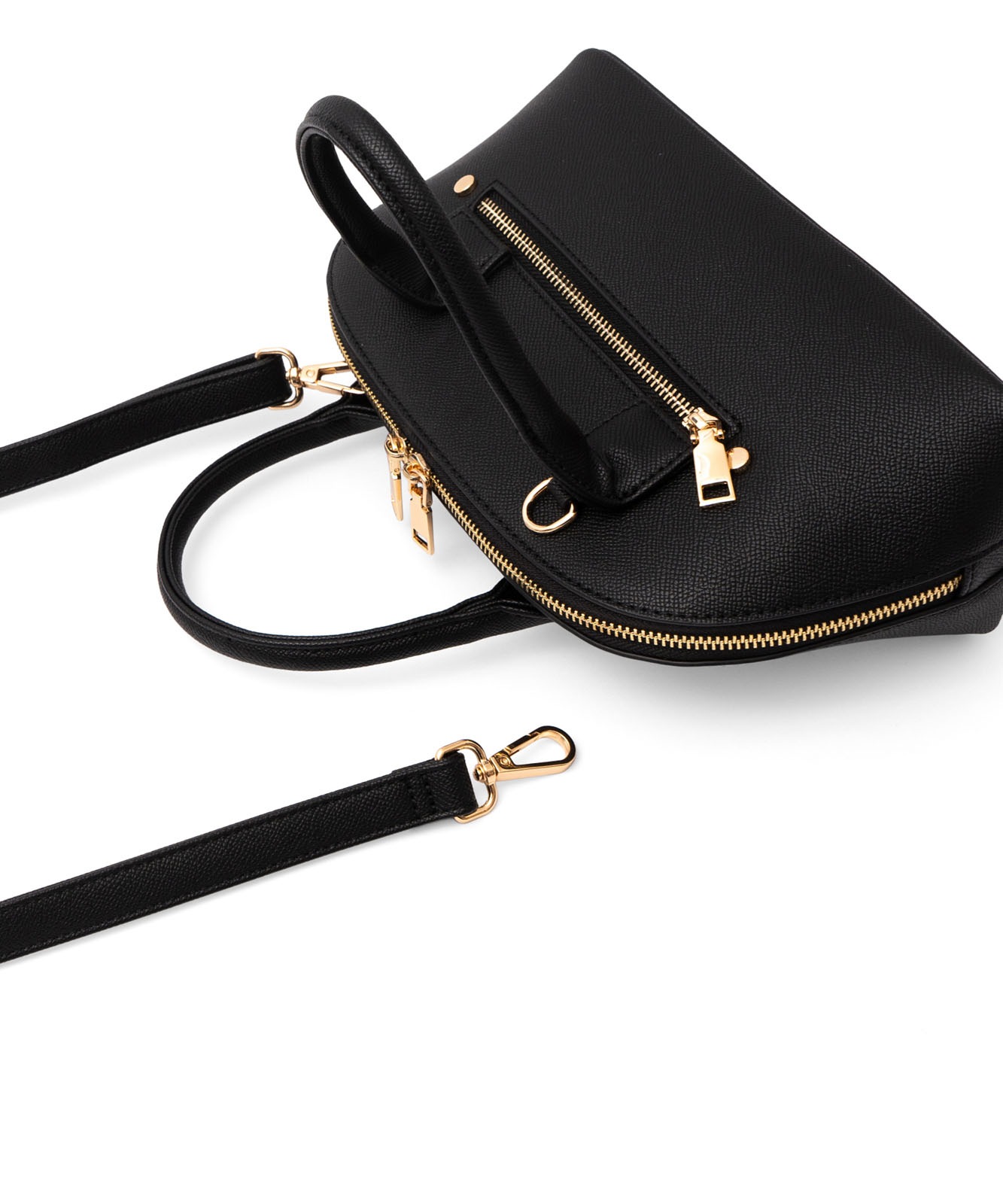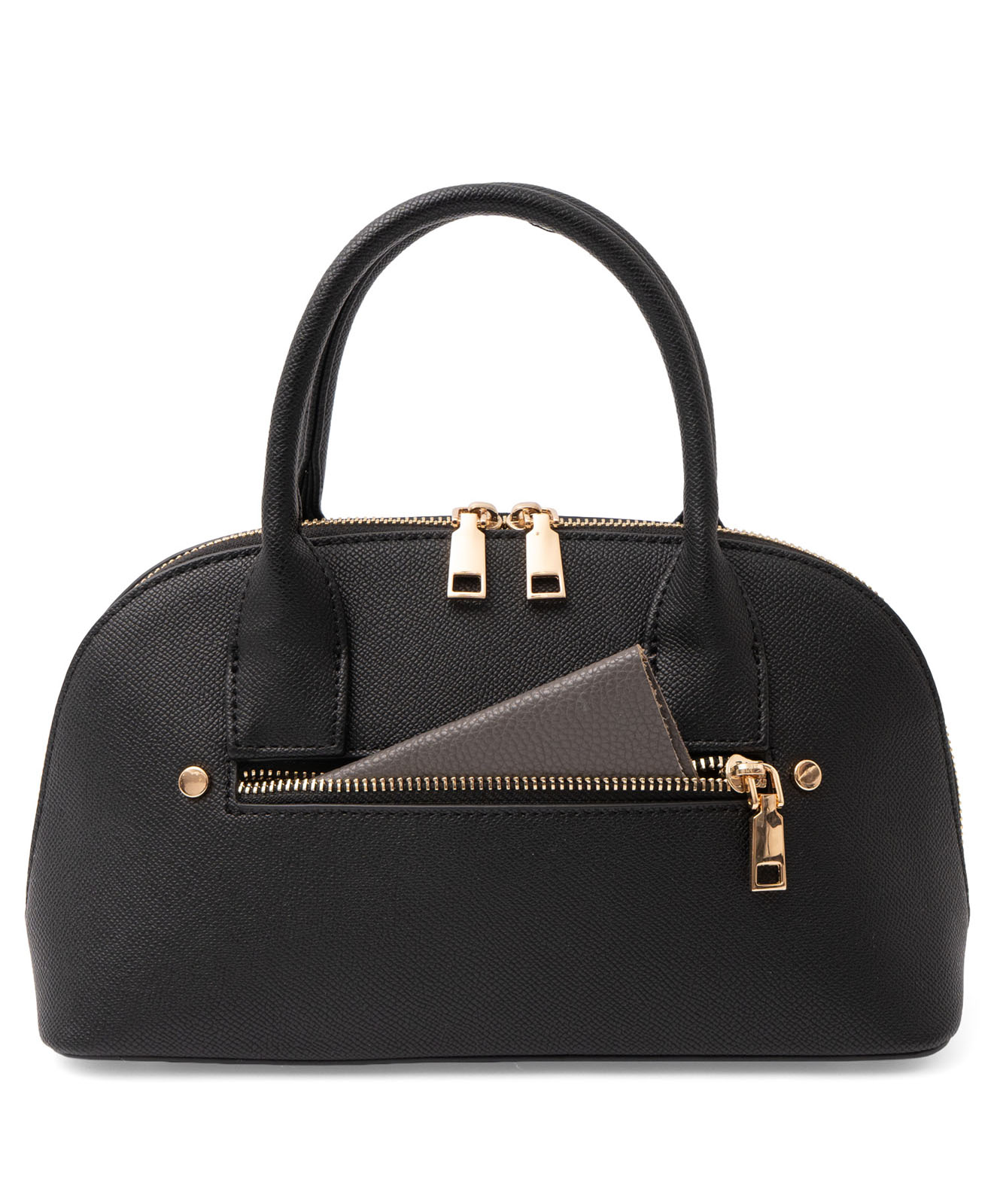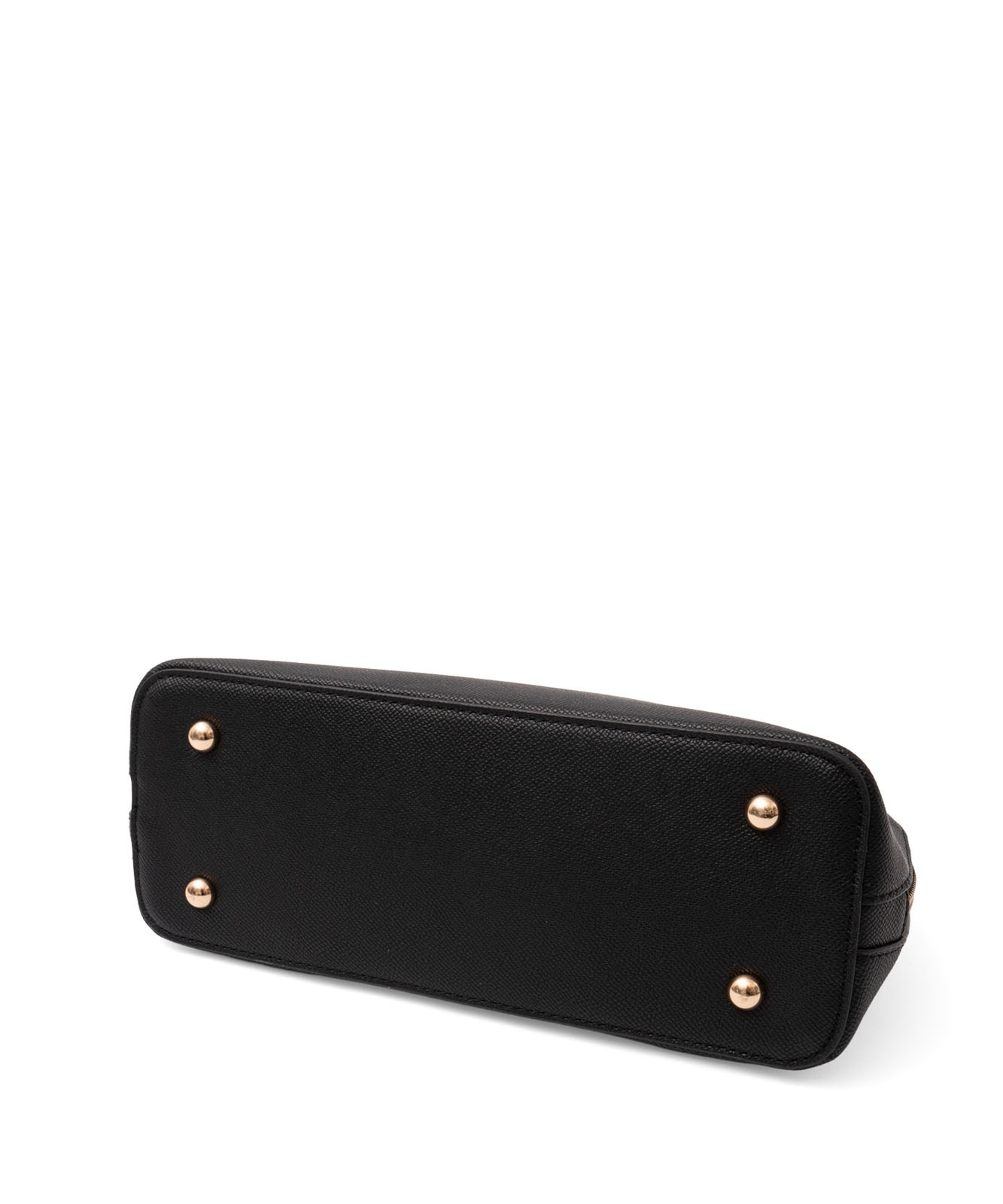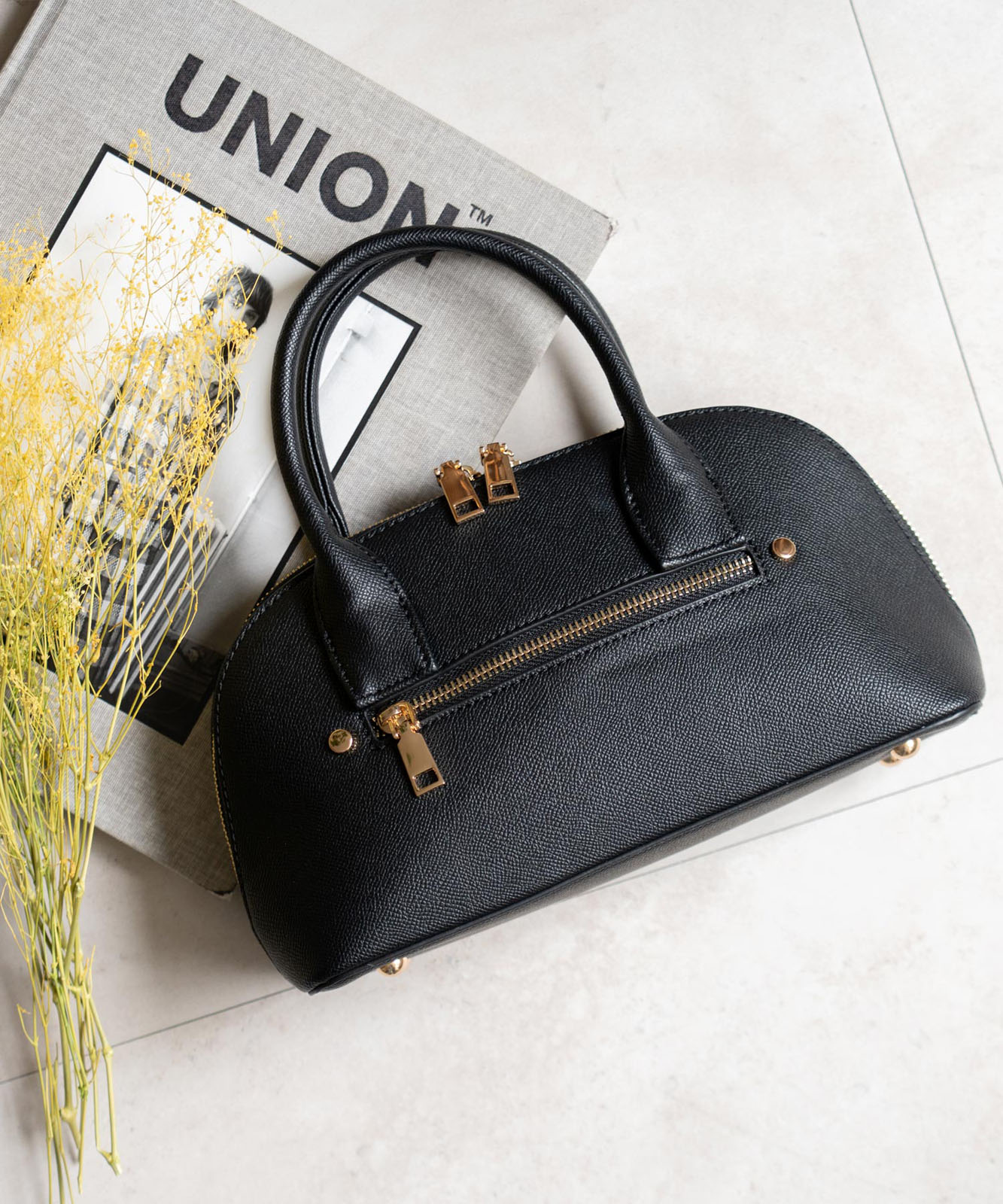 ころんとしたフォルムと上質感のある角シボ合皮が、持つだけで洗練された印象に。