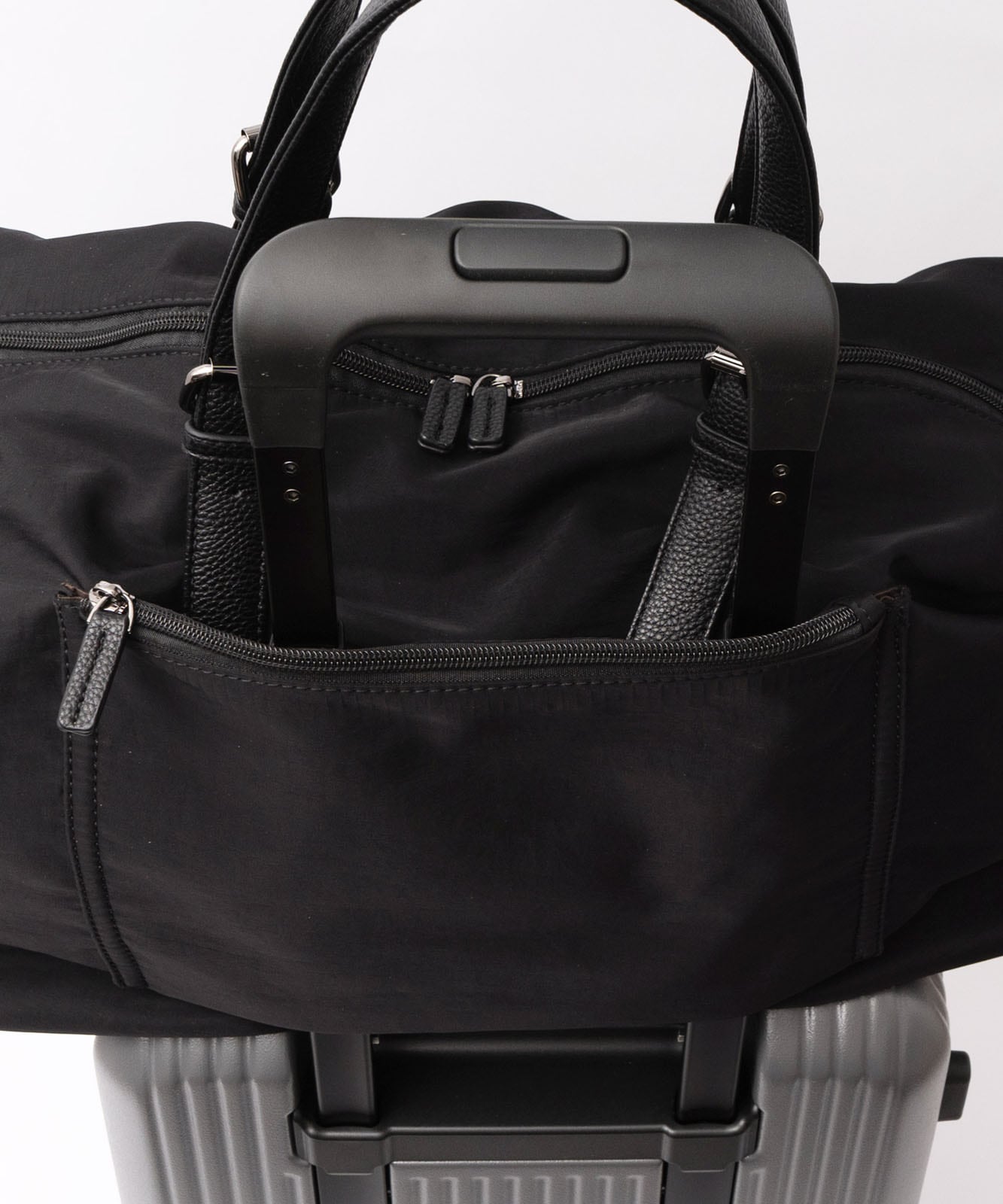 背面のポケットはキャリーバーが通せる仕様で、スーツケースに固定可能。