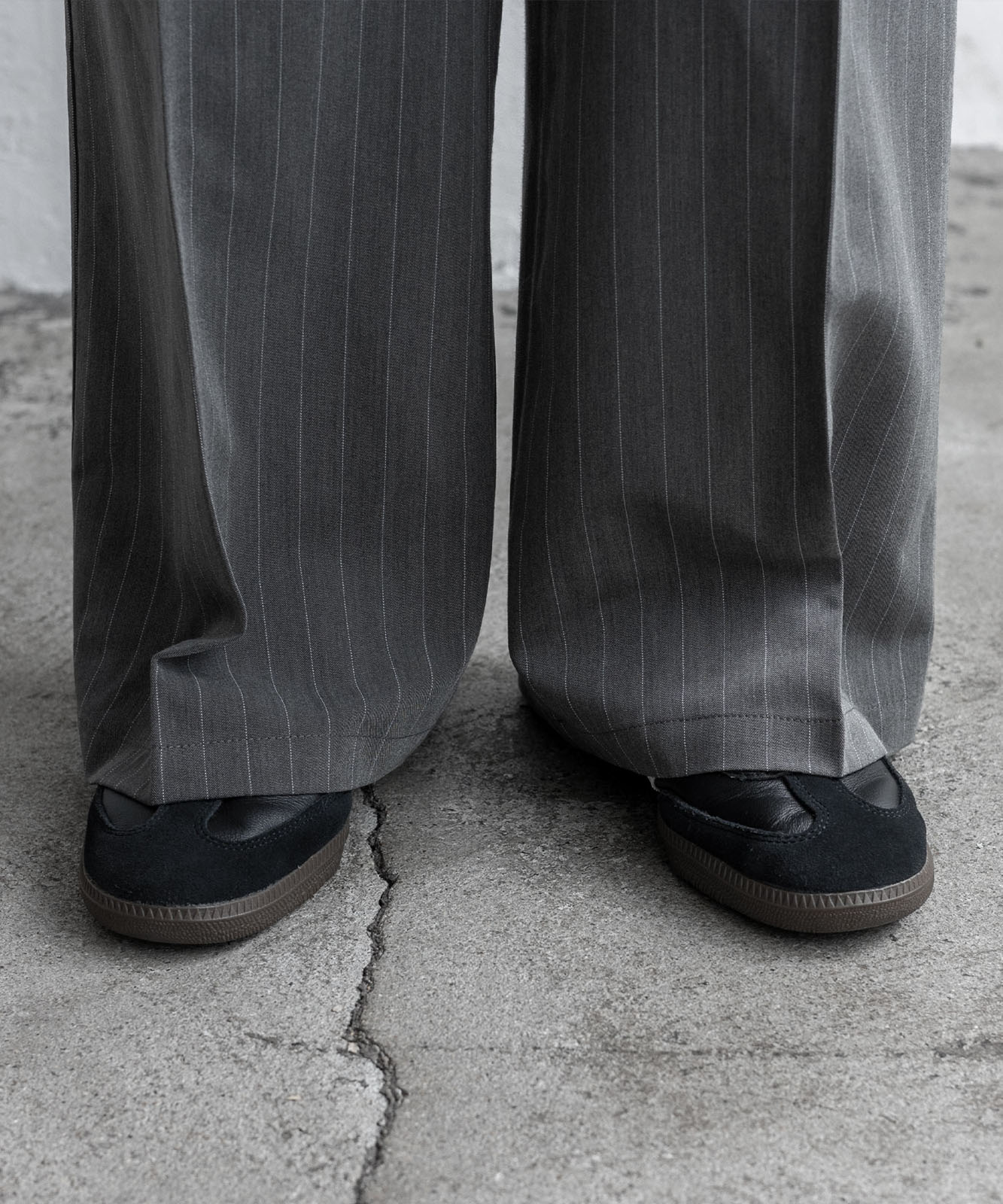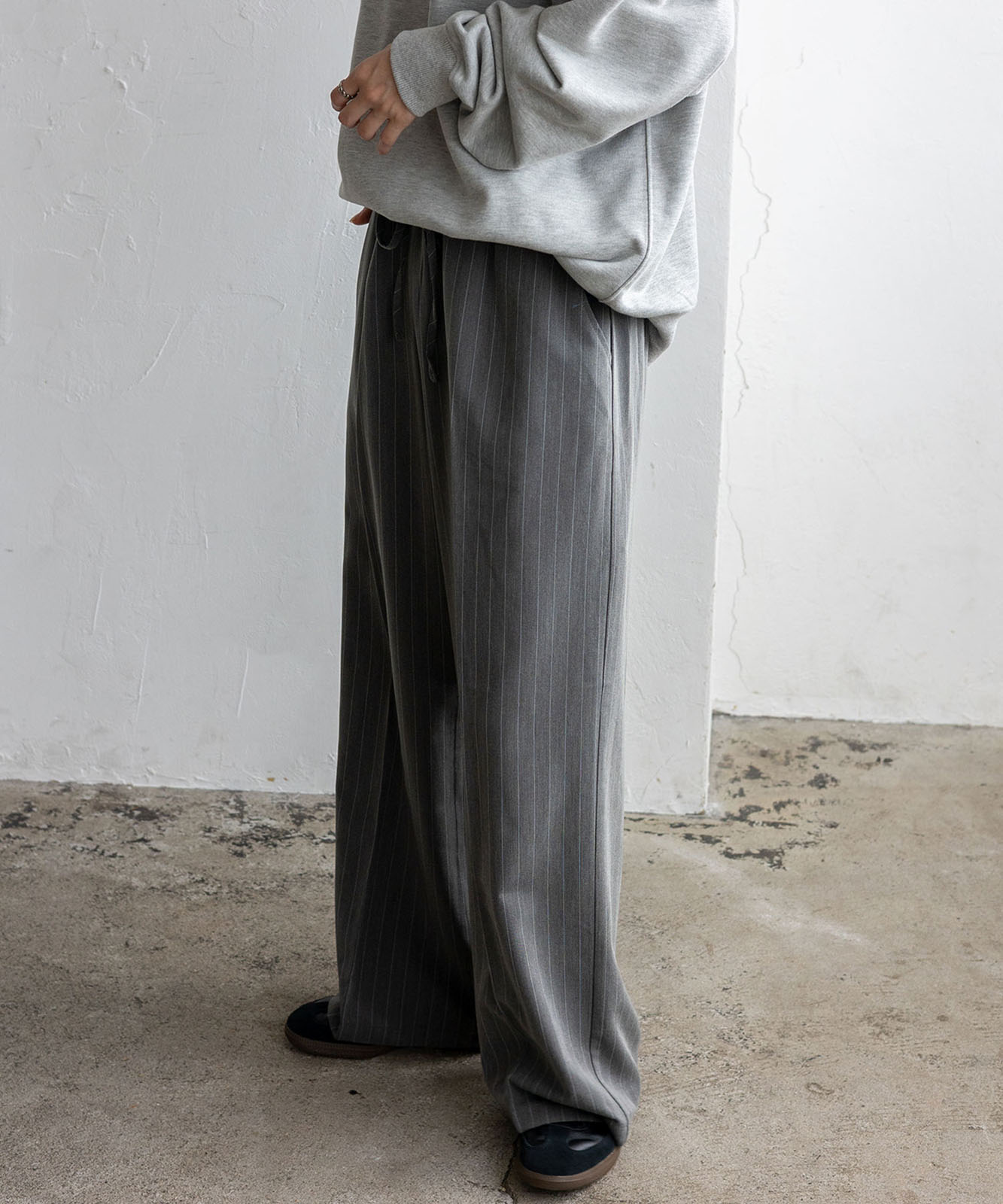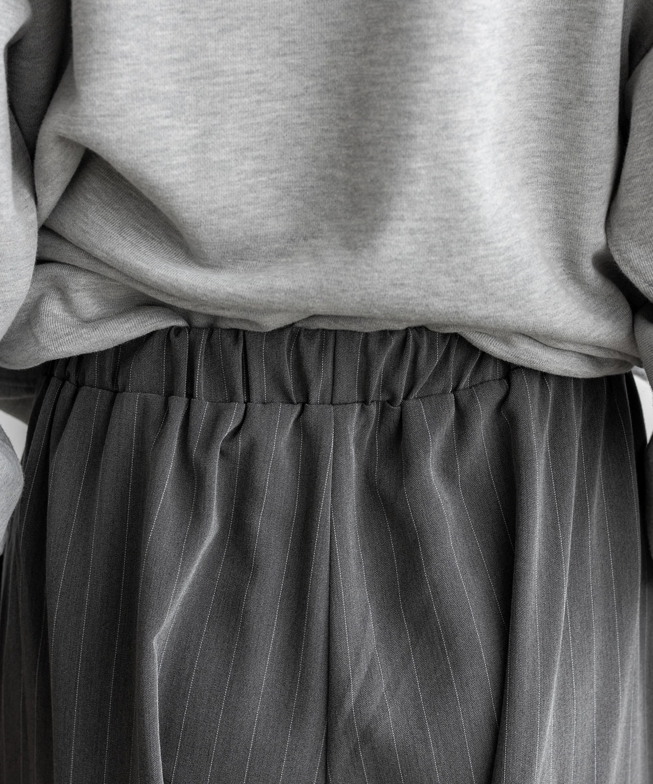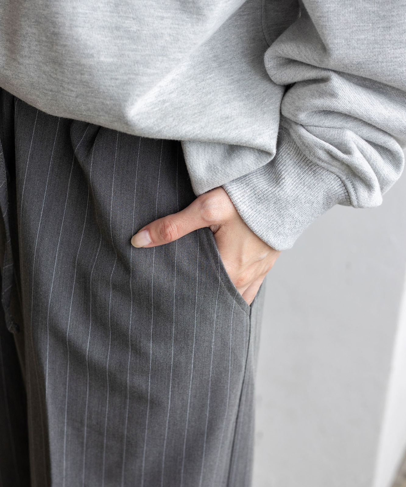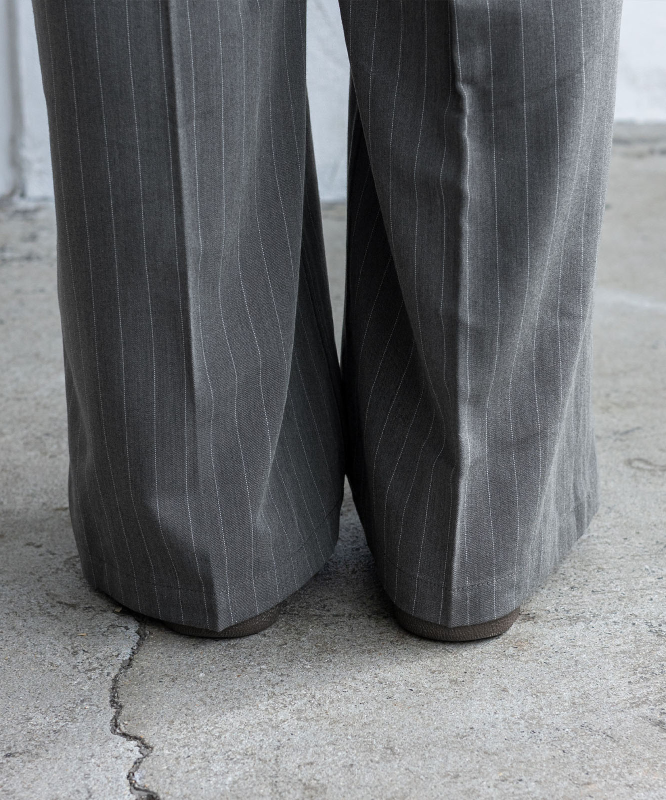 ピンストライプ柄のセンタープレスワイドパンツ。