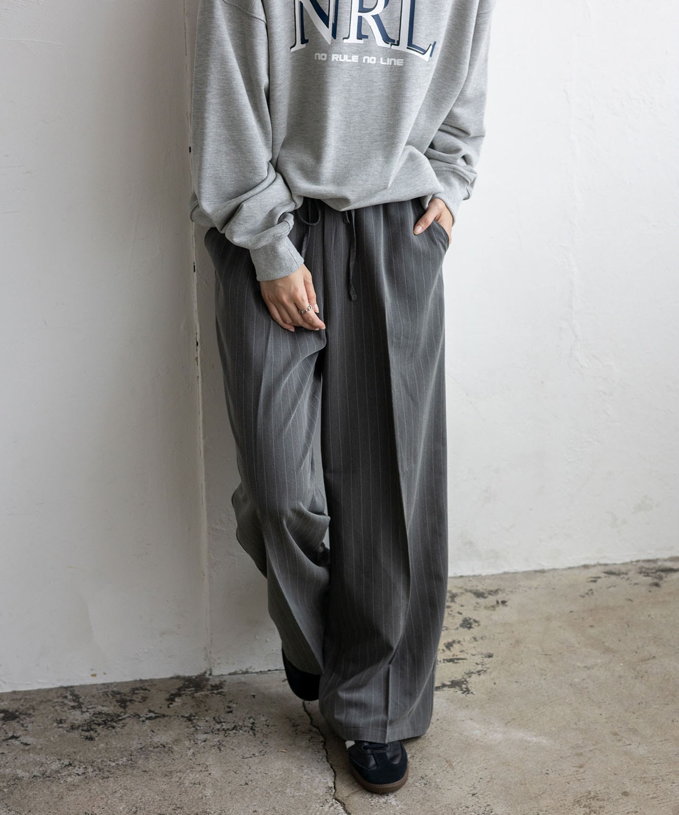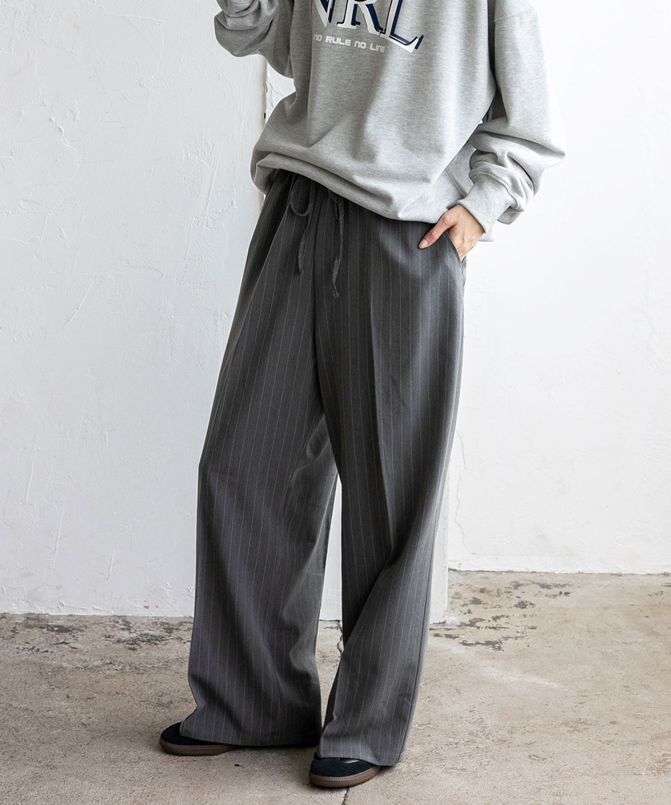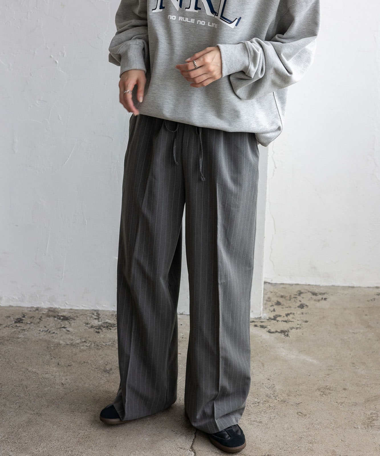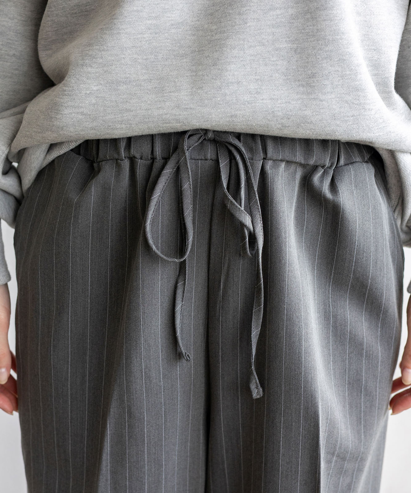ピンストライプ柄のセンタープレスワイドパンツ。