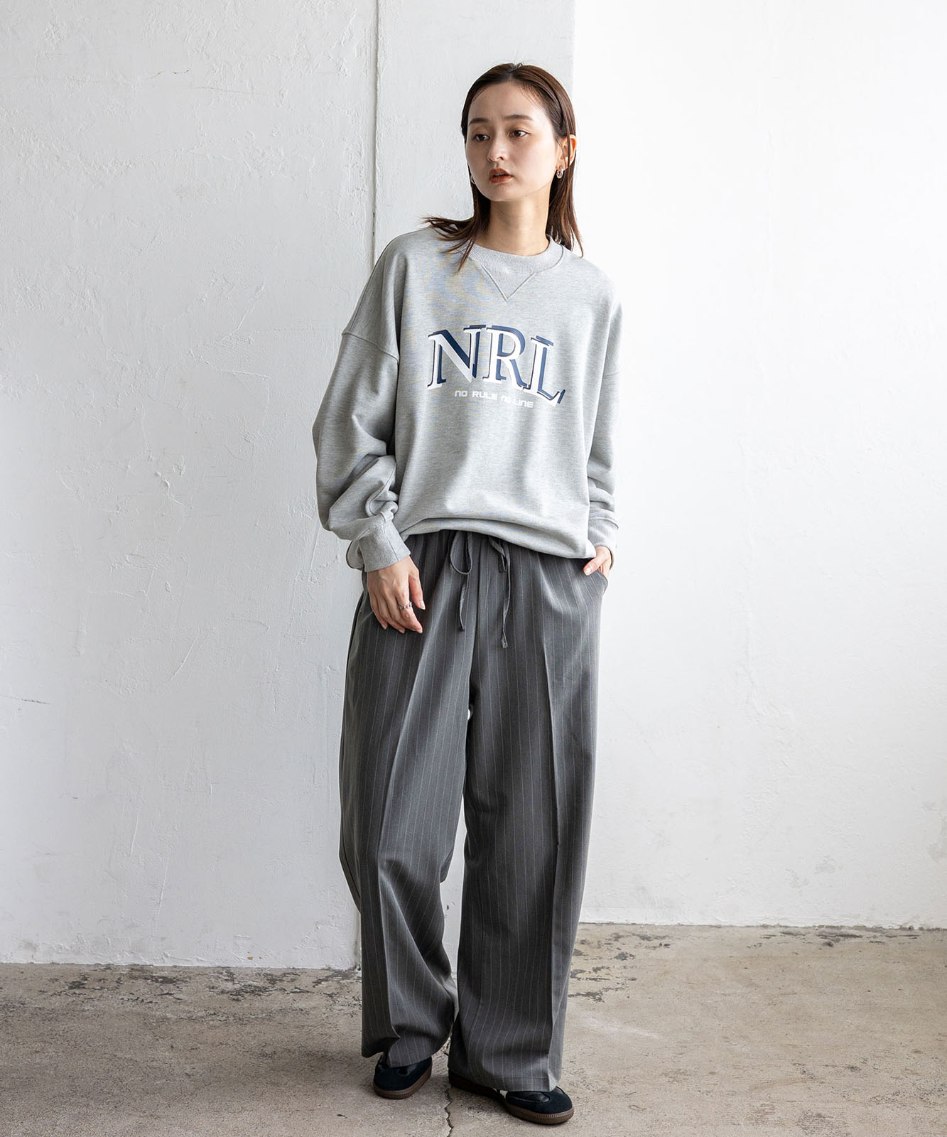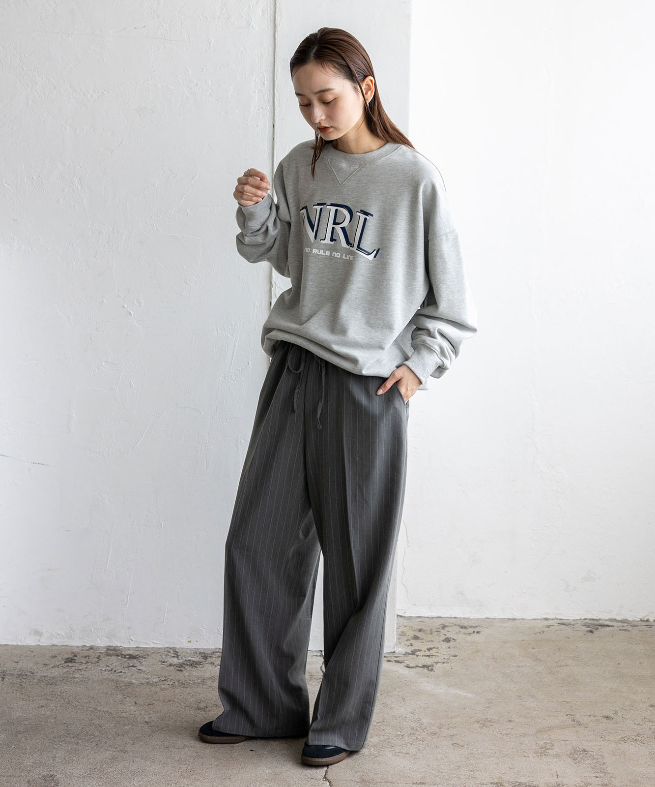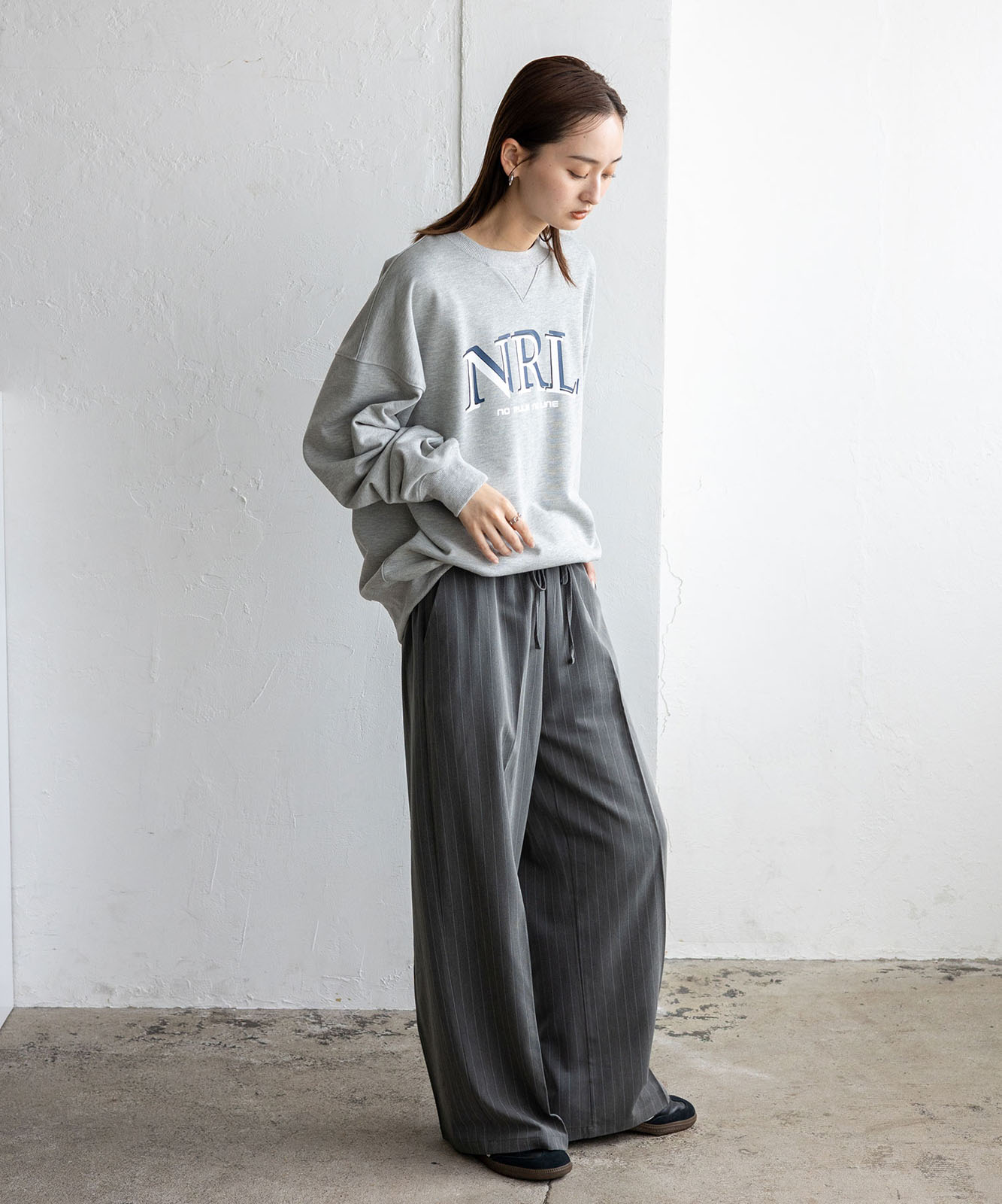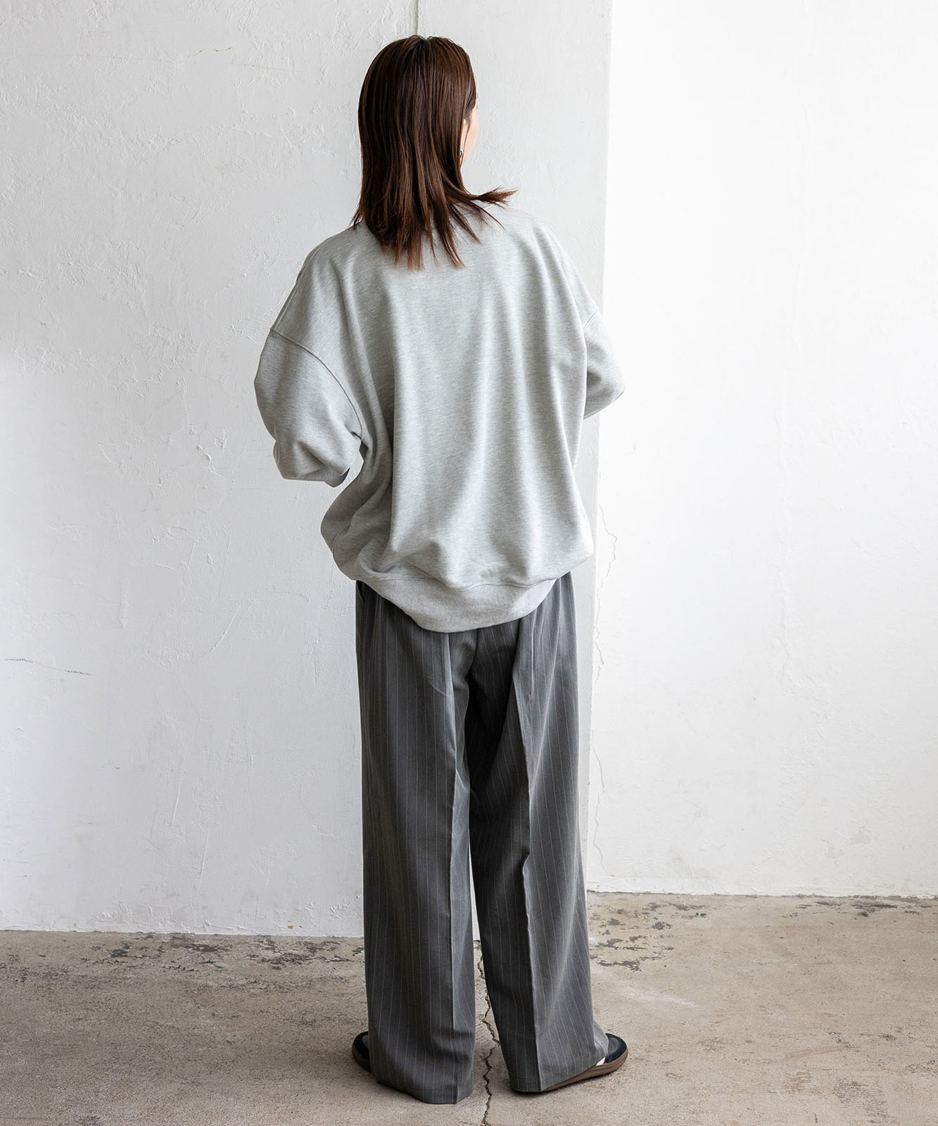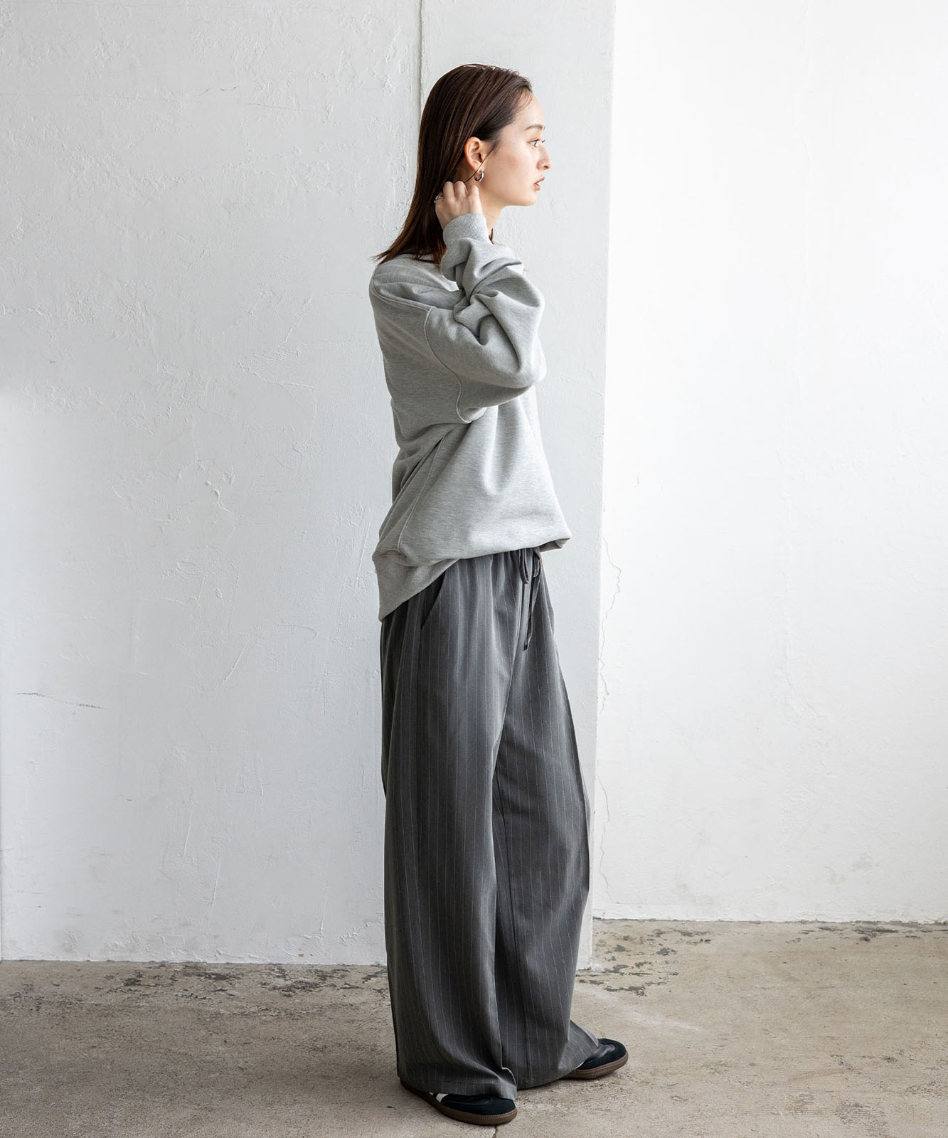 ピンストライプ柄のセンタープレスワイドパンツ。